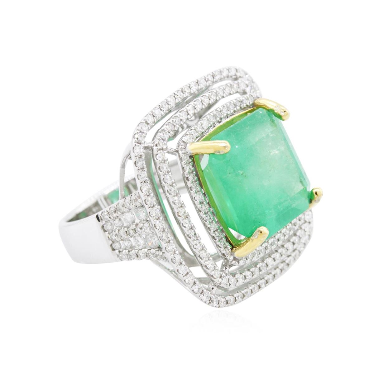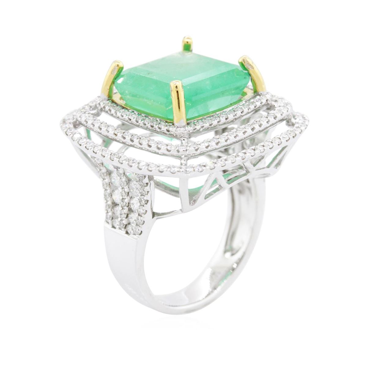 One electronically tested 14KT white and yellow gold ladies combination cast & assembled emerald and diamond ring with a flat shank with a bright polish finish. Identified with markings of "14K". Condition is new. Containing: One prong set emerald standard step cut natural emerald, measuring 12.72 x 12.18 x 8.40mm, approximate weight of 9.56ct., clarity is heavily included, type III, medium light, moderately strong, green color, (GIA G 4/4), cut is good. Two Hundred Sixteen prong set round brilliant cut diamonds, measuring 2.00 - 1.10 x 0.93mm (depth est.) approximate total weight of 216 Stones = 1.38ct. Clarity: SI-2 to I-2. Color: I - J, Cut is Good. Colored gemstones are presumed to have been subjected to commonly used enhancement processes. All diamonds and colored gemstones are graded in the mounting, unless otherwise stated total weight of Colored Stones 9.56ct. Total Weight of Diamonds 1.38ct. Total Weight of Ring 9.50 grams. GGL Appraised at $24,110.00.