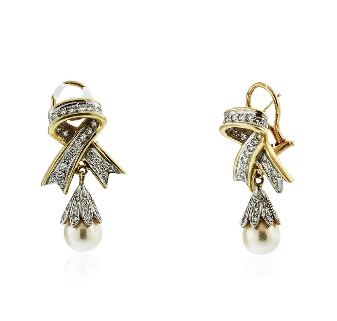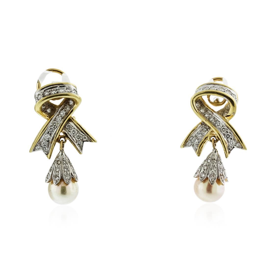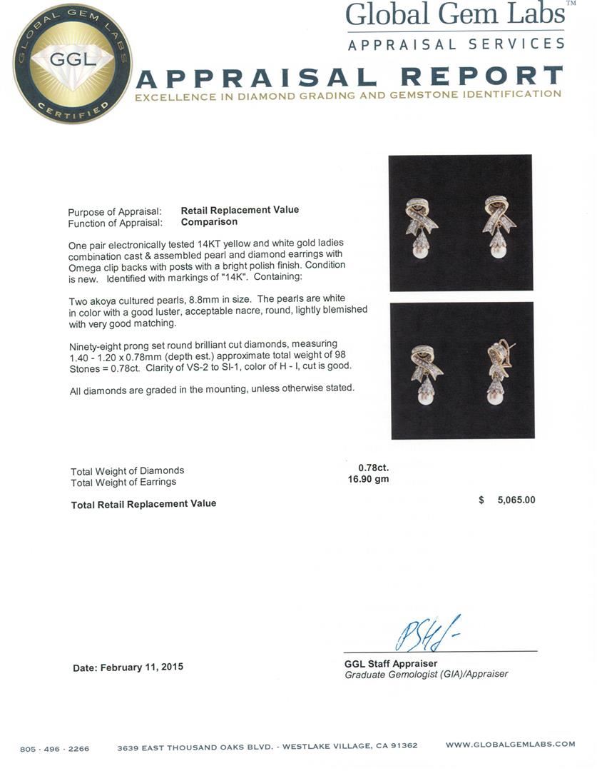 One pair electronically tested 14KT yellow and white gold ladies combination cast & assembled pearl and diamond earrings with Omega clip backs with posts with a bright polish finish. Identified with markings of "14K". Condition is new. Containing: Two akoya cultured pearls, 8.8mm in size. The pearls are white in color with a good luster, acceptable nacre, round, lightly blemished. Ninety-Eight prong set round brilliant cut diamonds, measuring 1.40 - 1.20 x 0.78mm (depth est.) approximate total weight of 98 Stones = 0.78ct. Clarity: VS-2 to SI-1. Color: H - I, Cut is Good. All diamonds are graded in the mounting, unless otherwise stated. Total Weight of Diamonds 0.78ct. Total Weight of Earrings 16.90 grams. GGL Appraised at $5,065.00.
