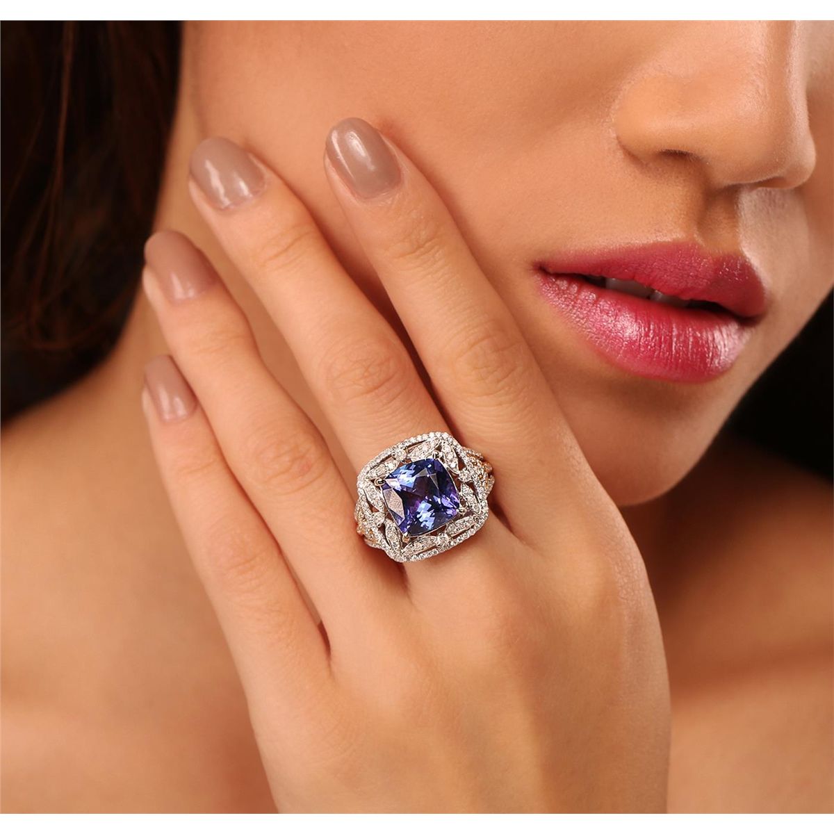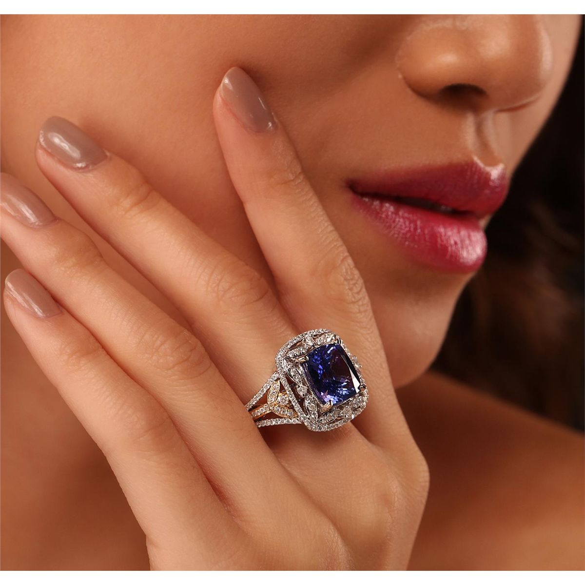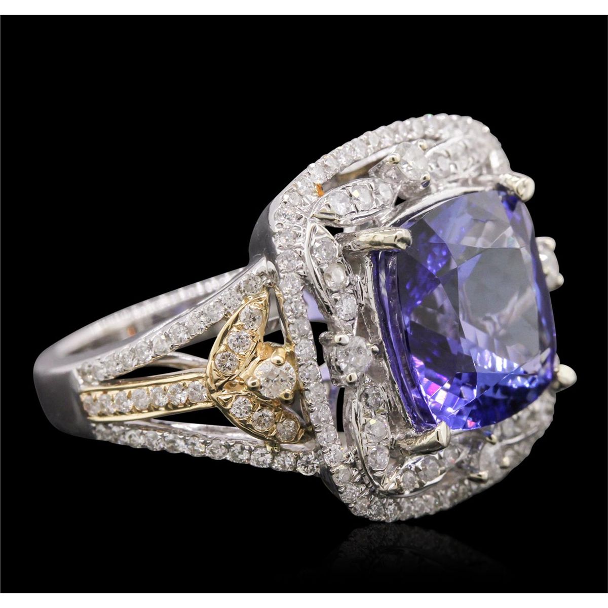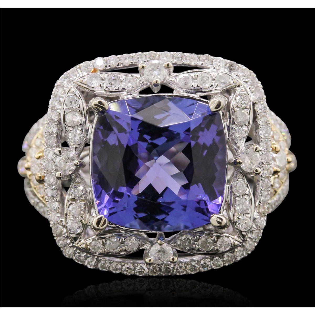 One electronically tested 14KT white and yellow gold Ladies cast ring with a bright polish finish. Condition is new. Identified with markings of "14K". Containing: One prong set square cushion modified brilliant cut natural tanzanite, measuring 11.00 x 11.00 x 6.80mm, approximate weight of 6.84ct., clarity is eye clean, type I, medium, very slightly grayish, bluish violet color, (GIA bV 5/3), cut is very good. Colored gemstones are presumed to have been subjected to commonly used color/clarity enhancement processes. One Hundred Fifty-Nine prong set round brilliant cut diamonds, measuring 1.80 - 1.30 x 0.93mm (depth est.) approximate. Total Weight of 159 Stones = 1.07ct. Clarity: I-1 to I-2. Color: H - I, Cut is Good. Total Weight of Colored Stones 6.84ct. Total Weight of Diamonds 1.07ct. Total Weight of Ring 9.90 grams. GGL Appraised at $14,225.00.