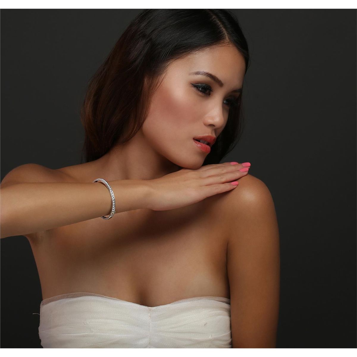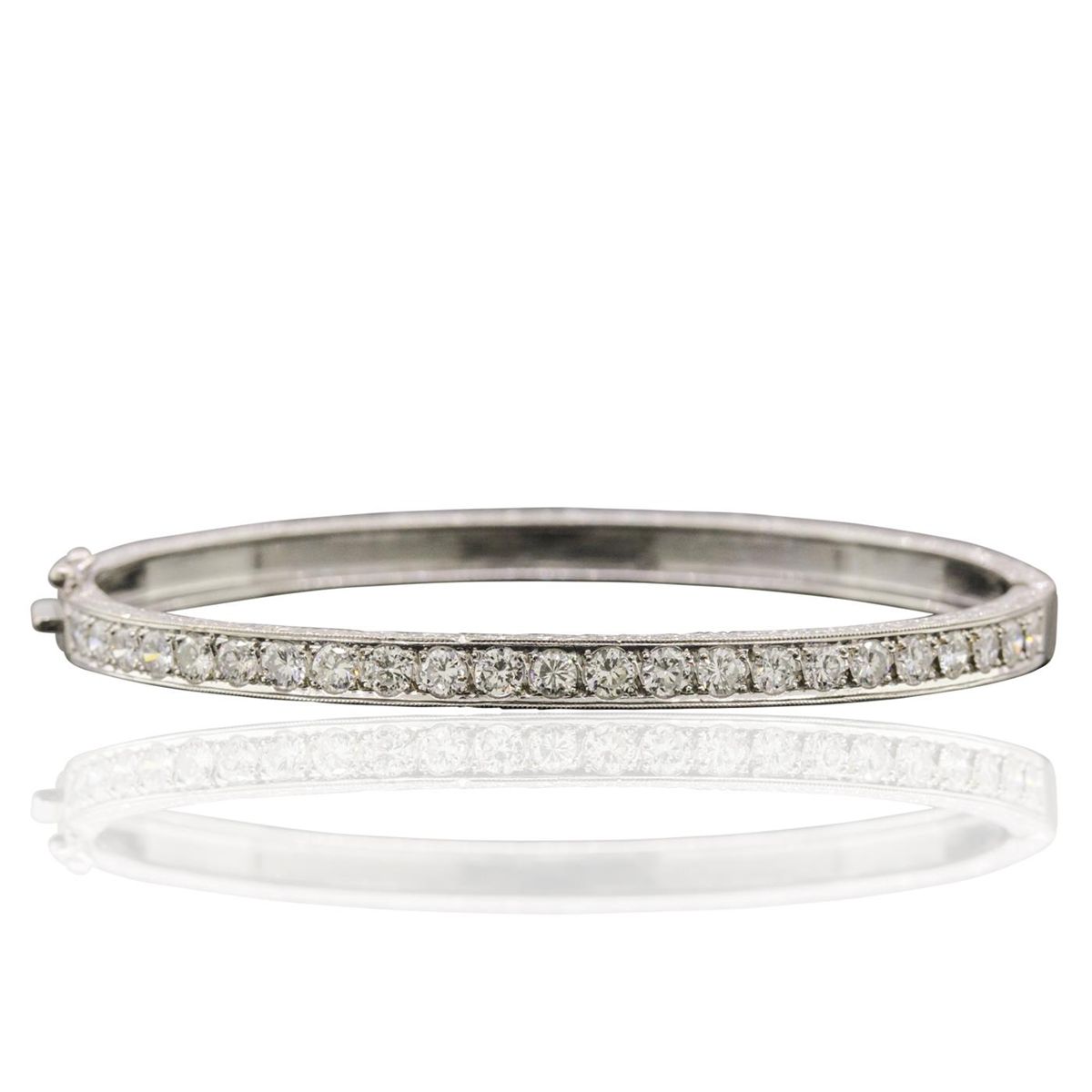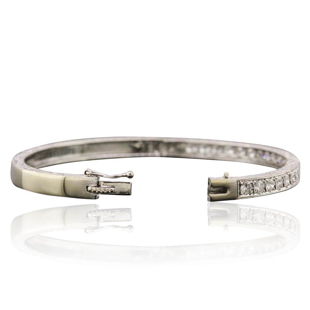 One electronically tested 14KT white gold ladies combination cast & assembled bangle bracelet with a hidden box clasp with a etched finish. Condition is new. Measurements: 2.40" x 1.80". Containing: Twenty-Three prong set round brilliant cut diamonds, measuring 2.50 - 2.50 x 1.50mm (depth est.) approximate. Total Weight of 23 Stones = 1.31ct. Clarity: SI-1 to SI-2. Color: I - J, Cut is Good. All diamonds are graded in the mounting, unless otherwise stated. Total Weight of Diamonds 1.31ct. Total Weight of Bracelet 10.20 grams. GGL Appraised at $7,195.00.