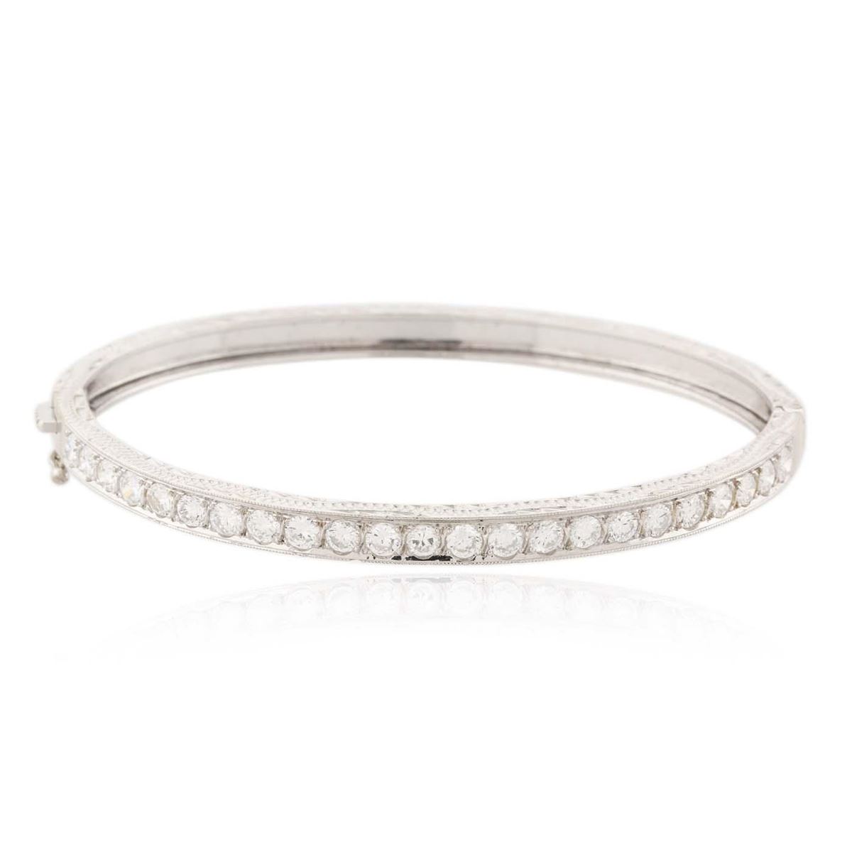 One electronically tested 14KT white gold ladies combination cast & assembled bangle bracelet with a hidden box clasp with a etched finish. Condition is new. Measurements: 2.40" x 1.80". Containing: Twenty-Three prong set round brilliant cut diamonds, measuring 2.50 - 2.50 x 1.50mm (depth est.) approximate. Total Weight of 23 Stones = 1.31ct. Clarity: SI-1 to SI-2. Color: I - J, Cut is Good. All diamonds are graded in the mounting, unless otherwise stated. Total Weight of Diamonds 1.31ct. Total Weight of Bracelet 10.20 grams. GGL Appraised at $7,195.00.
