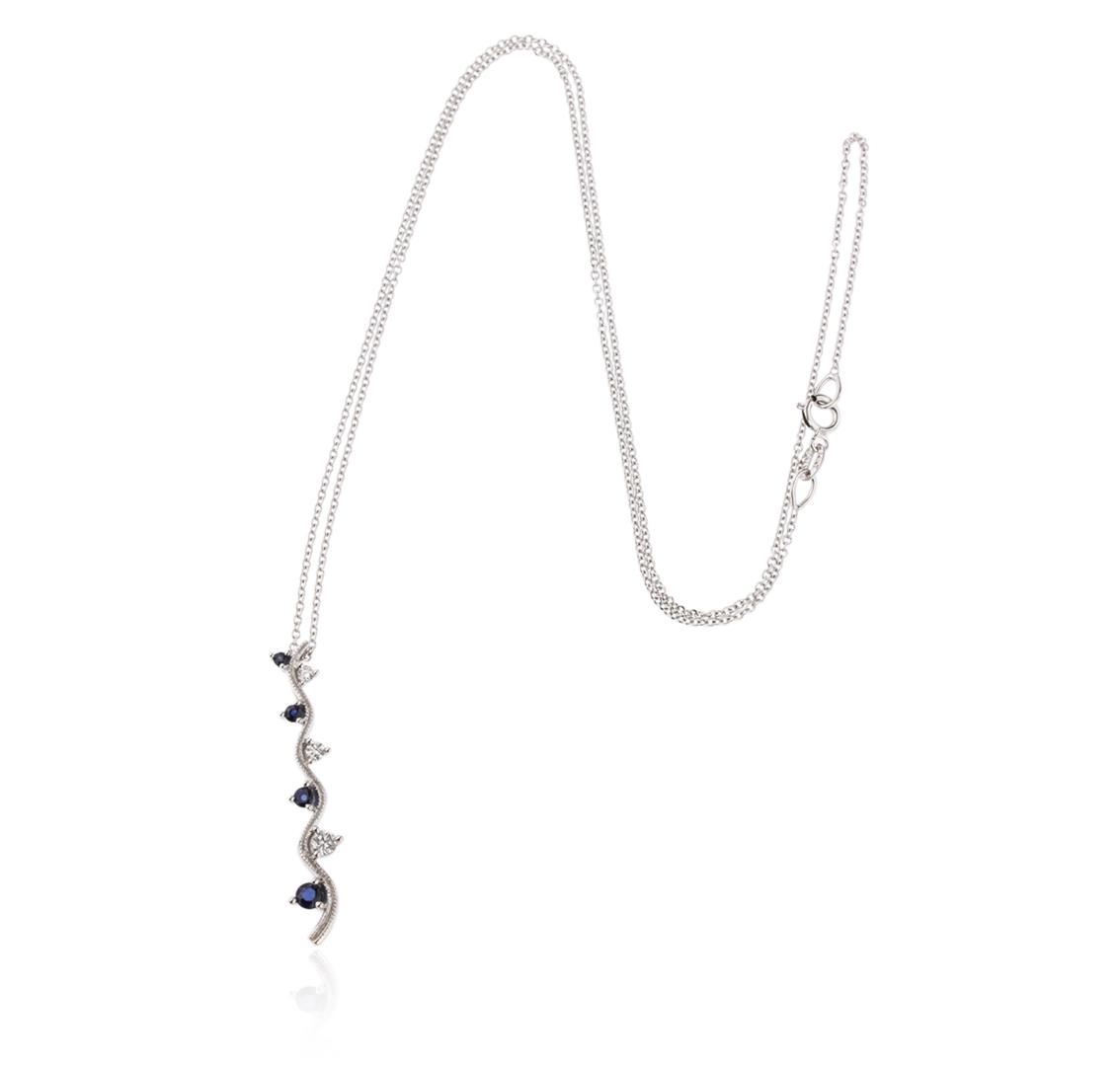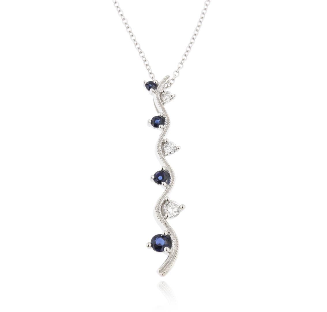 One pendant with chain featuring: 14KT white gold weighing 2.00 grams containing blue sapphires with a total weight of 0.07ct and prong set round diamonds with a total weight of 0.07ct.