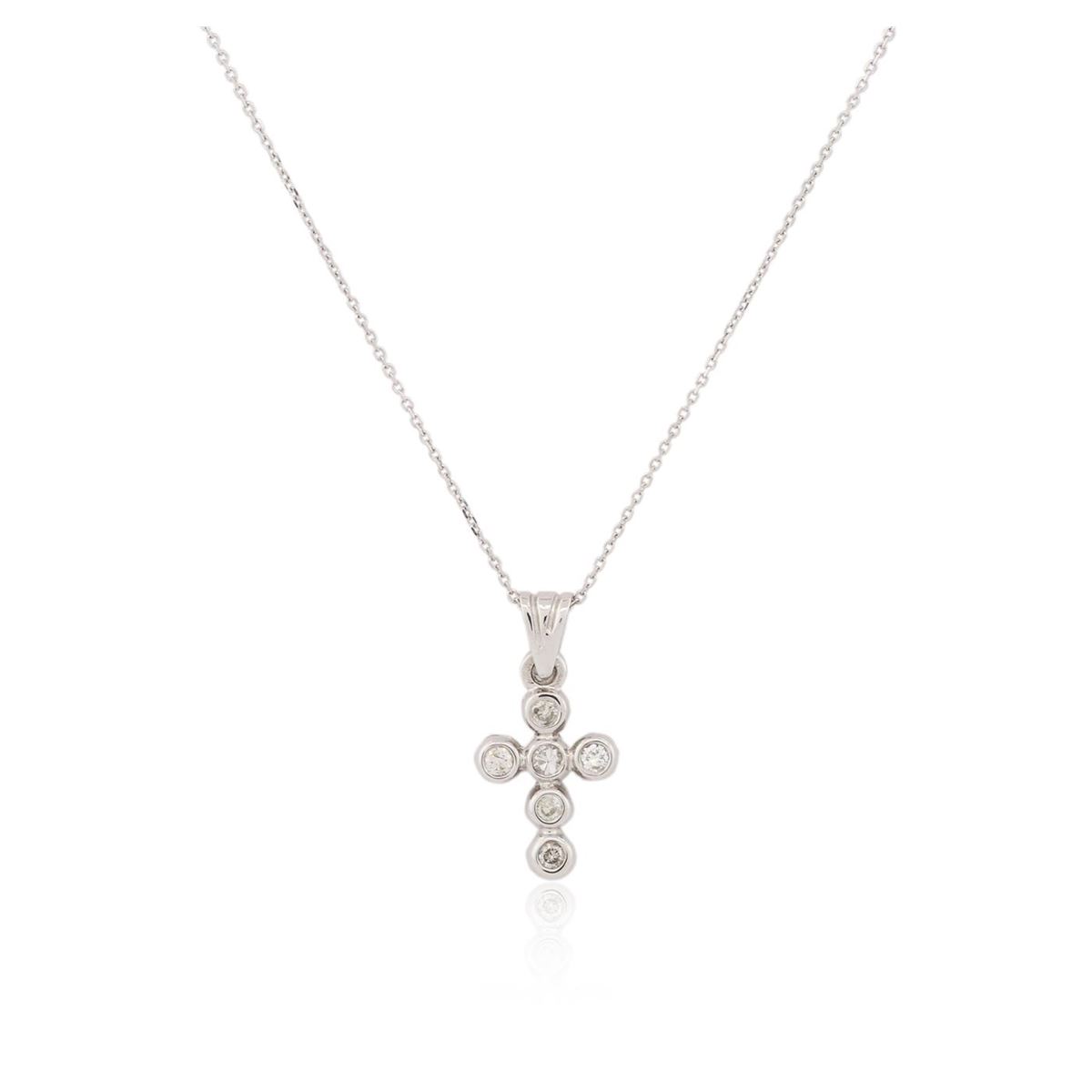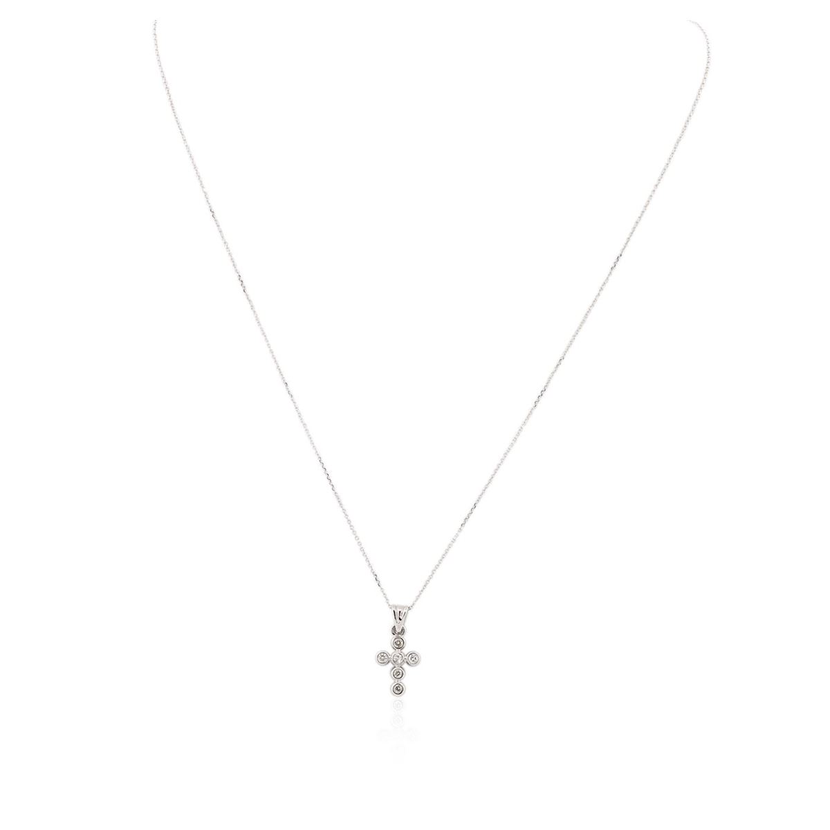 One cross pendant with chain featuring: 14KT white gold weighing 1.60 grams containing bezel set round diamonds with a total weight of 0.16ct.
