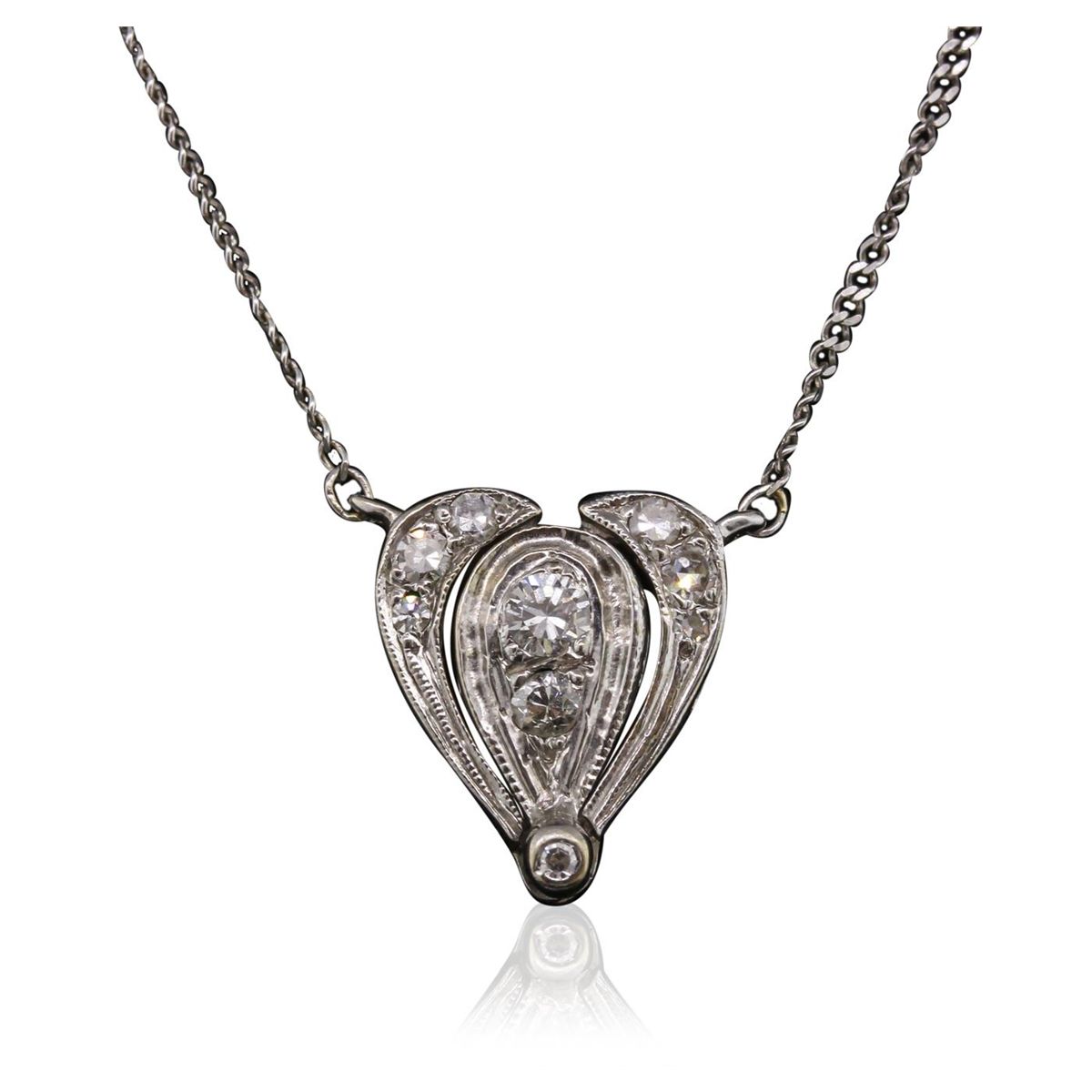 One electronically tested 14KT white gold Ladies combination cast & die struck necklace with a spring ring clasp with a bright polish finish. Measurements: 18" in length. Identified with markings of "14K". Condition is very good. Containing: Six bead set single cut diamonds, measuring 1.60 - 1.00 x 0.78mm (depth est.) approximate. Total Weight of 6 Stones = 0.05ct. Clarity: VS-2. Color: G, Cut is Good. Two bead set round brilliant cut diamonds, measuring 2.90 - 2.10 x 1.50mm (depth est.) approximate. Total Weight of 2 Stones = 0.11ct. Clarity: SI-1 to SI-2. Color: H - I, Cut is Good. Total Weight of Diamonds 0.16ct. Total Weight of Necklace 2.90gm. GGL Appraised at $2,125.00.