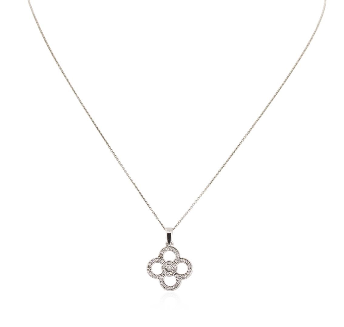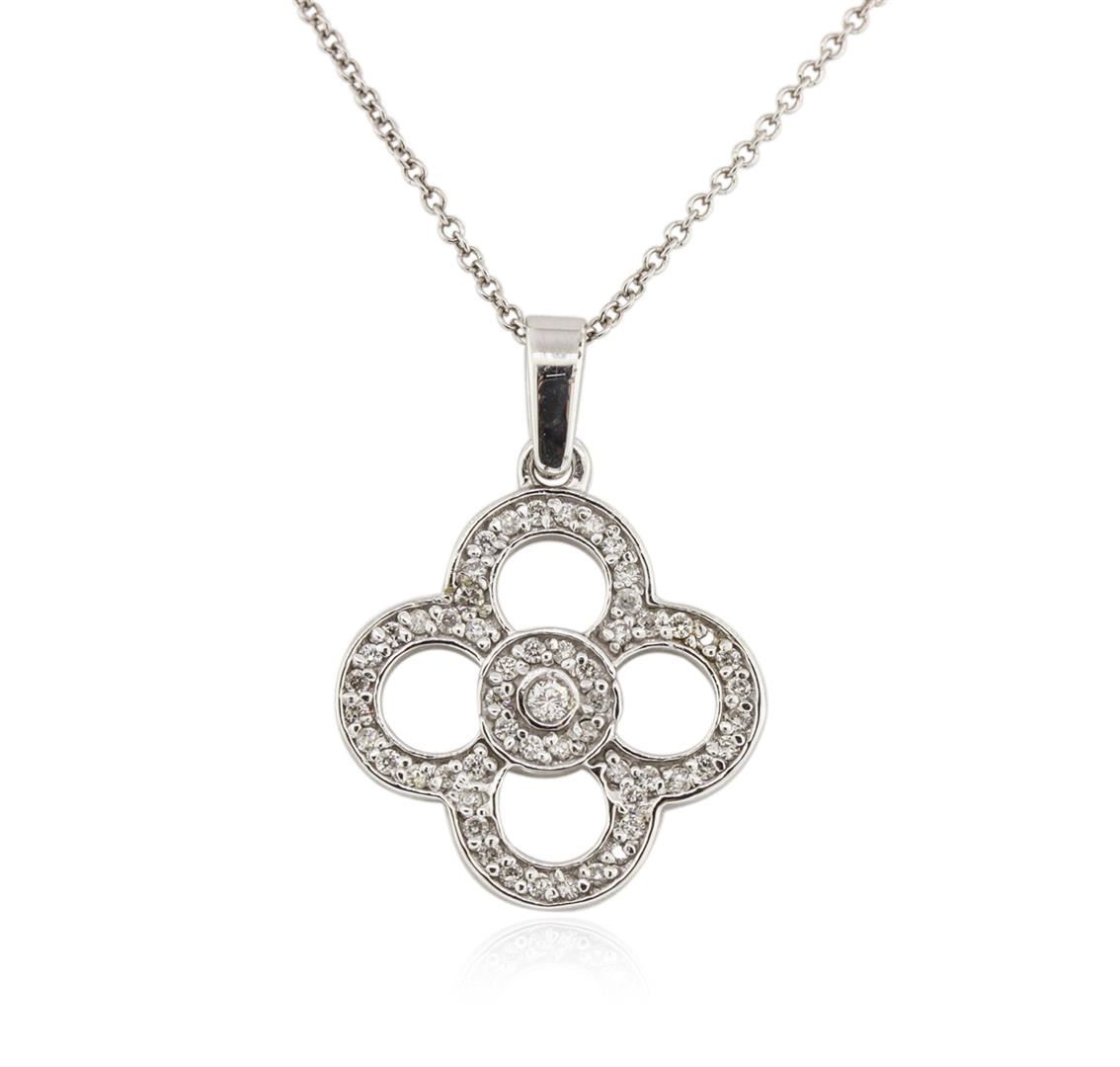 One electronically tested 14KT white gold ladies cast diamond pendant & chain 18.0" long, with a spring ring clasp with a bright polish finish. Identified with markings of "14K". Condition is new. Containing: Fifty-Five prong set round brilliant cut diamonds, measuring 1.80 - 1.00 x 0.84mm (depth est.) approximate total weight of 55 Stones = 0.20ct. Clarity: SI-1 to I-1. Color: I - J, Cut is Good. All diamonds are graded in the mounting, unless otherwise stated. Total Weight of Diamonds 0.20ct. Total Weight of Pendant & Chain 3.00 grams. GGL Appraised at $1,000.00.