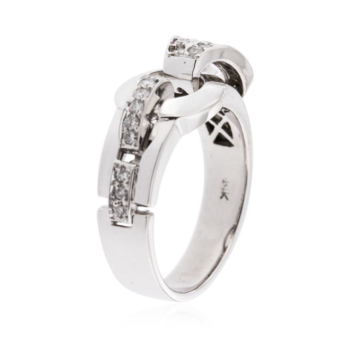 One electronically tested 14KT white gold ladies cast diamond ring with a bright polish finish. Identified with markings of "14K". Condition is new. Containing: Twenty-Five prong set round brilliant cut diamonds, measuring 1.30 - 1.30 x 0.78mm (depth est.) approximate total weight of 25 Stones = 0.20ct. Clarity: SI-1 to SI-2. Color: I - J, Cut is Good. All diamonds are graded in the mounting, unless otherwise stated. Total Weight of Diamonds 0.20ct. Total Weight of Ring 5.70 grams. GGL Appraised at $2,455.00.