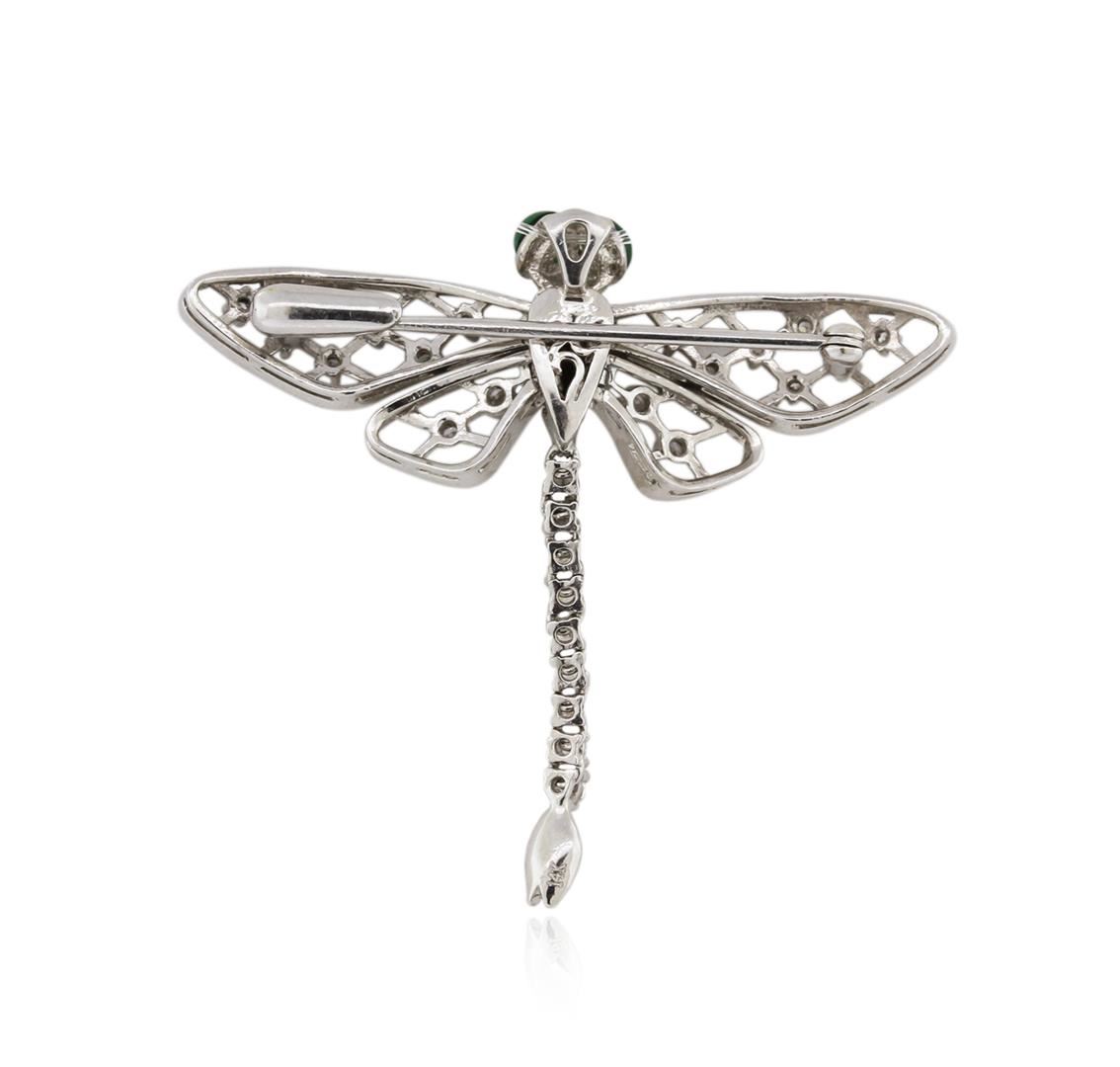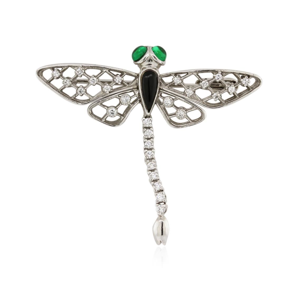 One electronically tested 14KT white gold ladies cast diamond and gem butterfly pin with a bright polish finish. Condition is very good. Containing: Two bezel set round cabochon cut natural emeralds, measuring 3.50 x 3.50 x 2.28mm, approximate total weight of 0.42ct., clarity is slightly included, type III, medium, moderately strong, green color, (GIA G 5/4), cut is good. One bezel set pear cabochon cut natural black onyx, measuring 8.50 x 3.00 x 1.95mm, approximate weight of 0.35ct., clarity is severely included, black, strong, black color, (GIA Bl 10/5), cut is good. Twenty-Seven gypsy set round brilliant cut diamonds, measuring 1.50 - 1.30 x 0.84mm (depth est.) approximate total weight of 27 Stones = 0.27ct. Clarity: SI-1. Color: H - I, Cut is Good. Colored gemstones are presumed to have been subjected to commonly used enhancement processes. All diamonds and colored gemstones are graded in the mounting, unless otherwise stated. Total Weight of Colored Stones 0.77ct. Total Weight of Diamonds 0.27ct. Total Weight of Butterfly Pin 6.10 grams. GGL Appraised at $1,500.00.
