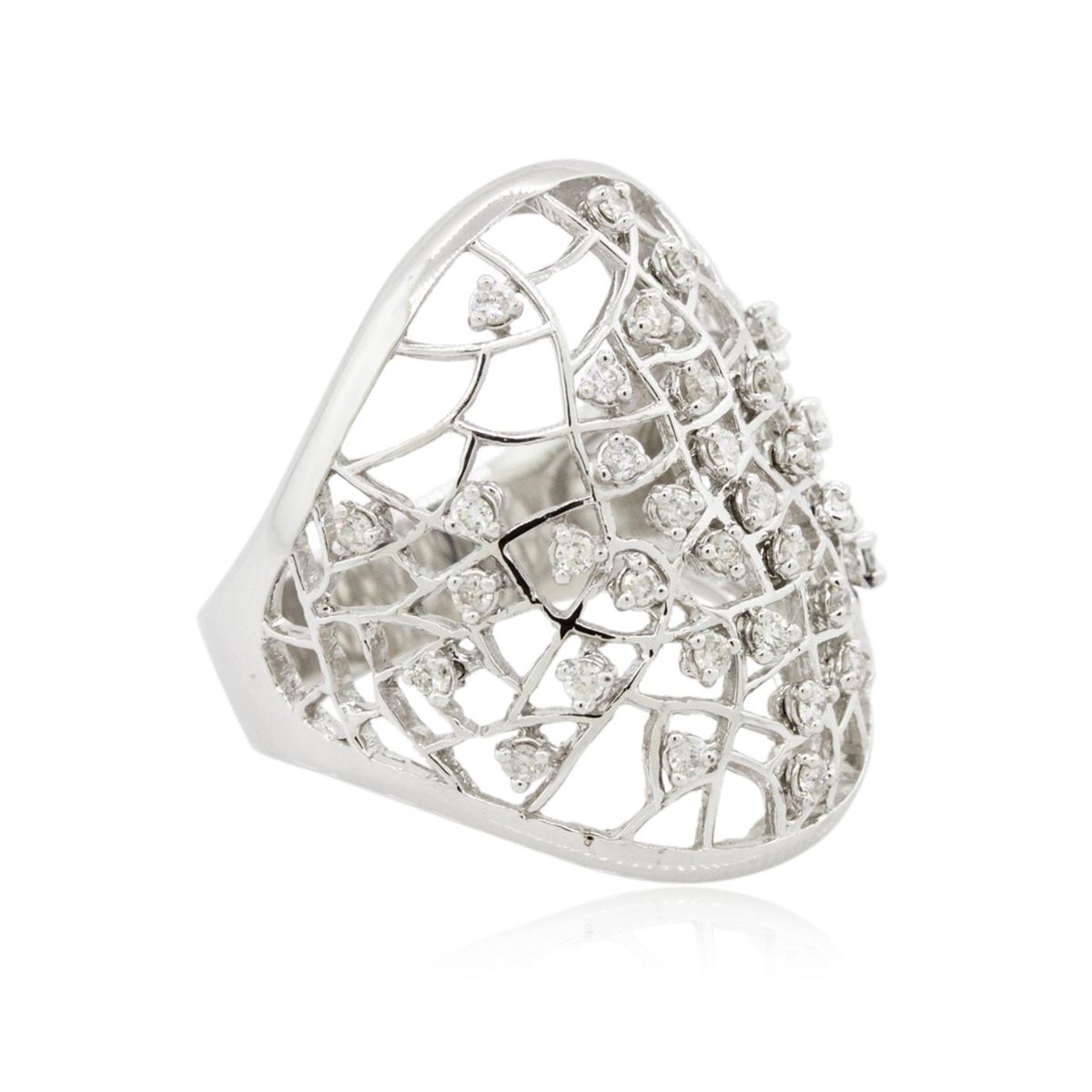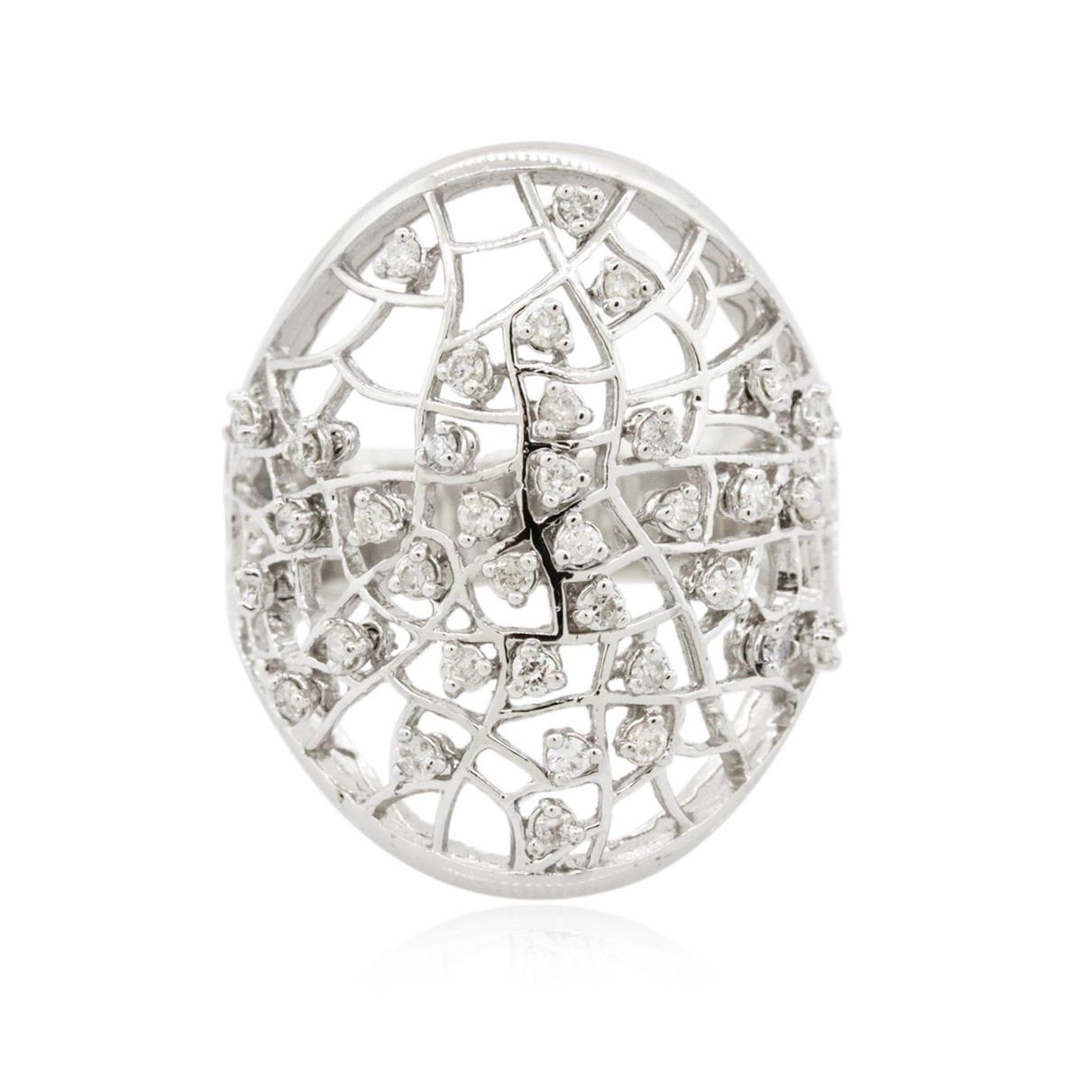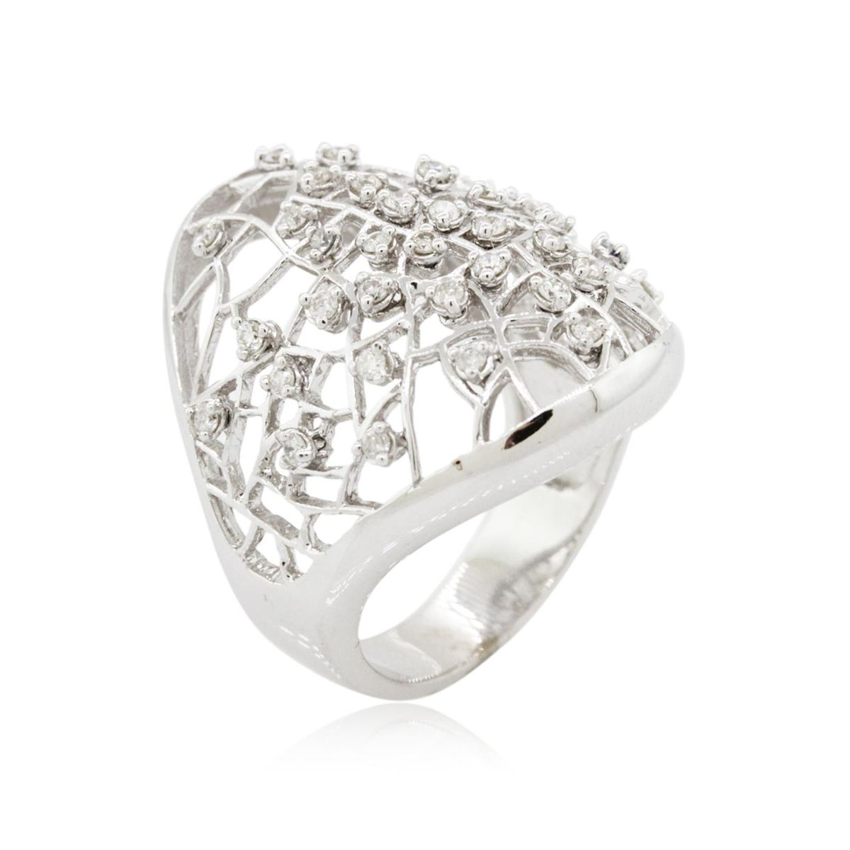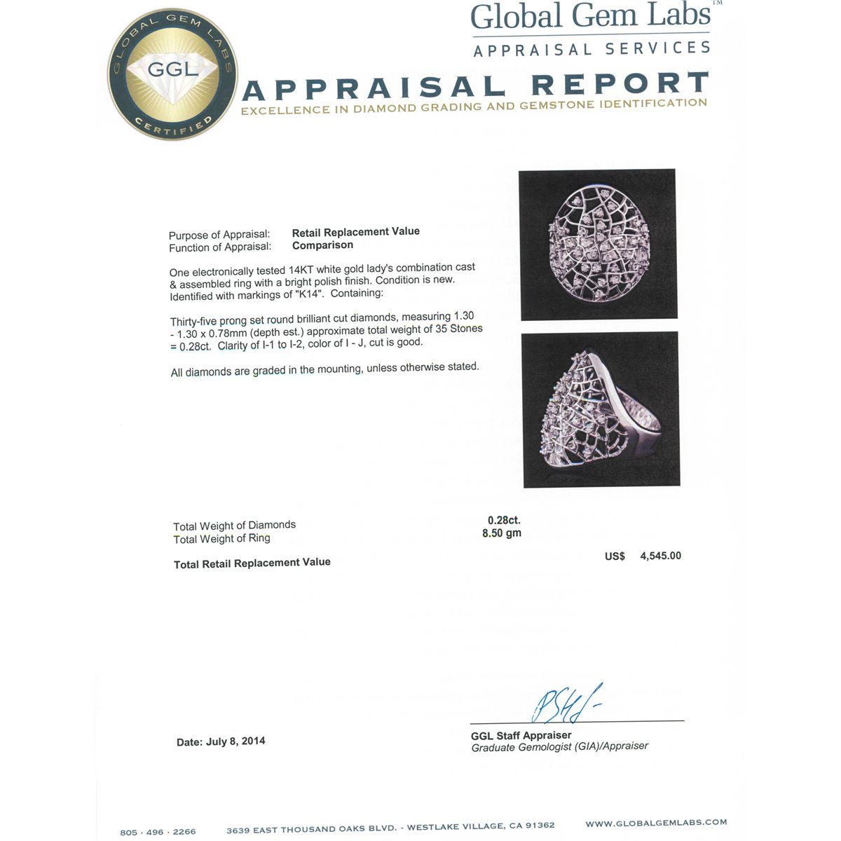 One electronically tested 14KT white gold Ladies combination cast & assembled ring with a bright polish finish. Condition is new. Identified with markings of "K14". Containing: Thirty-Five prong set round brilliant cut diamonds, measuring 1.30 - 1.30 x 0.78mm (depth est.) approximate. Total Weight of 35 Stones = 0.28ct. Clarity: I-1 to I-2. Color: I - J, Cut is Good. All diamonds are graded in the mounting, unless otherwise stated. Total Weight of Diamonds 0.28ct. Total Weight of Ring 8.50 grams. GGL Appraised at $4,545.00.