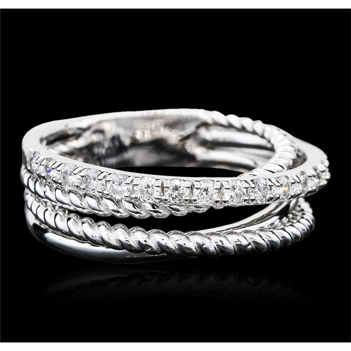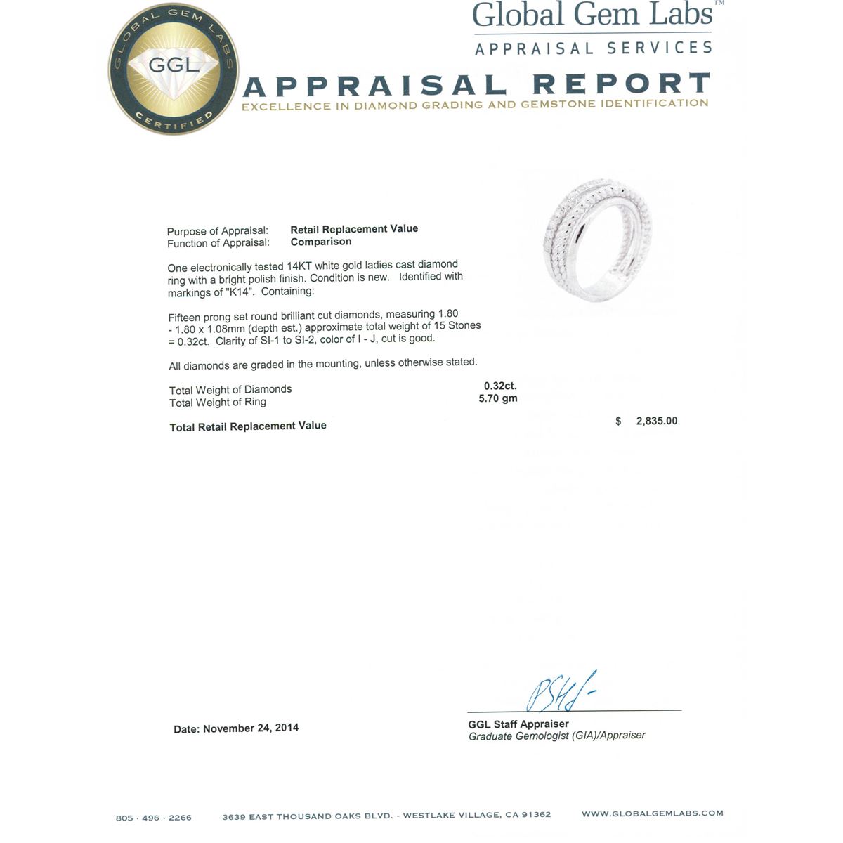 One electronically tested 14KT white gold ladies cast diamond ring with a bright polish finish. Identified with markings of "K14". Condition is new. Containing: Fifteen prong set round brilliant cut diamonds, measuring 1.80 - 1.80 x 1.08mm (depth est.) approximate total weight of 15 Stones = 0.32ct. Clarity: SI-1 to SI-2. Color: I - J, Cut is Good. All diamonds are graded in the mounting, unless otherwise stated. Total Weight of Diamonds 0.32ct. Total Weight of Ring 5.70 grams. GGL Appraised at $2,835.00.