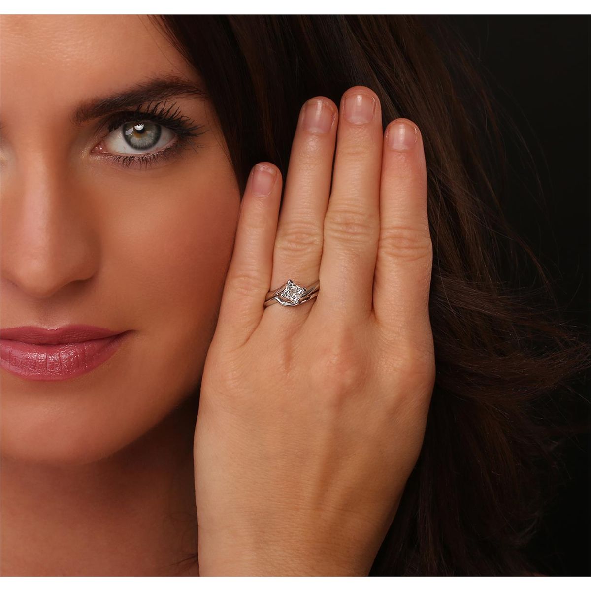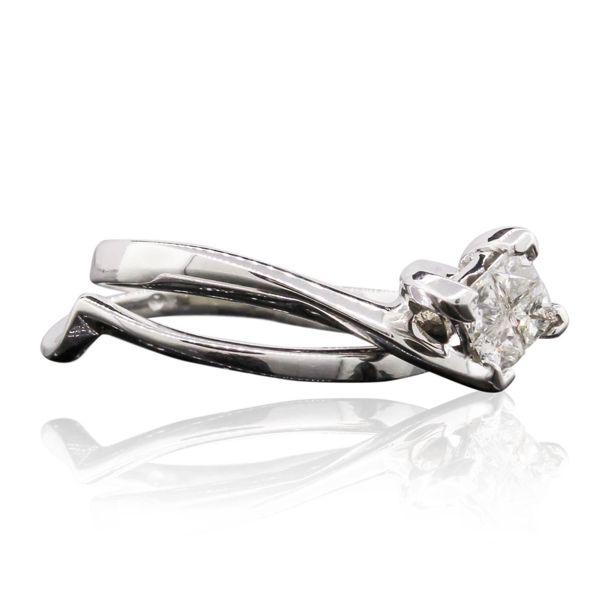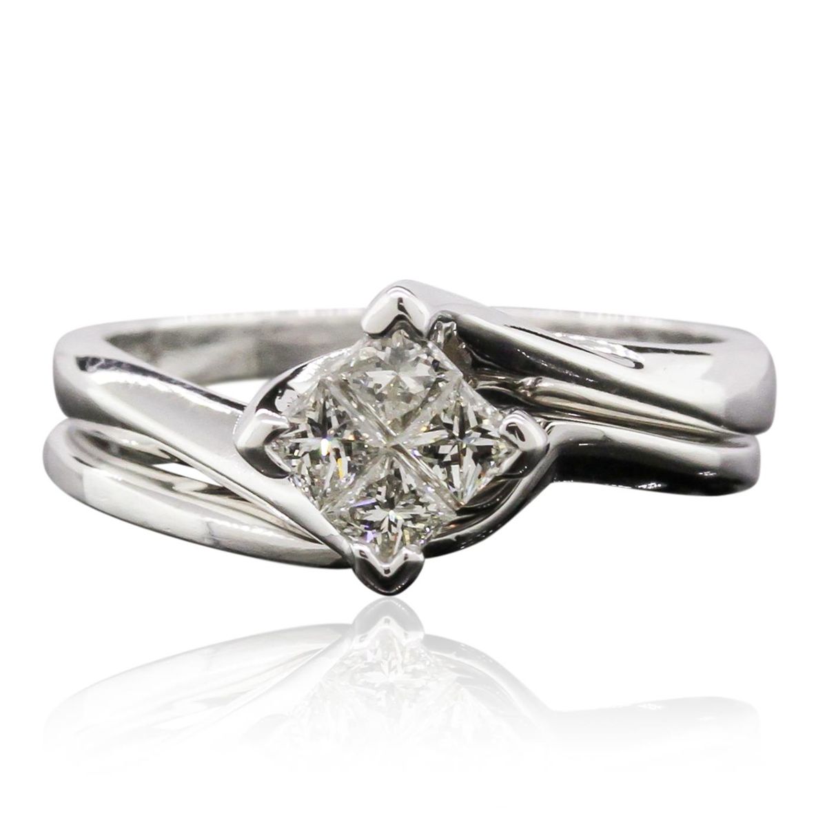 One engagement ring and guard electronically tested 14KT white gold Ladies combination cast & assembled ring with a bright polish finish. Identified with markings of "14K". Condition is very good. Containing: Four invisible set princess cut diamonds, measuring 2.40 x 2.40 x 1.80mm (depth est.) approximate. Total Weight of 4 Stones = 0.34ct. Clarity: VS-1 to VS-2. Color: I - J, Cut is Very Good. Total Weight of Diamonds 0.34ct. Total Weight of Ring 5.00gm. GGL Appraised at $2,755.00.