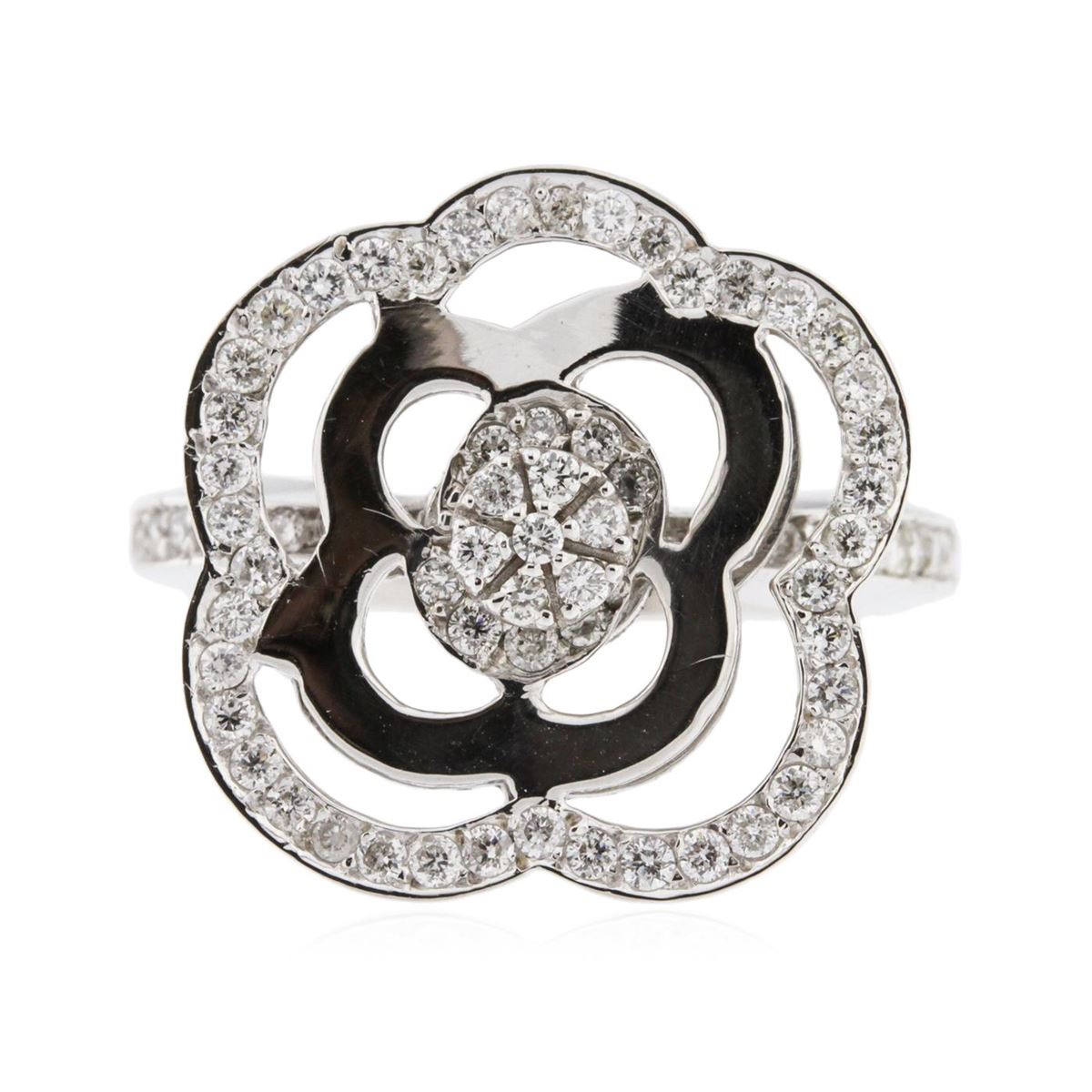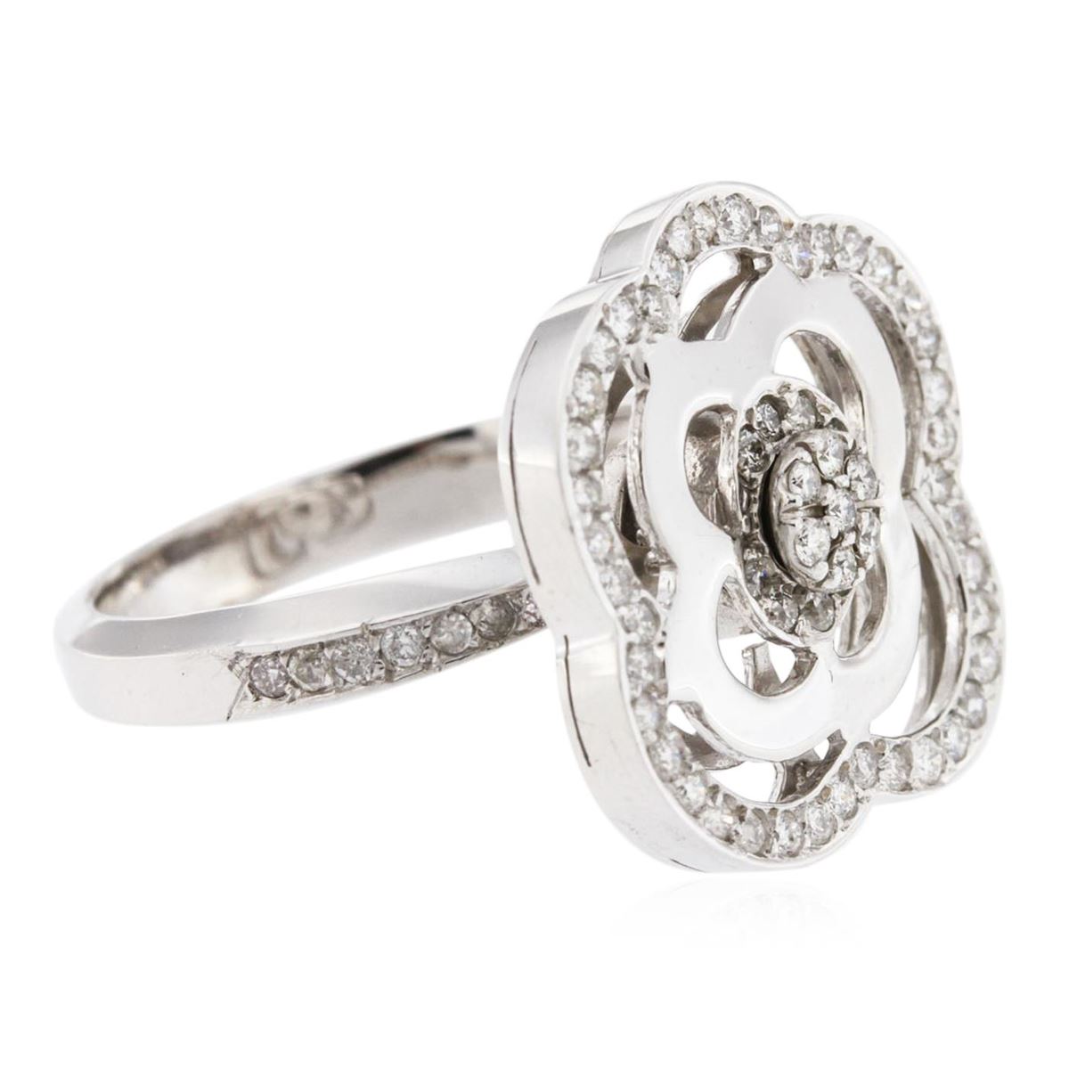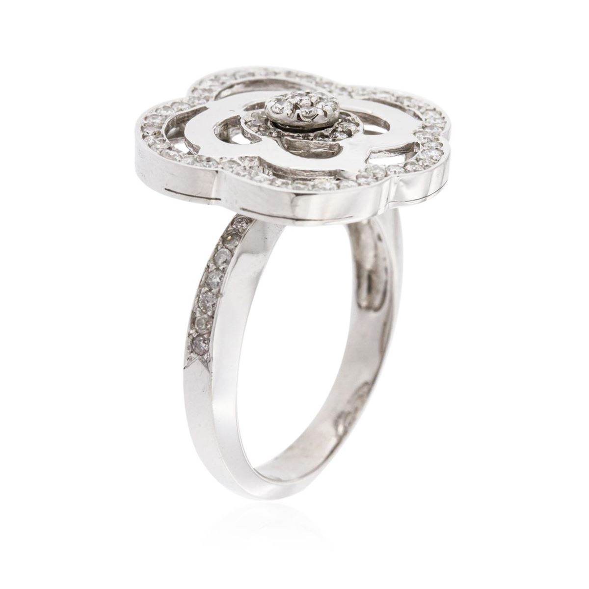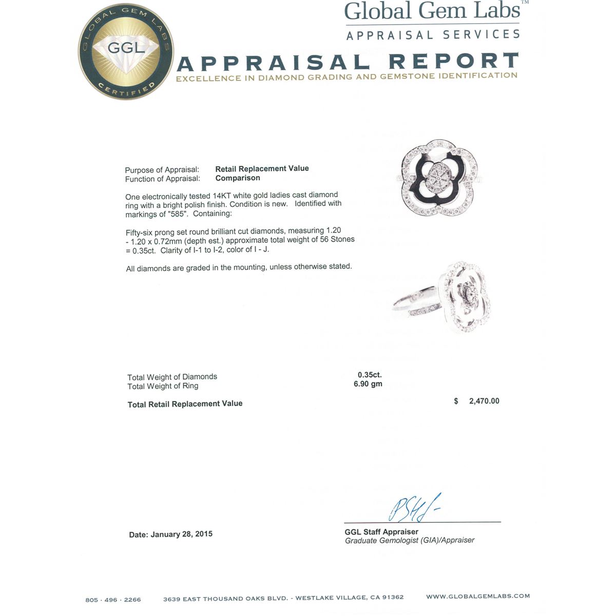 One electronically tested 14KT white gold ladies cast diamond ring with a bright polish finish. Identified with markings of "585". Condition is new. Containing: Fifty-Six prong set round brilliant cut diamonds, measuring 1.20 - 1.20 x 0.72mm (depth est.) approximate total weight of 56 Stones = 0.35ct. Clarity: I-1 to I-2. Color: I - J. All diamonds are graded in the mounting, unless otherwise stated. Total Weight of Diamonds 0.35ct. Total Weight of Ring 6.90 grams. GGL Appraised at $2,470.00.