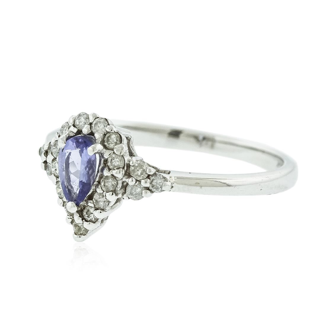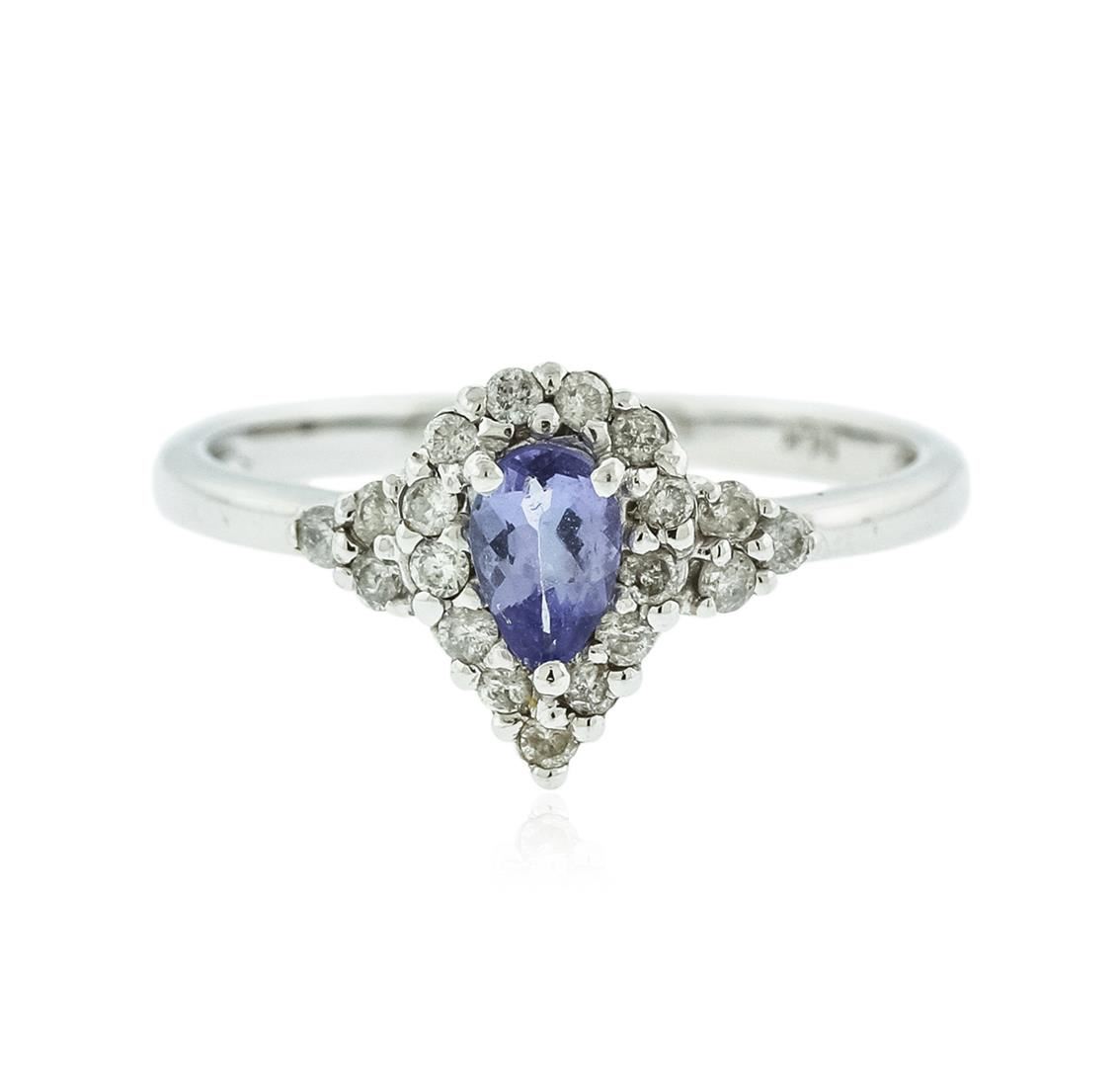 One electronically tested 14KT white gold ladies cast tanzanite and diamond ring with a bright polish finish. Identified with markings of "14K". Condition is new. Containing: One prong set pear modified brilliant cut natural tanzanite, measuring 5.50 x 3.80 x 2.47mm, approximate weight of 0.35ct., clarity is eye clean, type I, medium light, slightly grayish, violet color, (GIA V 4/2), cut is good. Nineteen prong set round brilliant cut diamonds, measuring 1.30 - 1.30 x 0.78mm (depth est.) approximate total weight of 19 Stones = 0.15ct. Clarity: I-1 to I-3. Color: I - J. Colored gemstones are presumed to have been subjected to commonly used enhancement processes. All diamonds and colored gemstones are graded in the mounting, unless otherwise stated. Total Weight of Colored Stones 0.35ct. Total Weight of Diamonds 0.15ct. Total Weight of Ring 2.40 grams. GGL Appraised at $1,120.00.
