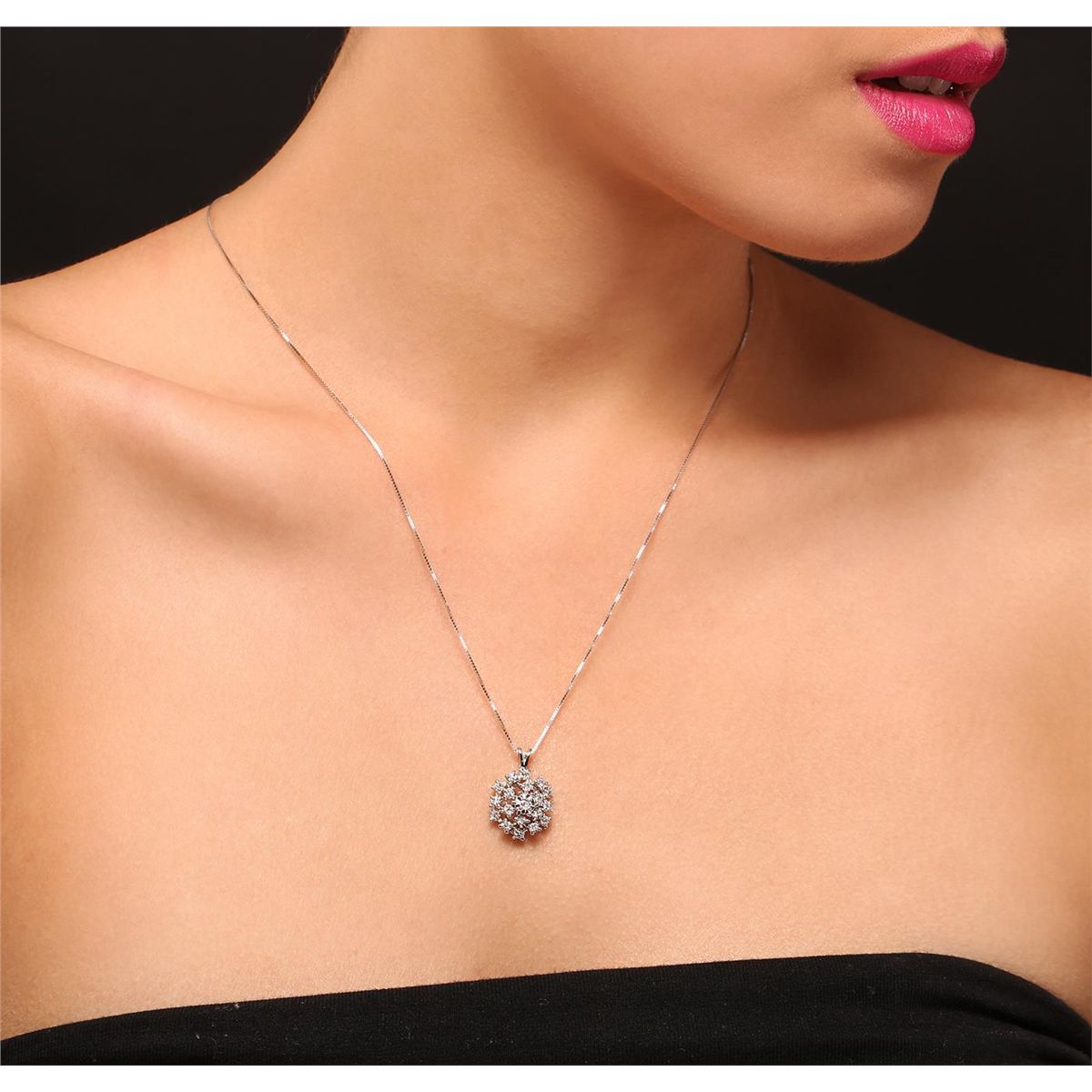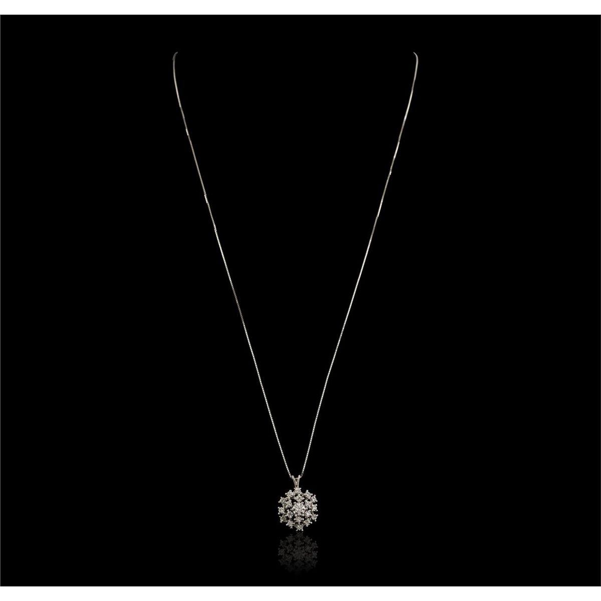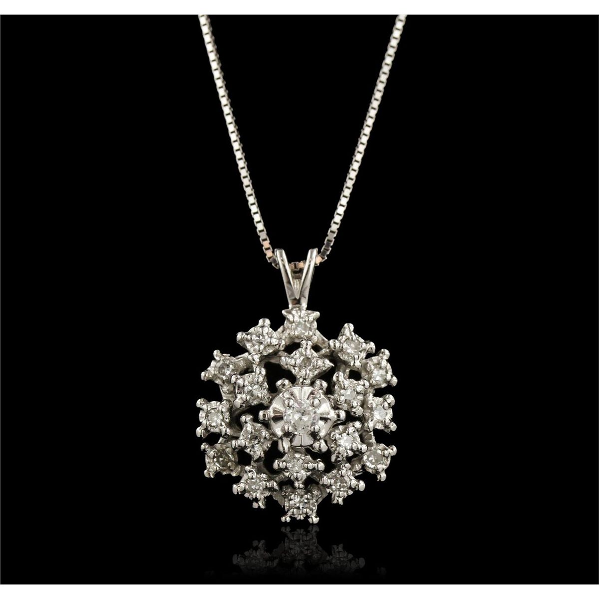 One electronically tested 14KT White Gold ladies cast & assembled diamond pendant with chain. Condition is new, good workmanship. The pendant features an organized diamond Custer, completed by a White Gold split bail. The pendant features an eighteen inch length 14KT White Gold box chain, terminating in a spring ring clasp. Bright polish finish. Containing: Nineteen prong set single cut diamonds, measuring 2.50 - 1.30 x 1.14mm (depth est.) approximate total weight of 19 Stones = 0.35ct. Graded in the setting. Clarity: VS-2 to SI-2. Color: H - J. Total Weight of Diamonds 0.35ct. Total Weight of Pendant 4.42 grams. AIG Appraised at $1,685.00.