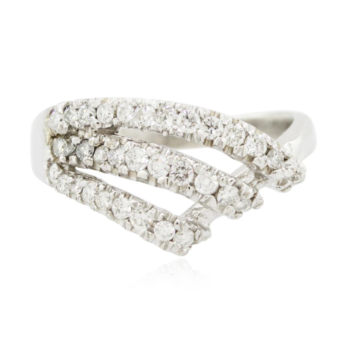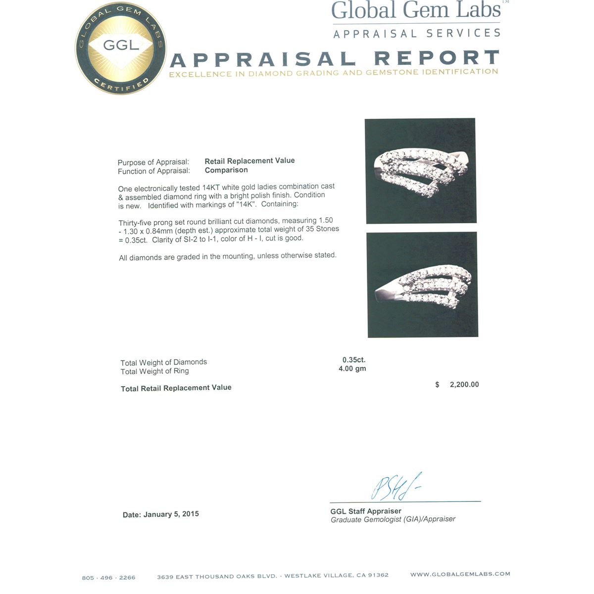 One electronically tested 14KT white gold ladies combination cast & assembled diamond ring with a bright polish finish. Identified with markings of "14K". Condition is new. Containing: Thirty-Five prong set round brilliant cut diamonds, measuring 1.50 - 1.30 x 0.84mm (depth est.) approximate total weight of 35 Stones = 0.35ct. Clarity: SI-2 to I-1. Color: H - I, Cut is Good. All diamonds are graded in the mounting, unless otherwise stated. Total Weight of Diamonds 0.35ct. Total Weight of Ring 4.00 grams. GGL Appraised at $2,200.00.