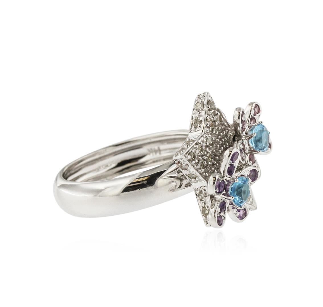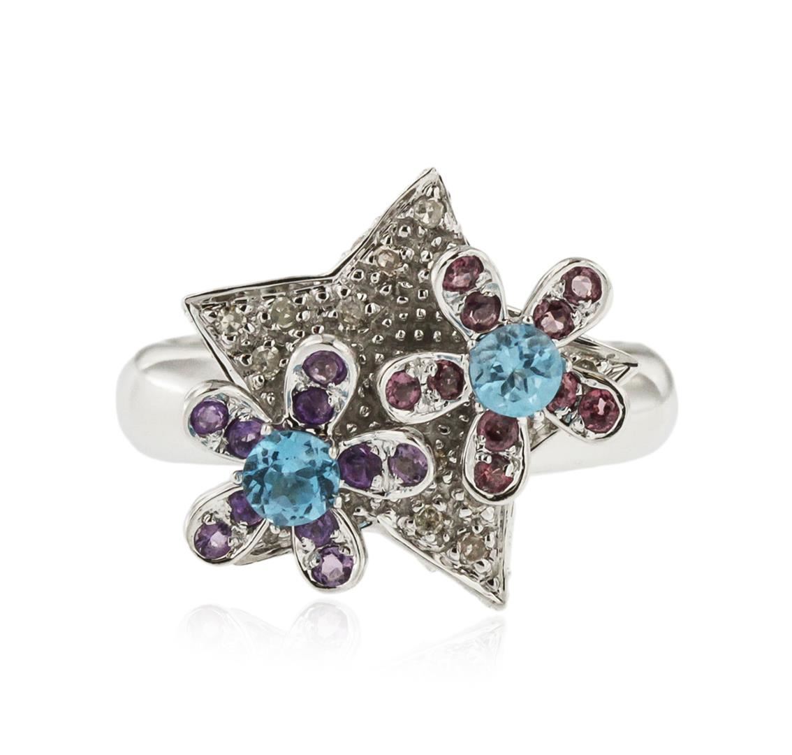 One ring featuring: 14KT white gold weighing 6.89 grams containing amethysts with a total weight of 0.40ct, blue topazes with a total weight of 0.30ct and diamonds with a total weight of 0.30ct.