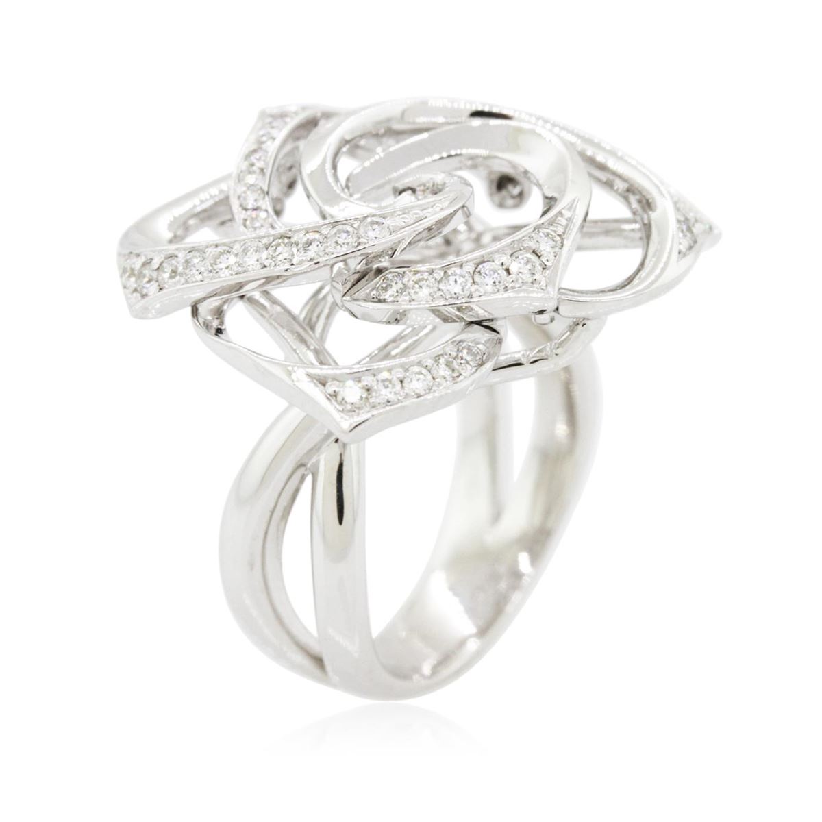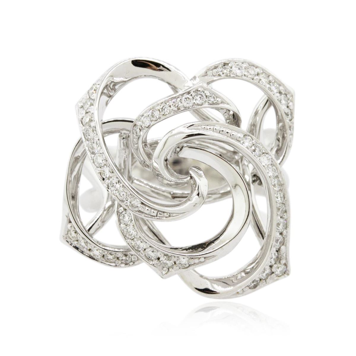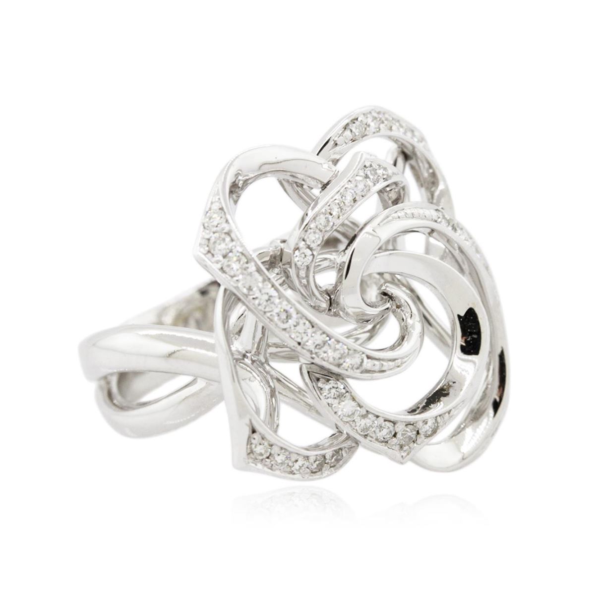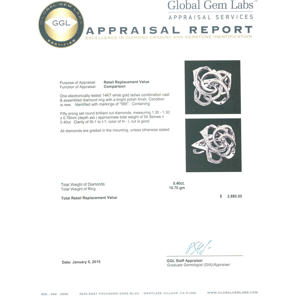 One electronically tested 14KT white gold ladies combination cast & assembled diamond ring with a bright polish finish. Identified with markings of "585". Condition is new. Containing: Fifty prong set round brilliant cut diamonds, measuring 1.30 - 1.30 x 0.78mm (depth est.) approximate total weight of 50 Stones = 0.40ct. Clarity: SI-1 to I-1. Color: H - I, Cut is Good. All diamonds are graded in the mounting, unless otherwise stated. Total Weight of Diamonds 0.40ct. Total Weight of Ring 10.70 grams. GGL Appraised at $2,880.00.