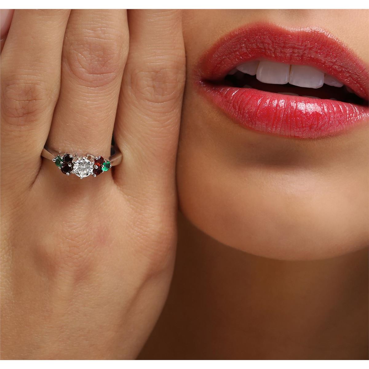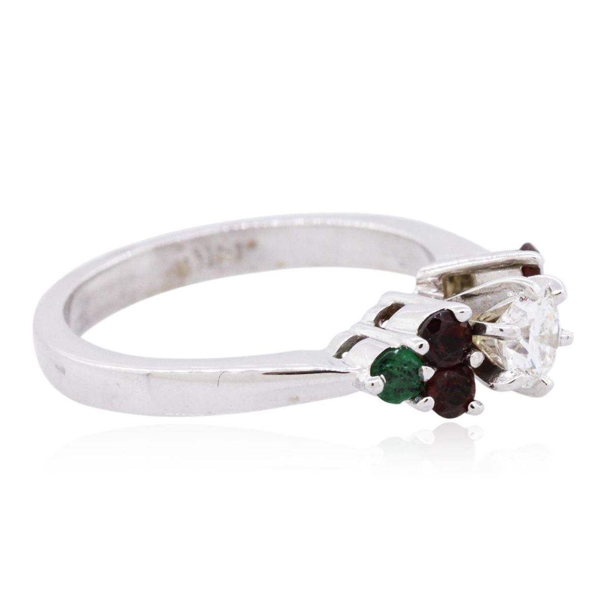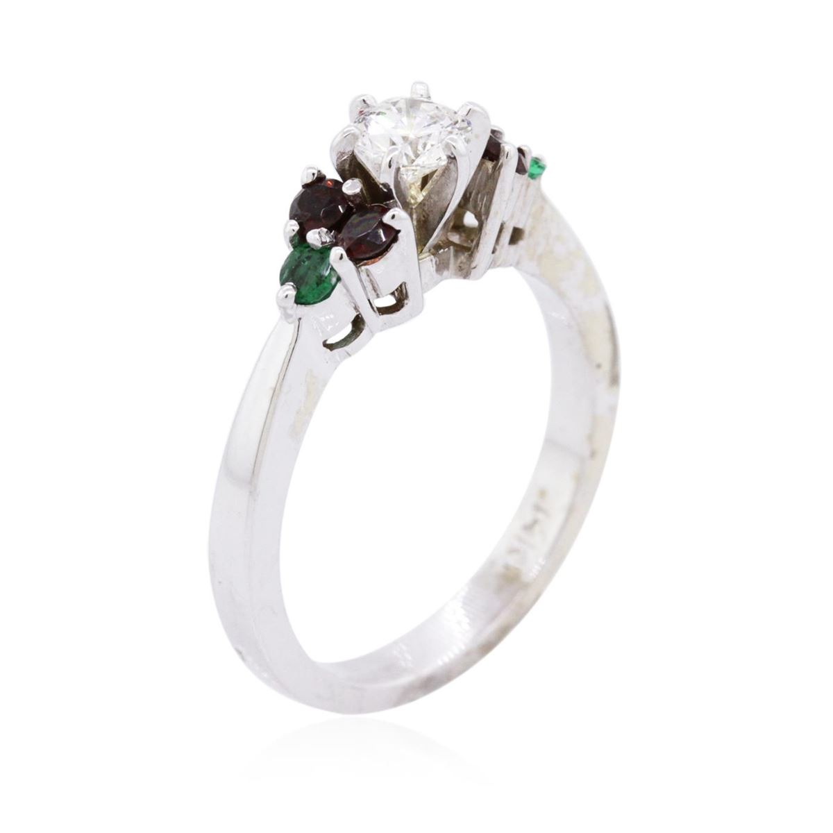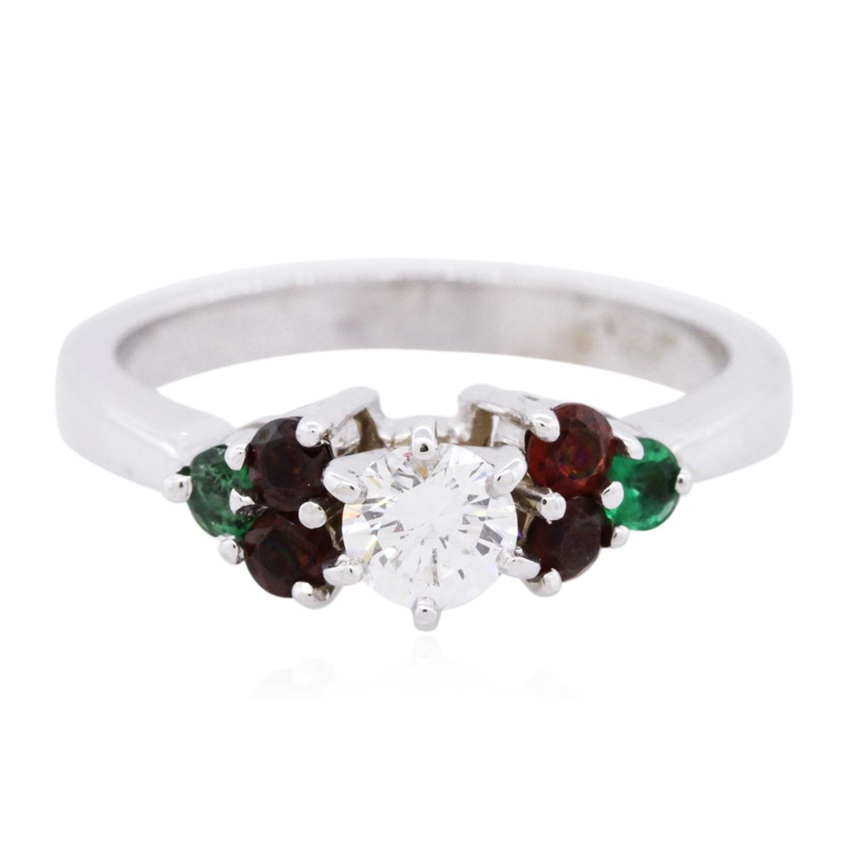 One ring featuring: 14KT white gold weighing 4.50 grams containing one round diamond center stone with a total weight of 0.40ct, four garnets with a total weight of 0.28cts, and two emeralds with a total weight of 0.14cts.