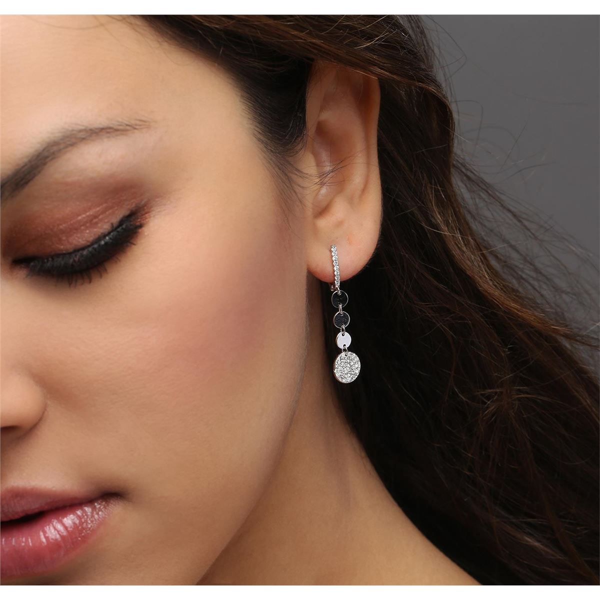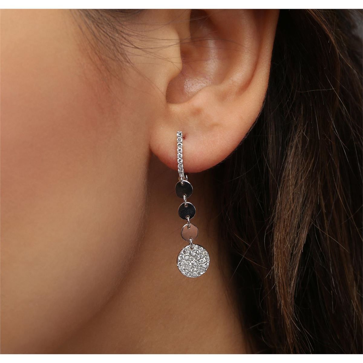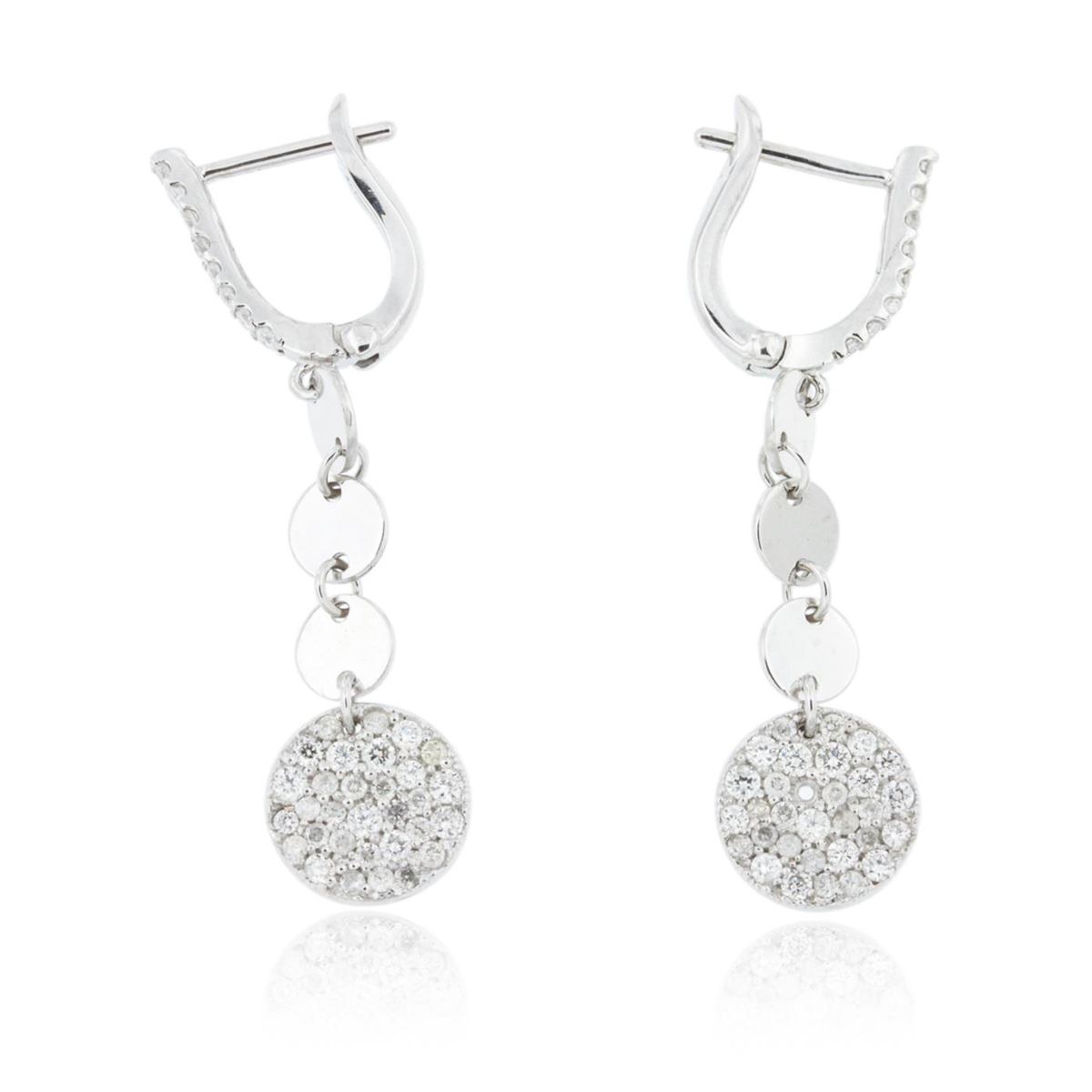 One pair electronically tested 14KT white gold ladies cast diamond earrings with hinged clip backs with a bright polish finish. Identified with markings of "14K". Condition is new. Containing: Eighty-Six bead set round brilliant cut diamonds, measuring 1.10 - 1.10 x 0.66mm (depth est.) approximate total weight of 86 Stones = 0.41ct. Clarity: I-2 to I-3. Color: I - J, Cut is Good. All diamonds are graded in the mounting, unless otherwise stated. Total Weight of Diamonds 0.41ct. Total Weight of Earrings 3.50 grams. GGL Appraised at $2,235.00.