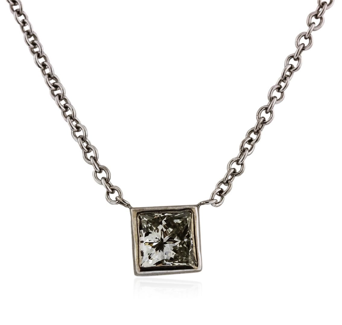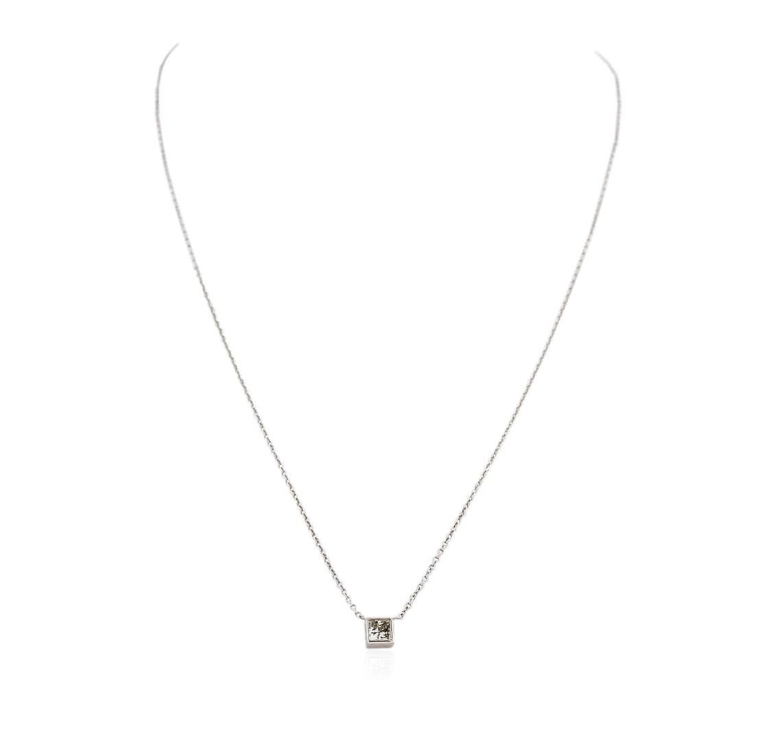 One solitaire necklace featuring: 14KT white gold weighing 2.10 grams containing one bezel set princess cut diamond with a total weight of 0.41ct.