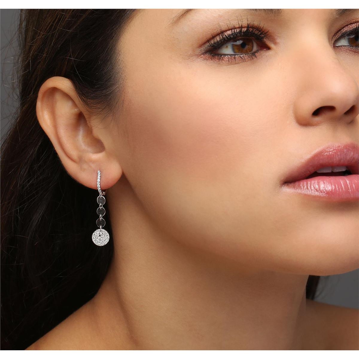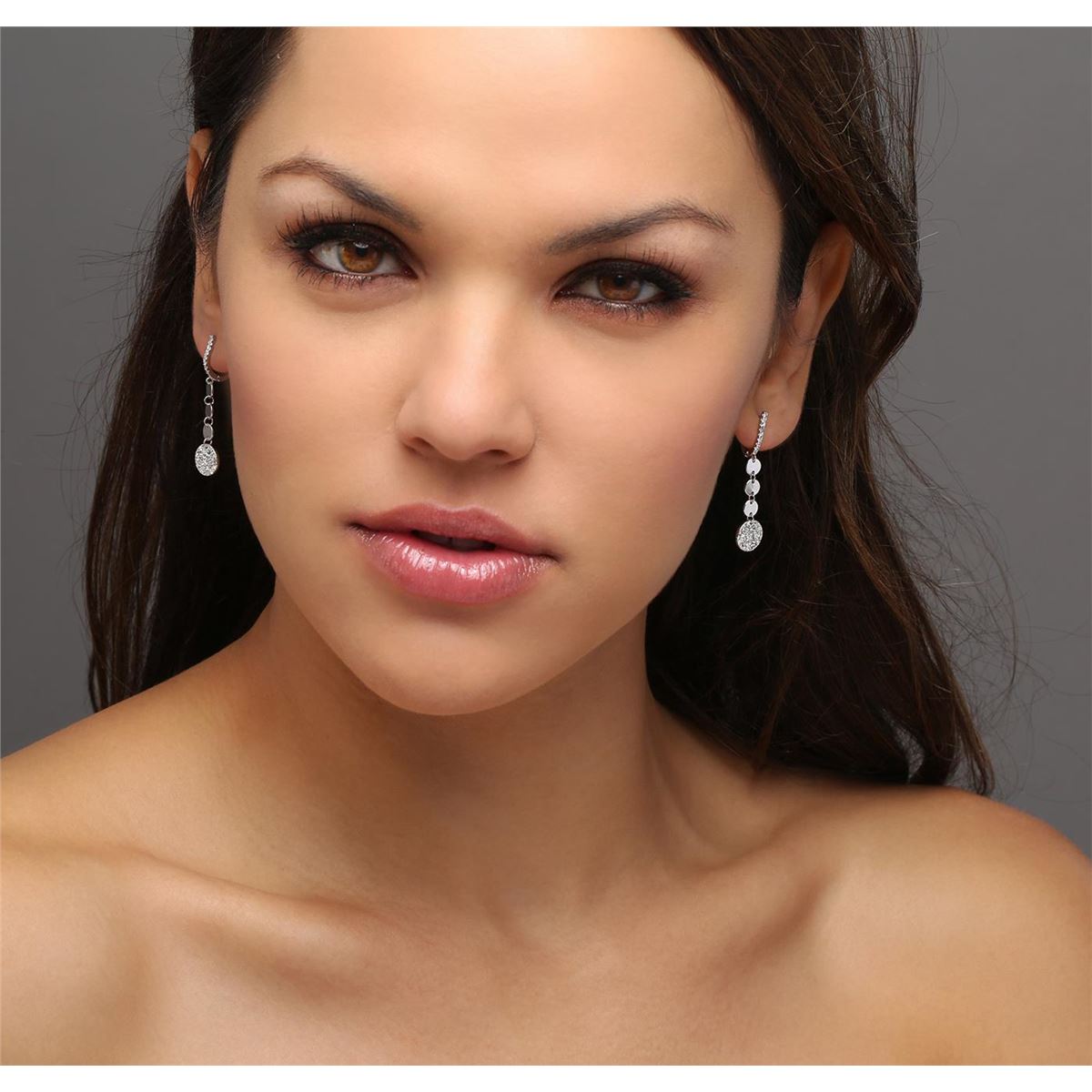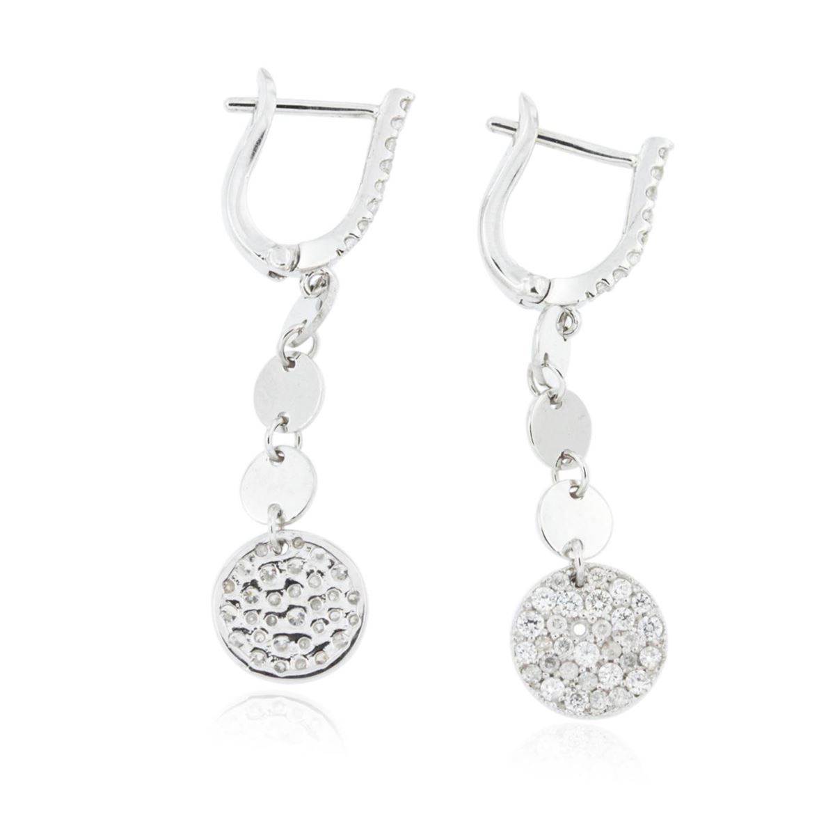 One pair electronically tested 14KT white gold ladies cast diamond earrings with hinged clip backs with a bright polish finish. Identified with markings of "14K". Condition is new. Containing: Eighty-Six bead set round brilliant cut diamonds, measuring 1.10 - 1.10 x 0.66mm (depth est.) approximate total weight of 86 Stones = 0.41ct. Clarity: I-2 to I-3. Color: I - J, Cut is Good. All diamonds are graded in the mounting, unless otherwise stated. Total Weight of Diamonds 0.41ct. Total Weight of Earrings 3.50 grams. GGL Appraised at $2,235.00.