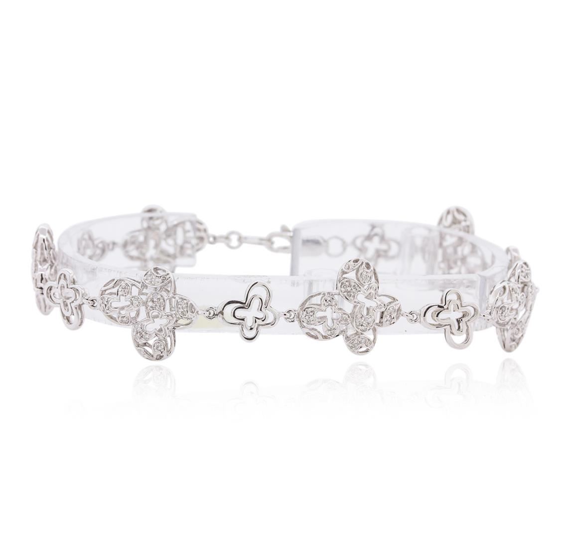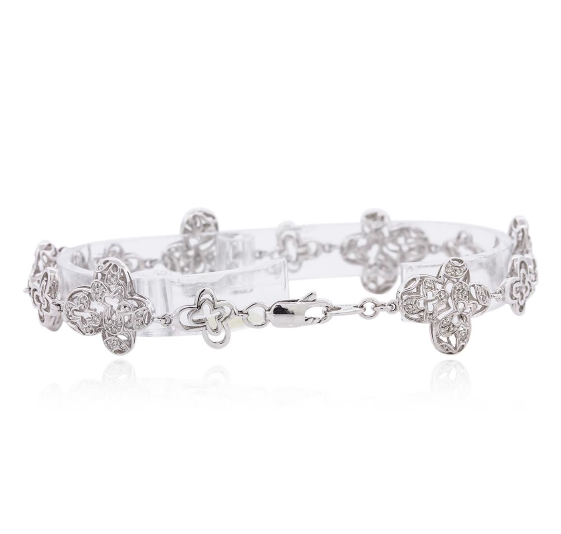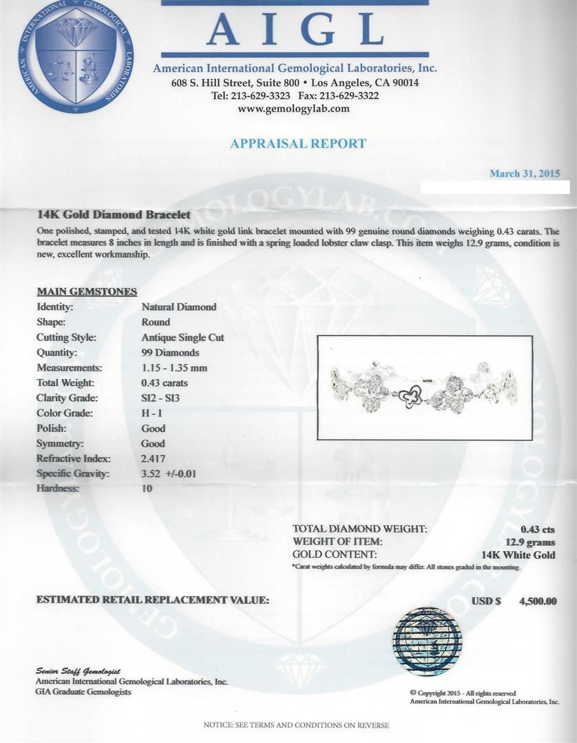 One polished, stamped, and tested 14K white gold link bracelet mounted with 99 genuine round diamonds weighing 0.43 carats. The bracelet measures 8 inches in length and is finished with a spring loaded lobster claw clasp. This item weighs 12.9 grams, condition is new, excellent workmanship. MAIN GEMSTONES: Identity: Natural Diamond. Shape: Round. Cutting Style: Antique Single Cut. Quantity: 99 Diamonds. Measurements: 1.15 - 1.35 mm. Total Weight: 0.43 carats. Clarity Grade: SI2 - SI3. Color Grade: H - I. Polish: Good. Symmetry: Good. Refractive Index: 2.417. Specific Gravity: 3.52 +/-0.01. Hardness: 10. Total Diamond Weight: 0.43 cts. Weight of Item: 12.9 grams. Gold Content: 14K White Gold. AIGL Appraised at $4,500.00.