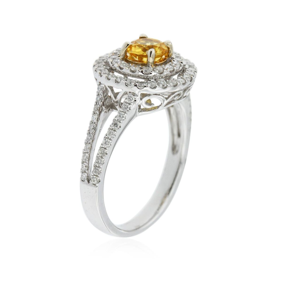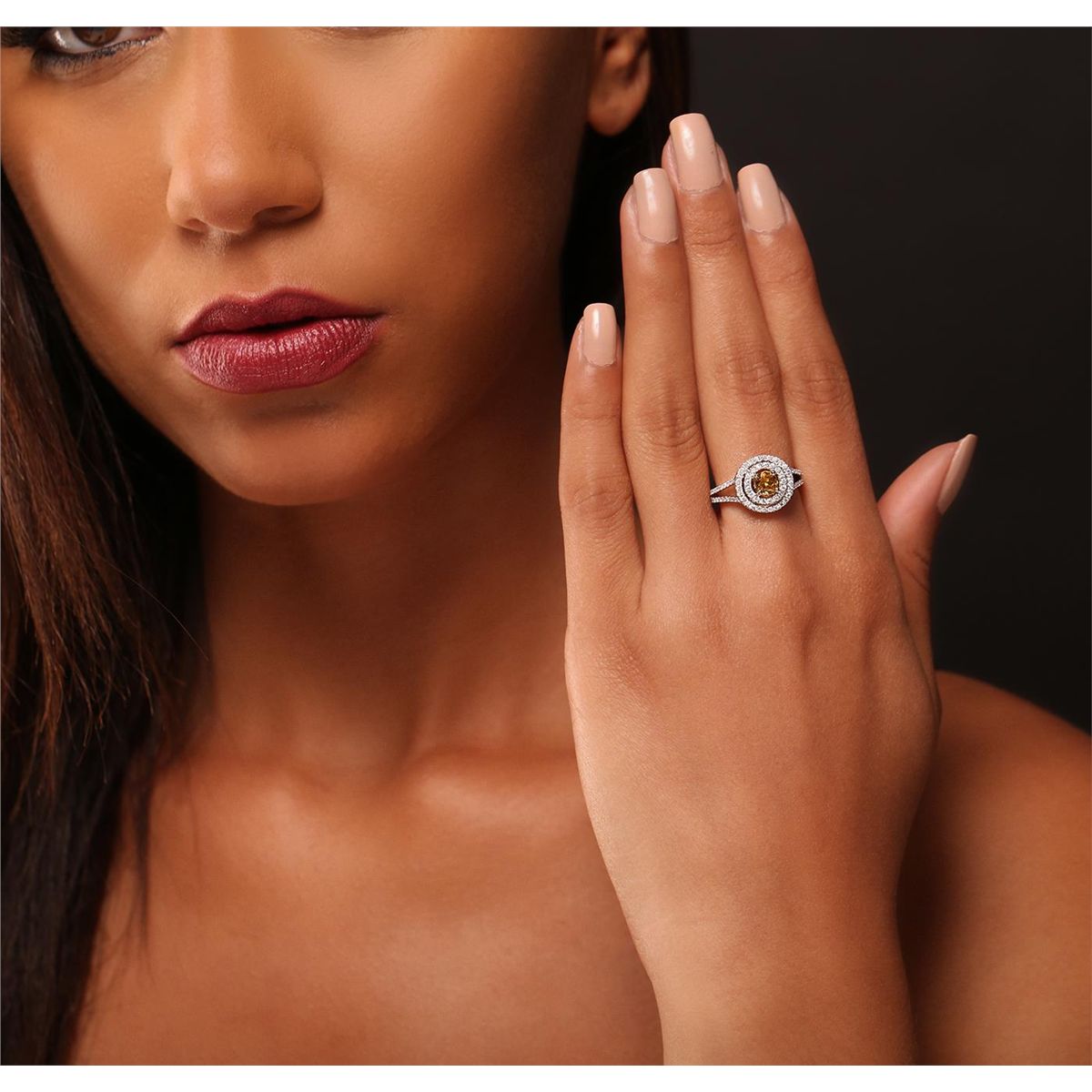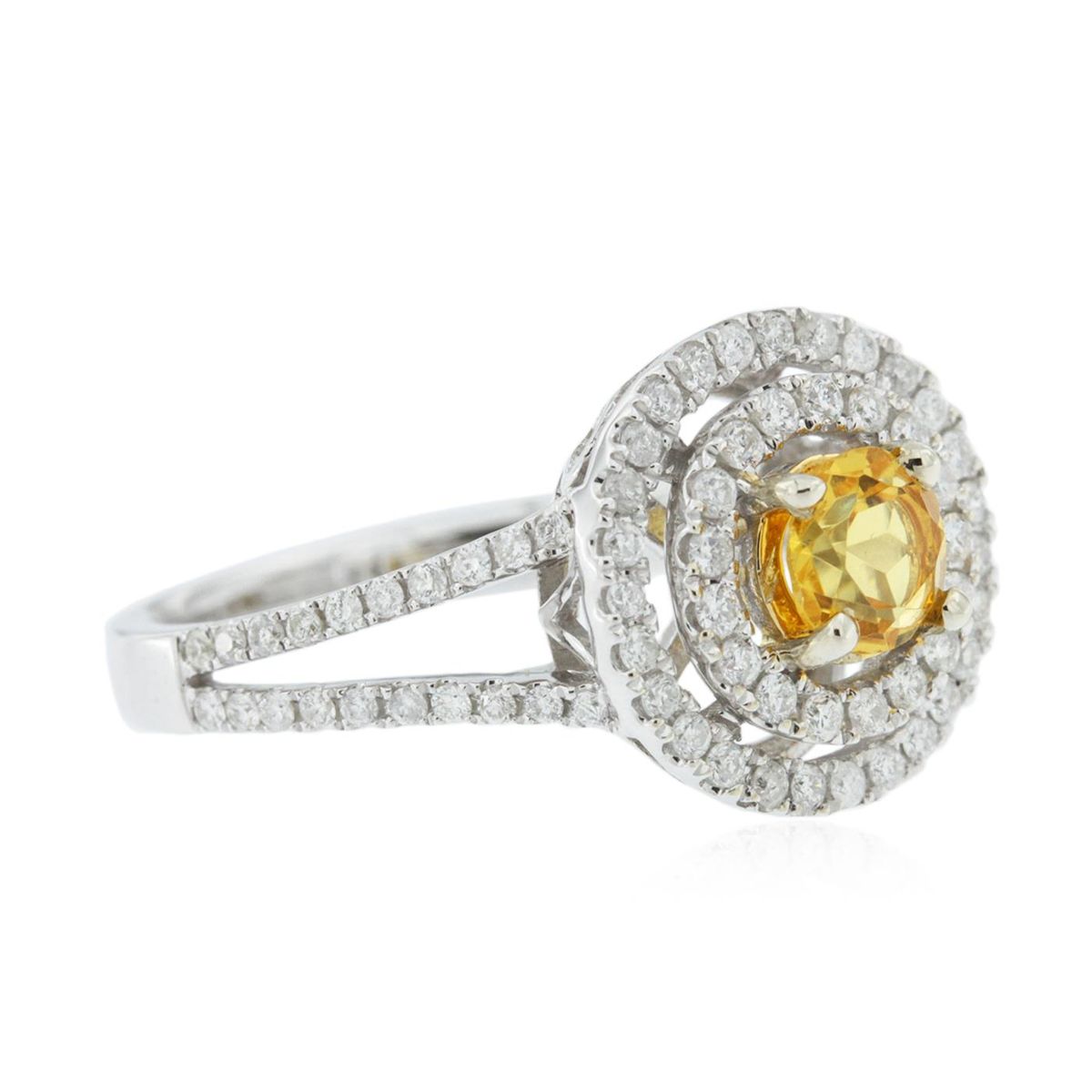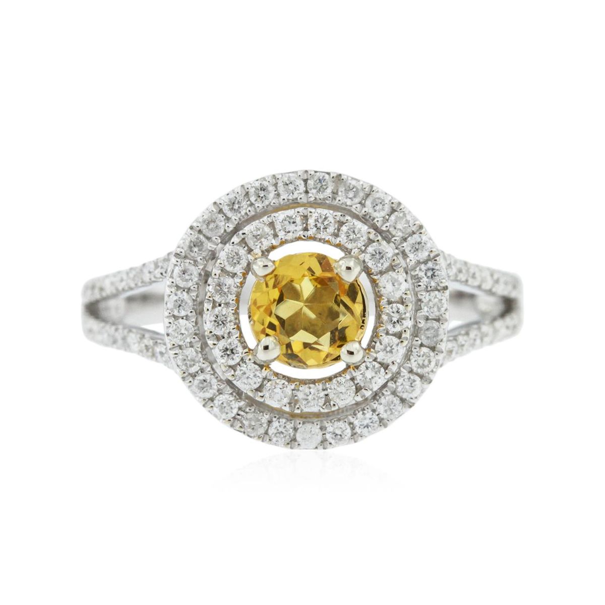 One electronically tested 14KT white gold Ladies combination cast & assembled ring with a bright polish finish. Condition is new. Identified with markings of "14K". Containing: Eighty-Six prong set round brilliant cut diamonds, measuring 1.10 - 1.10 x 1.10mm (depth est.) approximate. Total Weight of 86 Stones = 0.60ct. Clarity: I-1 to I-2. Color: J, Cut is Good. One prong set round modified brilliant cut natural citrine quartz, measuring 5.00 - 5.00 x 3.25 mm, exact weight 0.44ct., clarity is eye clean, medium light, brownish, orangy yellow color, (GIA oY 4/3), cut is very good. Colored gemstones are presumed to have been subjected to commonly used and possible undetectable color/clarity enhancement processes. Total Weight of Colored Stones 0.44ct. Total Weight of Diamonds 0.60ct. Total Weight of Ring 4.20 grams. GGL Appraised at $3,580.00.
