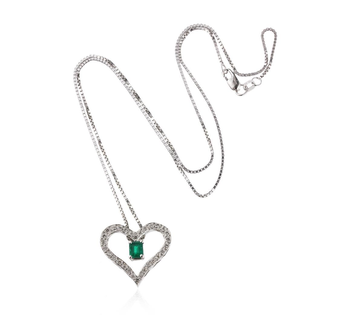 One electronically tested 14KT white gold ladies combination cast & assembled emerald and diamond heart pendant & chain 18.0" long, thin square box link with a lobster claw clasp with a bright polish finish. Condition is new. Containing: One prong set emerald modified step cut natural emerald, measuring 4.80 x 4.12 x 3.11mm, stated weight of 0.45ct., clarity is moderately included, type III, medium, moderately strong, green color, (GIA G 5/4), cut is good. Thirty prong set round brilliant cut diamonds, measuring 1.30 - 1.30 x 0.78mm (depth est.) approximate total weight of 30 Stones = 0.24ct. Clarity: I-1. Color: I - J, Cut is Good. All diamonds and colored gemstones are graded in the mounting, unless otherwise stated. Colored gemstones are presumed to have been subjected to commonly used enhancement processes. Total Weight of Colored Stones 0.45ct. Total Weight of Diamonds 0.24ct. Total Weight of Pendant & Chain 7.30 grams. GGL Appraised at $3,380.00.