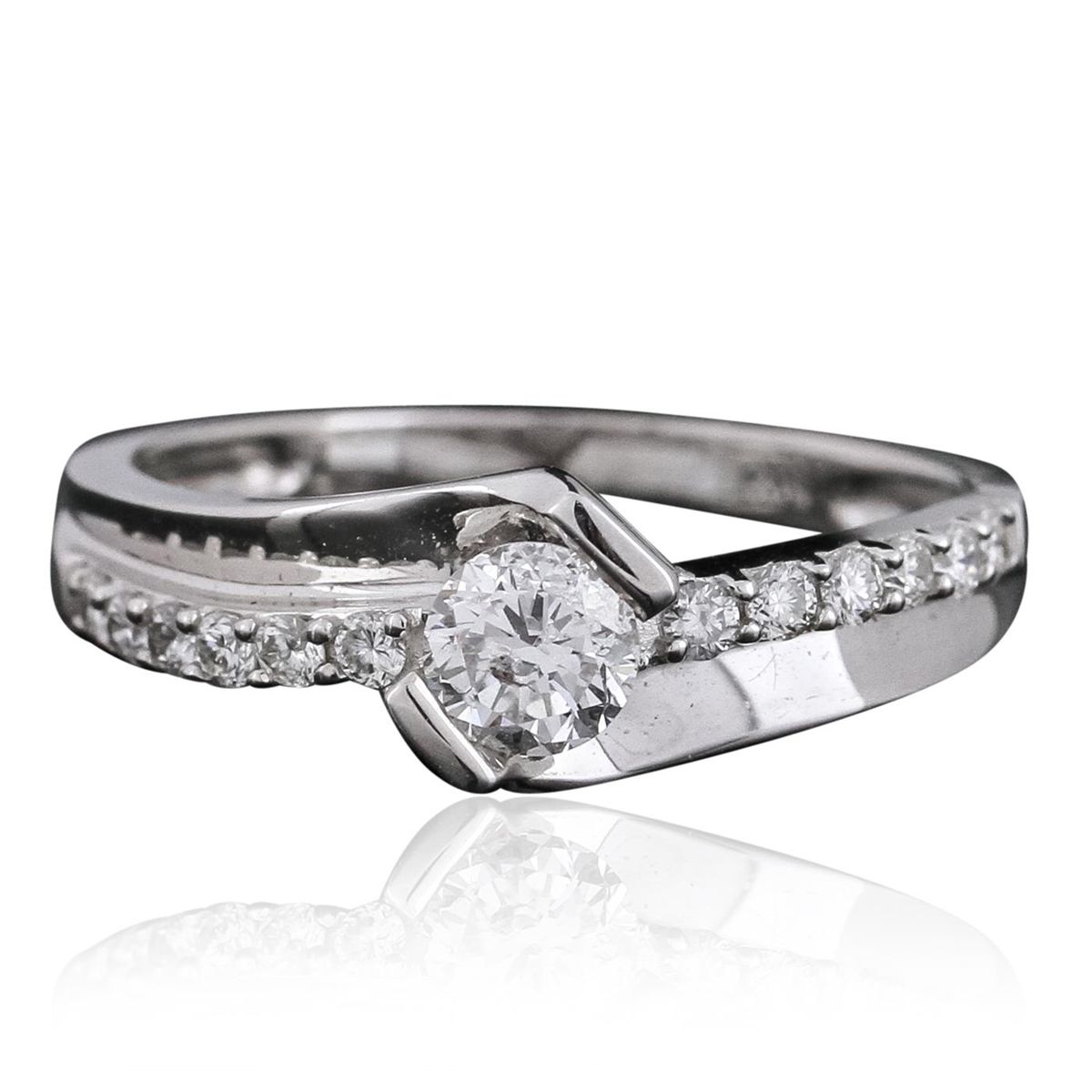 One electronically tested 14KT white gold ladies combination cast & assembled engagement ring with a bright polish finish. Identified with markings of "14K". Condition is new. Containing: One prong set round brilliant cut diamond, measuring 4.40 - 4.40 x 2.64mm (depth est.) approximate weight of 0.31ct. Clarity: I-1. Color: I, Cut is Good. Twelve prong set round brilliant cut diamonds, measuring 1.50 - 1.50 x 0.90mm (depth est.) approximate total weight of 12 Stones = 0.15ct. Clarity: SI-2 to I-1. Color: J, Cut is Good. All diamonds are graded in the mounting, unless otherwise stated. Total Weight of Diamonds 0.46ct. Total Weight of Ring 2.50 grams. GGL Appraised at $3,005.00.