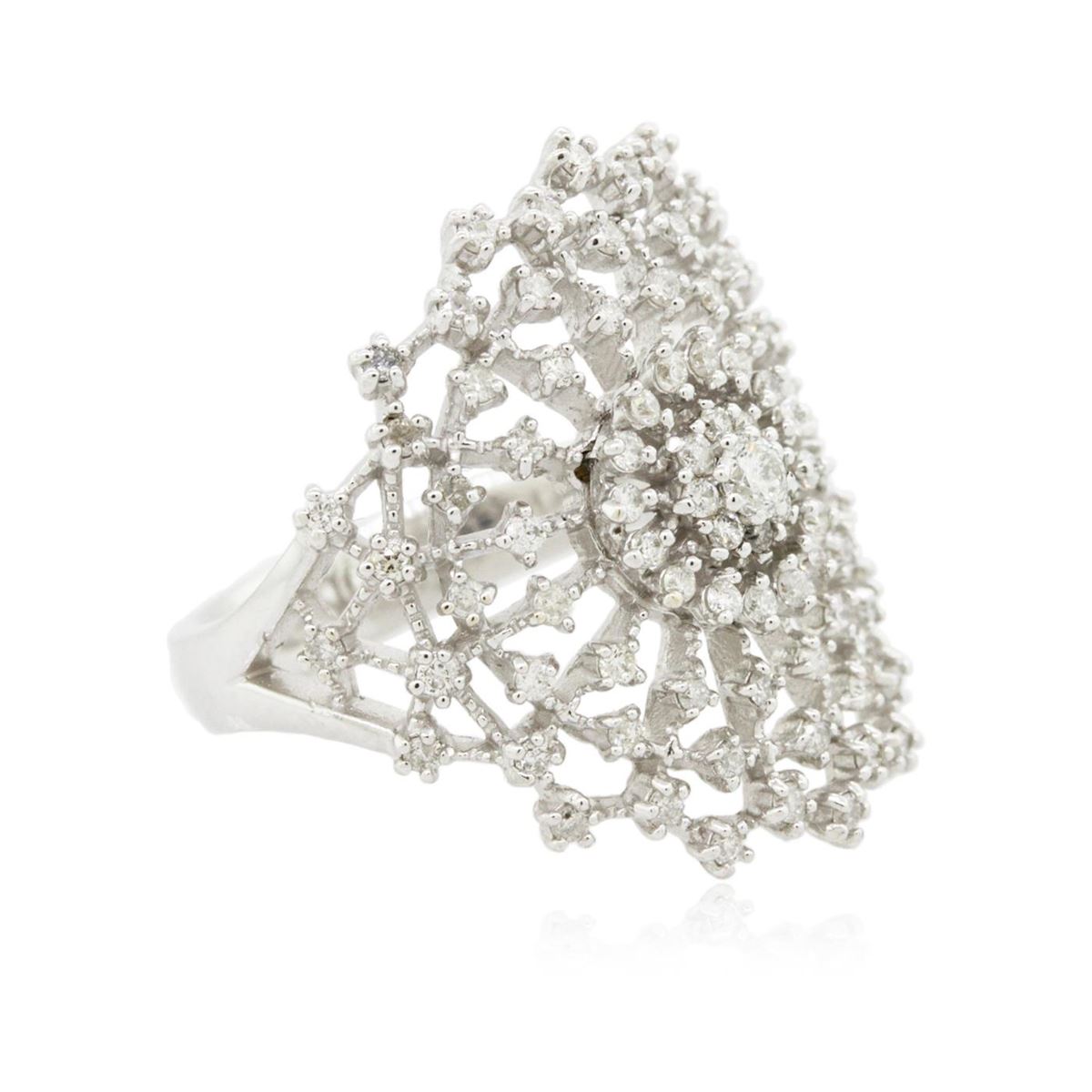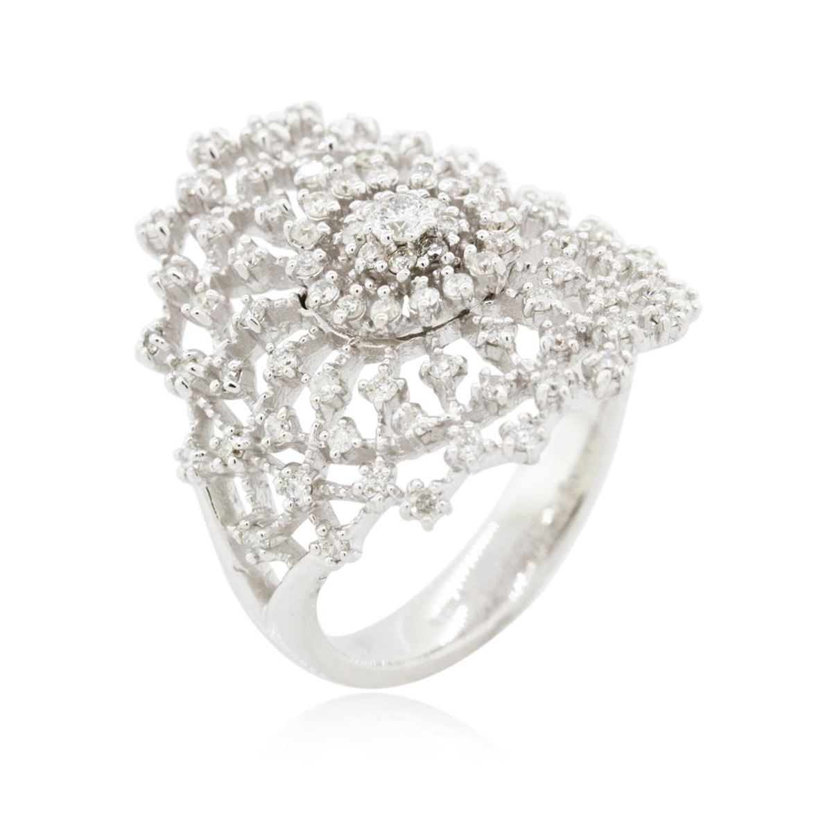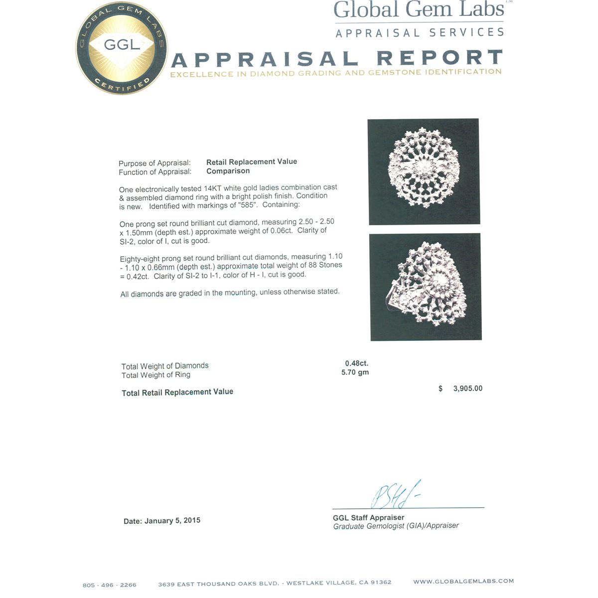 One electronically tested 14KT white gold ladies combination cast & assembled diamond ring with a bright polish finish. Identified with markings of "585". Condition is new. Containing: One prong set round brilliant cut diamond, measuring 2.50 - 2.50 x 1.50mm (depth est.) approximate weight of 0.06ct. Clarity: SI-2. Color: I, Cut is Good. Eighty-Eight prong set round brilliant cut diamonds, measuring 1.10 - 1.10 x 0.66mm (depth est.) approximate total weight of 88 Stones = 0.42ct. Clarity: SI-2 to I-1. Color: H - I, Cut is Good. All diamonds are graded in the mounting, unless otherwise stated. Total Weight of Diamonds 0.48ct. Total Weight of Ring 5.70 grams. GGL Appraised at $3,905.00.