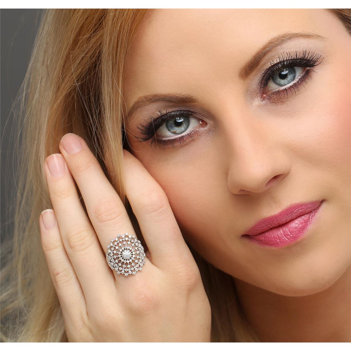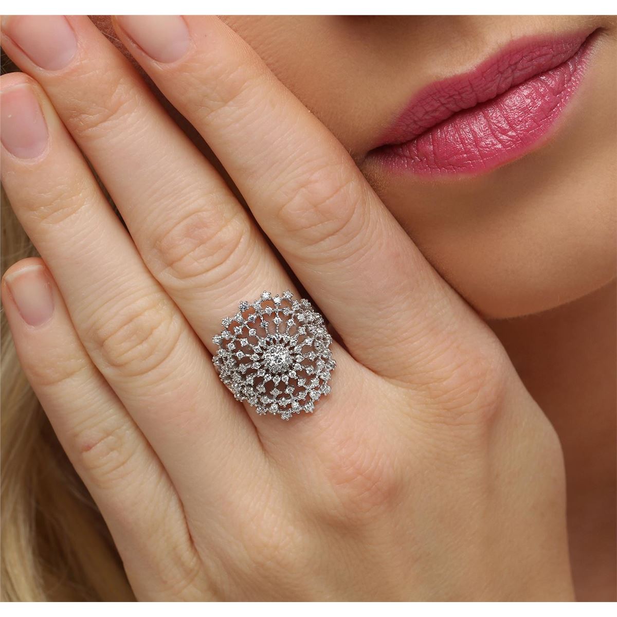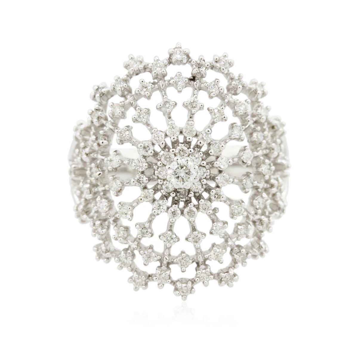 One electronically tested 14KT white gold ladies combination cast & assembled diamond ring with a bright polish finish. Identified with markings of "585". Condition is new. Containing: One prong set round brilliant cut diamond, measuring 2.50 - 2.50 x 1.50mm (depth est.) approximate weight of 0.06ct. Clarity: SI-2. Color: I, Cut is Good. Eighty-Eight prong set round brilliant cut diamonds, measuring 1.10 - 1.10 x 0.66mm (depth est.) approximate total weight of 88 Stones = 0.42ct. Clarity: SI-2 to I-1. Color: H - I, Cut is Good. All diamonds are graded in the mounting, unless otherwise stated. Total Weight of Diamonds 0.48ct. Total Weight of Ring 5.70 grams. GGL Appraised at $3,905.00.