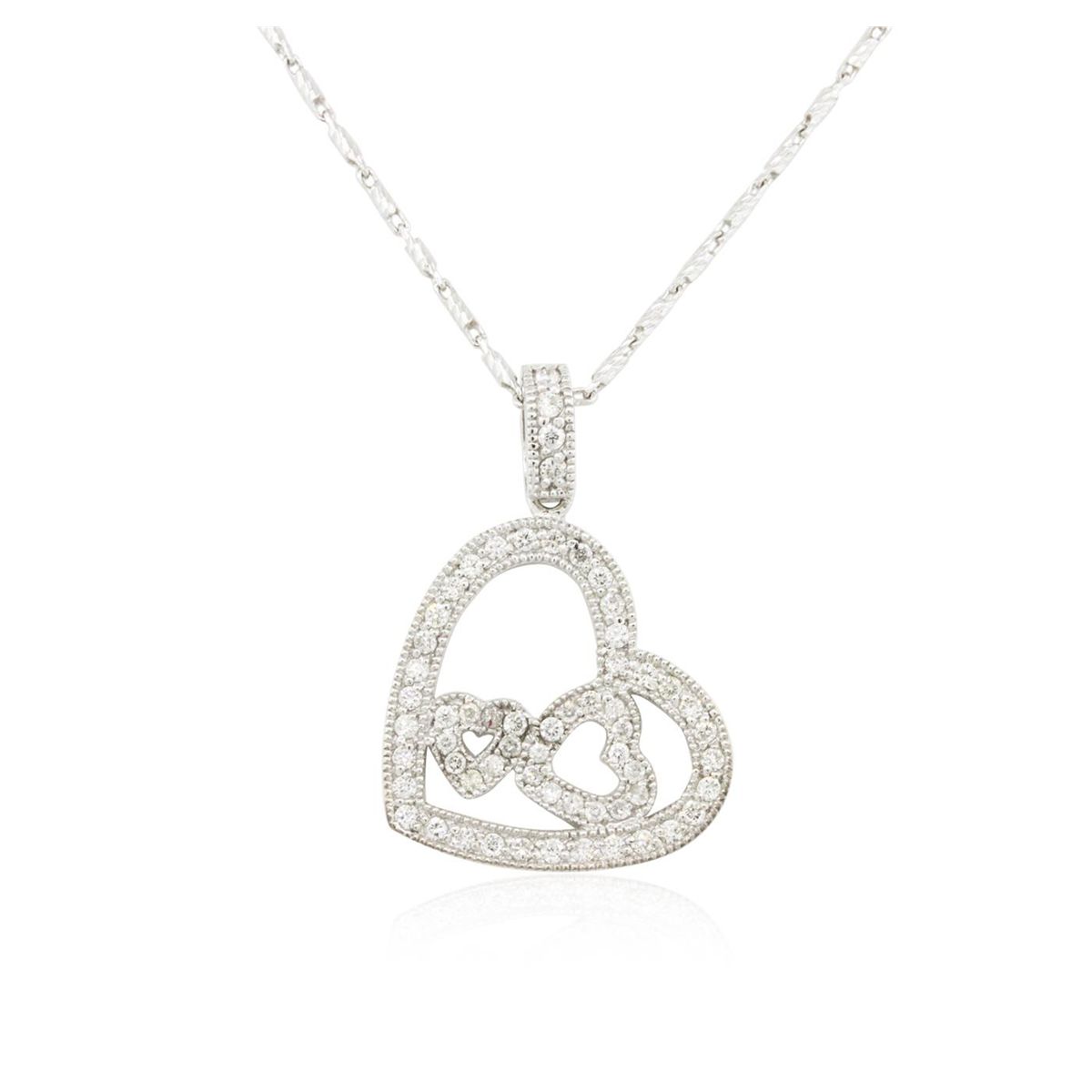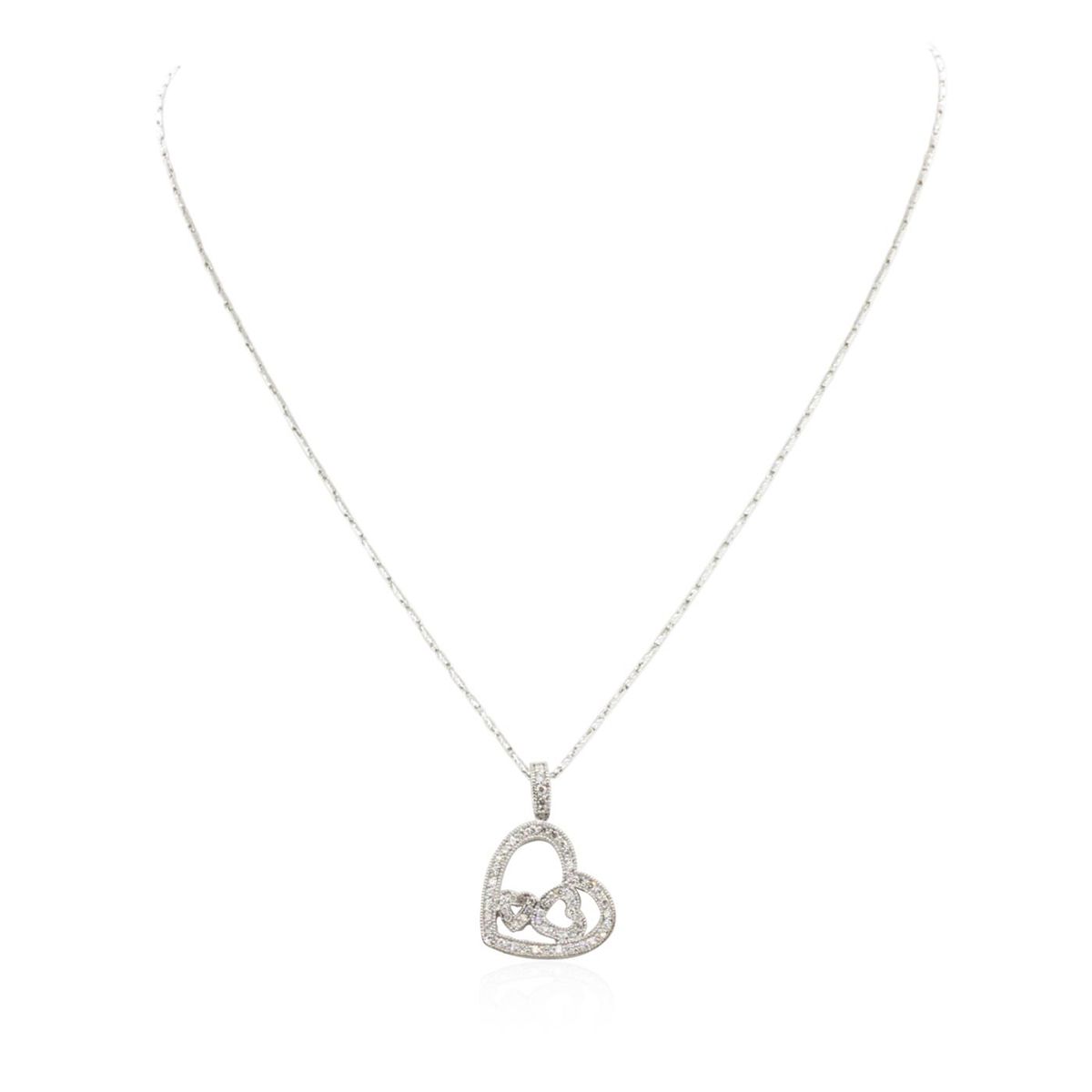 One electronically tested 14KT white gold ladies combination cast & assembled pendant & chain 18.0" long, light fancy link with a lobster claw clasp with a bright polish finish. Identified with markings of "585". Condition is new. Containing: Sixty-One prong set round brilliant cut diamonds, measuring 1.30 - 1.30 x 0.78mm (depth est.) approximate total weight of 61 Stones = 0.49ct. Clarity: I-1 to I-2. Color: I - J, Cut is Good. All diamonds are graded in the mounting, unless otherwise stated. Total Weight of Diamonds 0.49ct. Total Weight of Pendant & Chain 6.60 grams. GGL Appraised at $3,295.00.