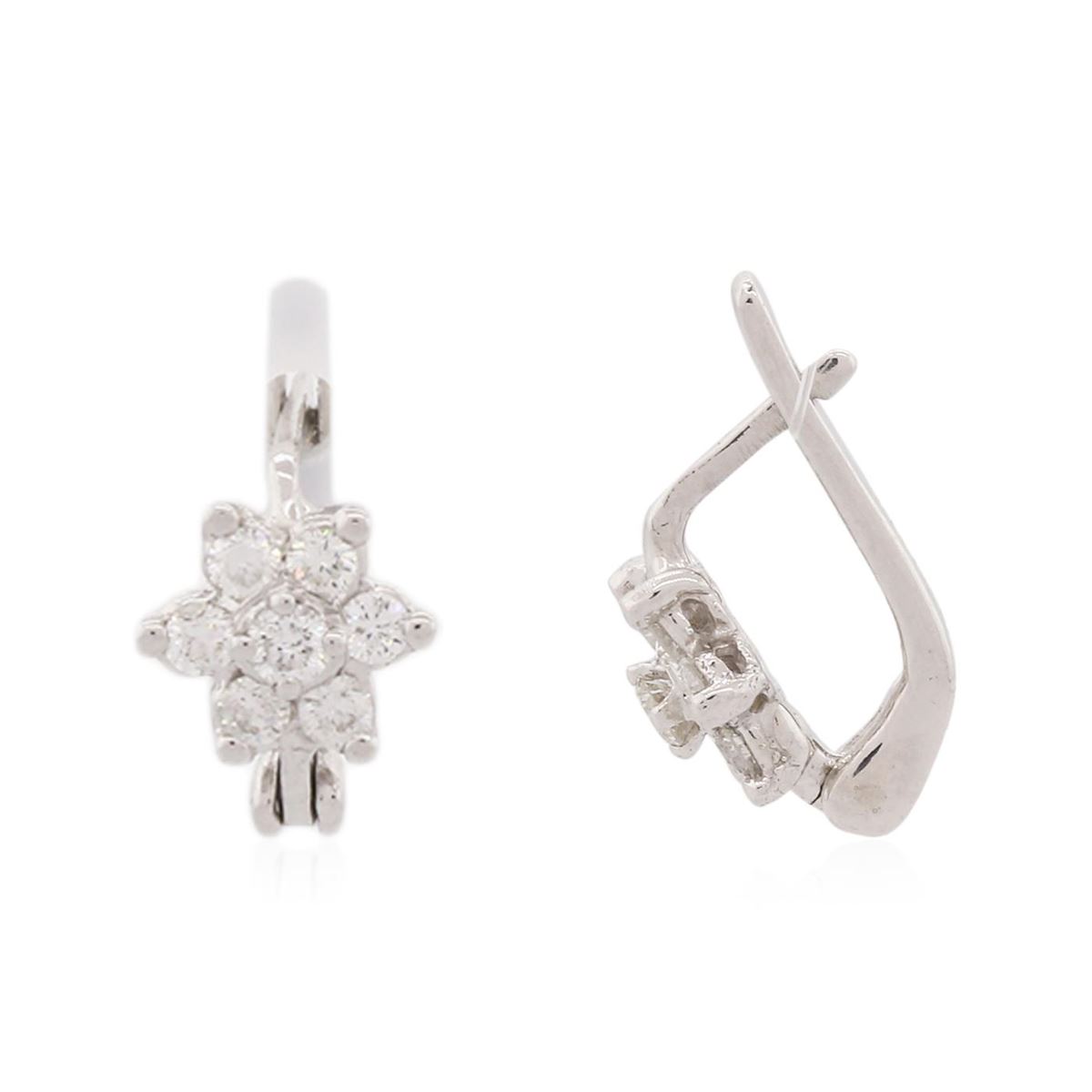 One pair electronically tested 14KT white gold ladies cast diamond earrings with hinged clip backs with a bright polish finish. Identified with markings of "14K". Condition is new. Containing: Fourteen prong set round brilliant cut diamonds, measuring 2.50 - 2.00 x 1.35mm (depth est.) approximate total weight of 14 Stones = 0.50ct. Clarity: SI-1 to SI-2. Color: J - K, Cut is Good. All diamonds are graded in the mounting, unless otherwise stated. Total Weight of Diamonds 0.50ct. Total Weight of Earrings 3.40 grams. GGL Appraised at $1,830.00.