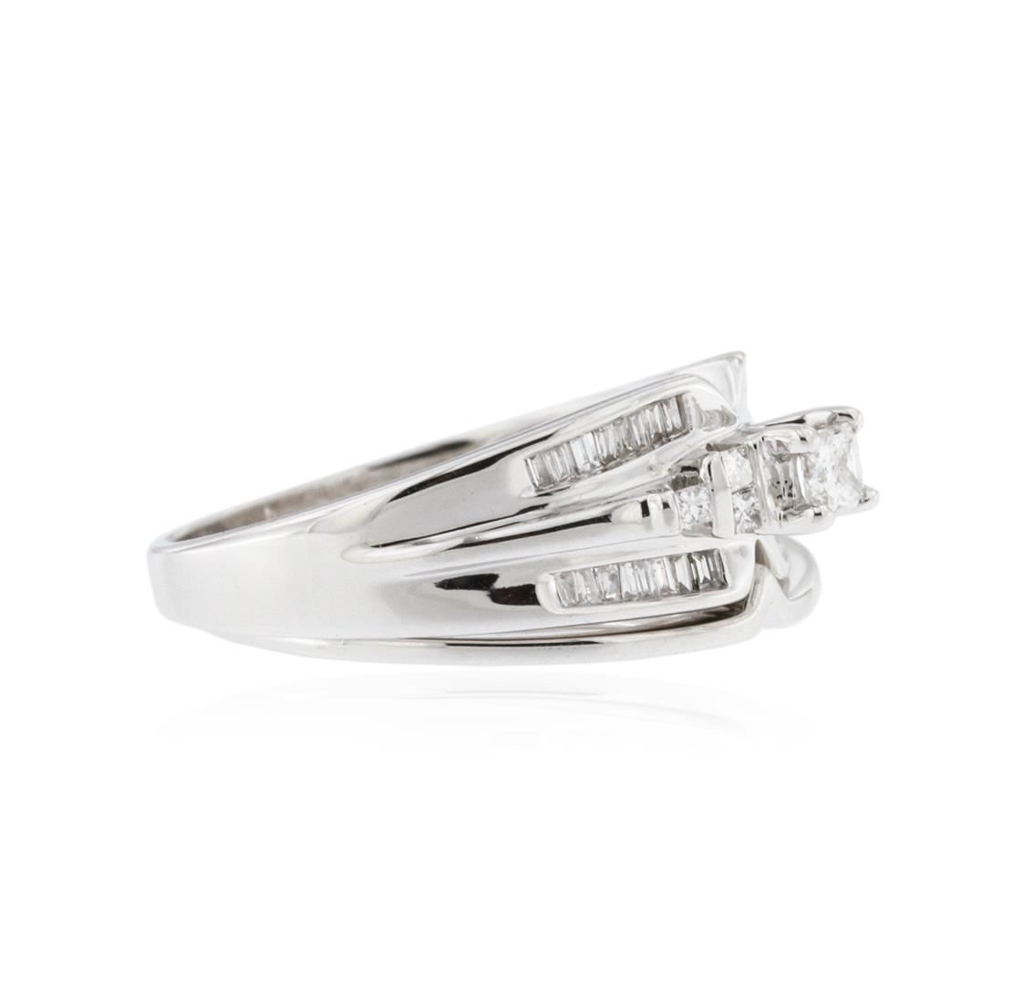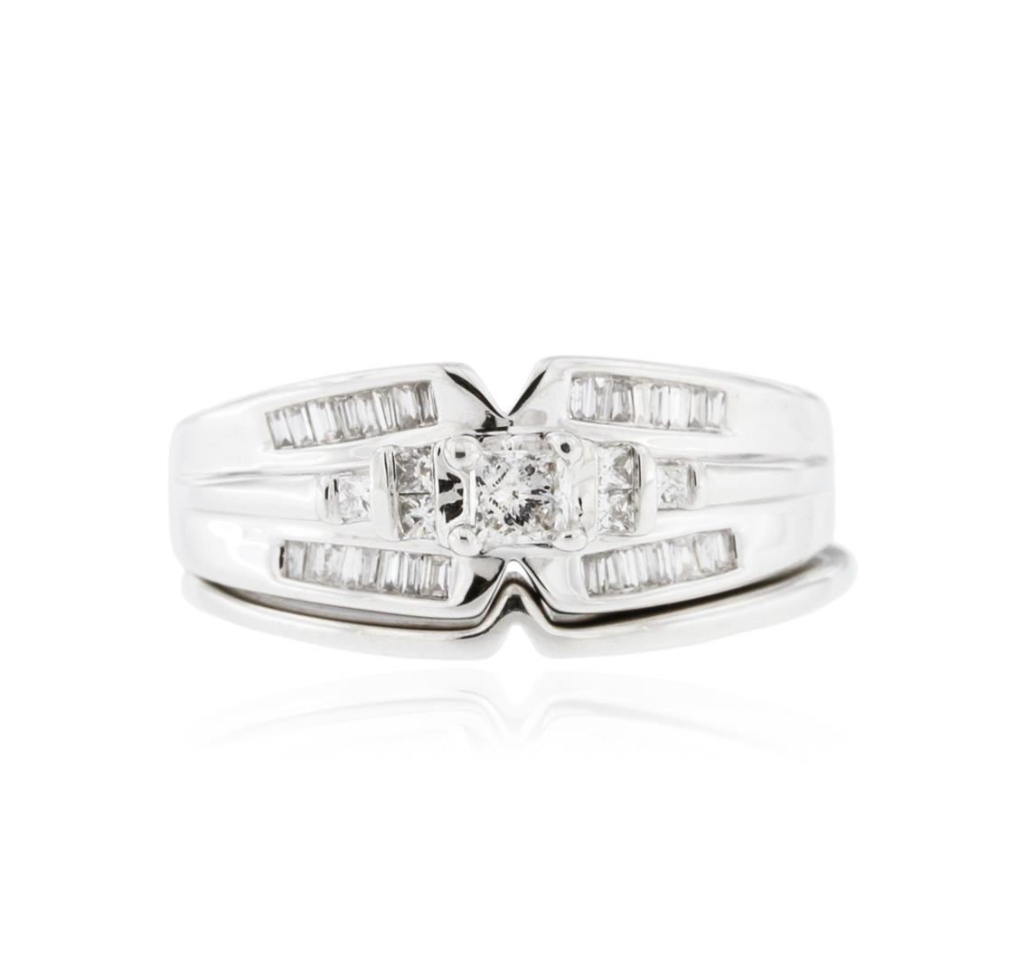 One wedding ring set featuring: 14KT white gold weighing 7.00 grams containing one center diamond with a total weight of 0.15ct and side diamonds with a total weight of 0.35ct.