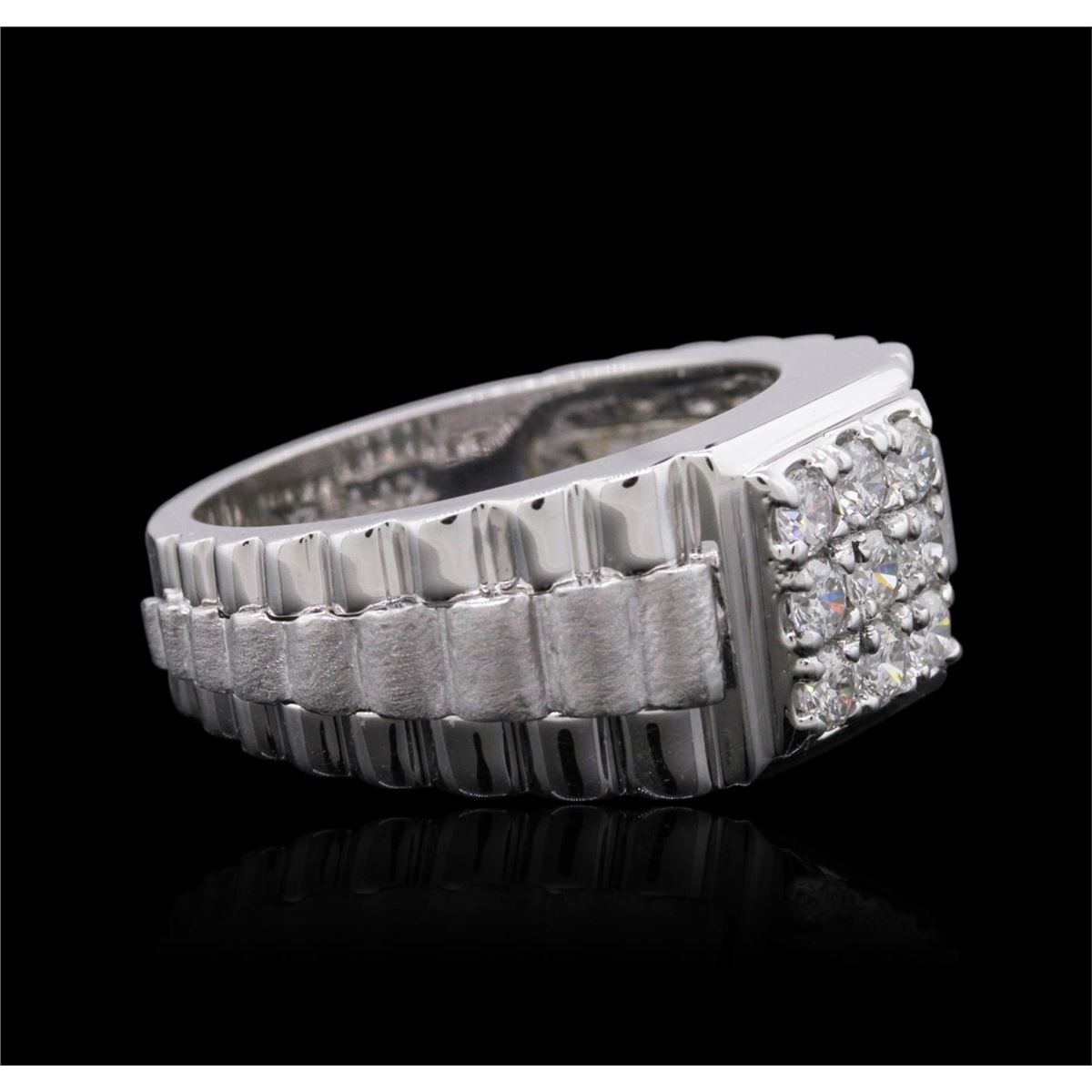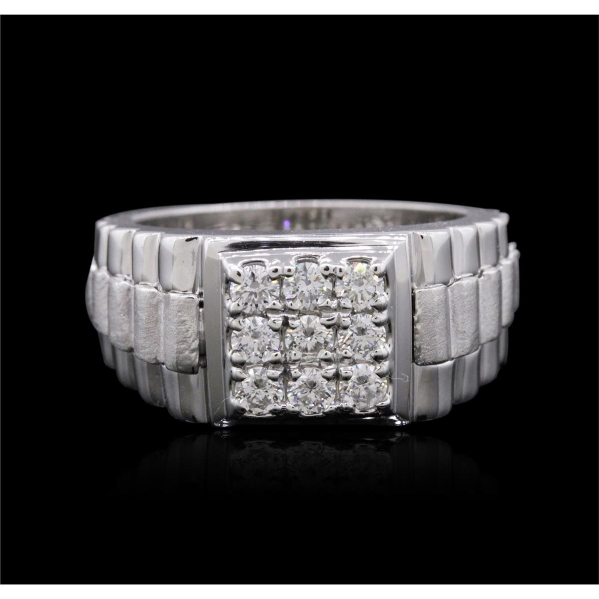 One electronically tested 14KT white gold mens combination cast & assembled diamond ring with a bright polish finish. Identified with markings of "14K". Condition is new. Containing: Nine prong set round brilliant cut diamonds, measuring 2.50 - 2.50 x 1.50mm (depth est.) approximate total weight of 9 Stones = 0.51ct. Clarity: SI-1 to SI-2. Color: H - I, Cut is Good. All diamonds are graded in the mounting, unless otherwise stated. Total Weight of Diamonds 0.51ct. Total Weight of Ring 13.30 grams. GGL Appraised at $4,635.00.