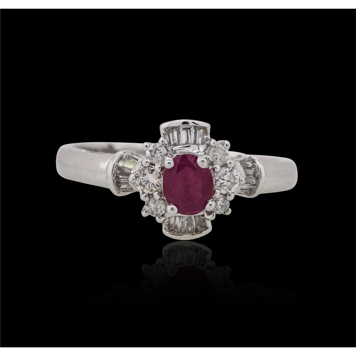 One ring featuring: 14KT white gold weighing 2.55 grams containing one ruby center stone with a total weight of 0.51ct and 18 baguette/round cut diamonds with a total weight of 0.34cts.
