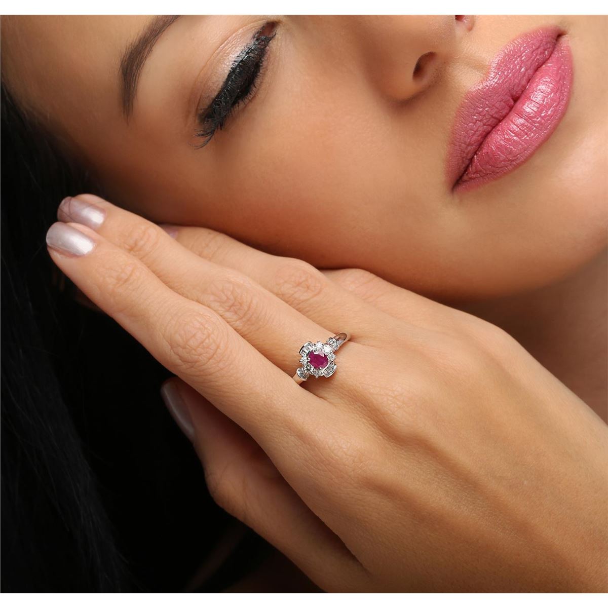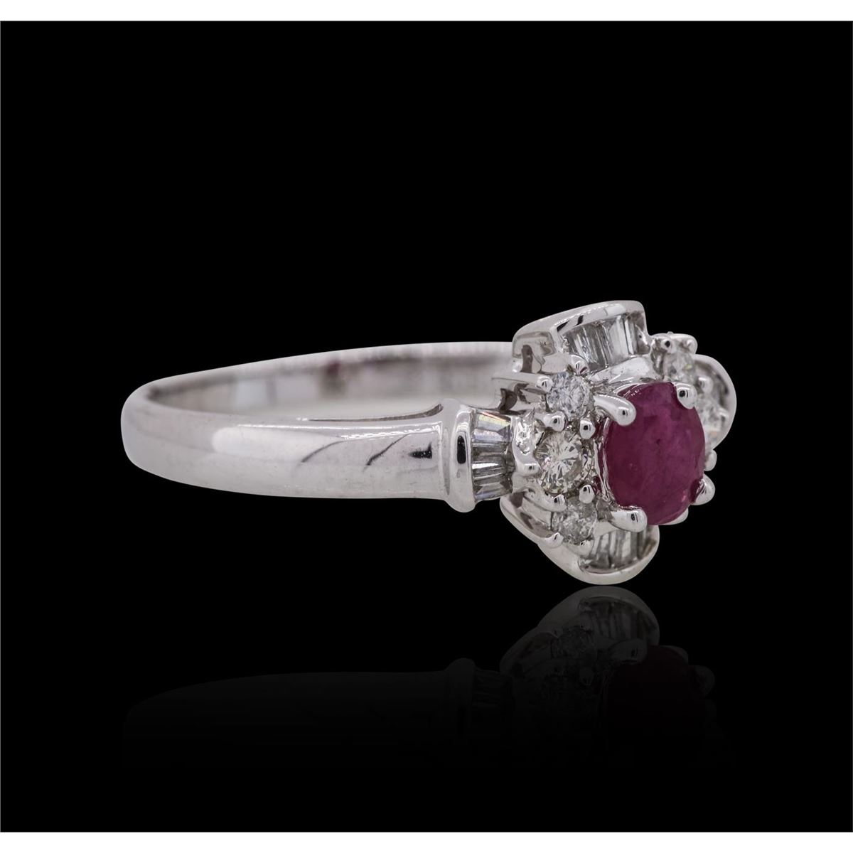 One ring featuring: 14KT white gold weighing 2.55 grams containing one ruby center stone with a total weight of 0.51ct and 18 baguette/round cut diamonds with a total weight of 0.34cts.