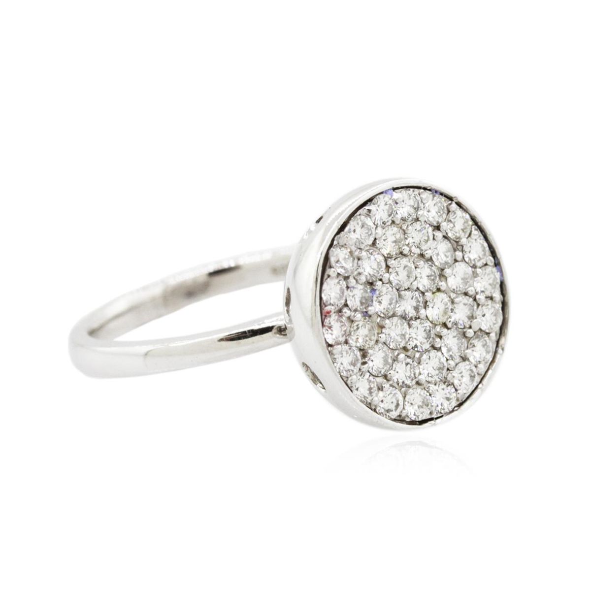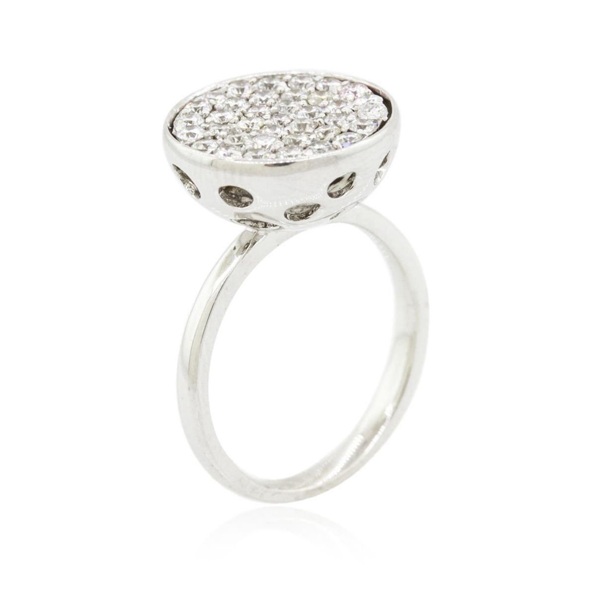 One electronically tested 14KT white gold ladies cast diamond ring with a bright polish finish. Identified with markings of "585". Condition is new. Containing: Thirty-Four prong set round brilliant cut diamonds, measuring 1.60 - 1.60 x 0.96mm (depth est.) approximate total weight of 34 Stones = 0.51ct. Clarity: SI-1 to SI-2. Color: I - J, Cut is Good. All diamonds are graded in the mounting, unless otherwise stated. Total Weight of Diamonds 0.51ct. Total Weight of Ring 5.30 grams. GGL Appraised at $2,985.00.