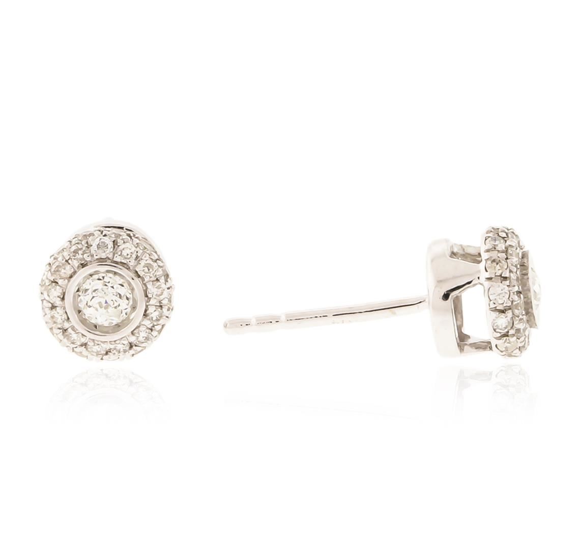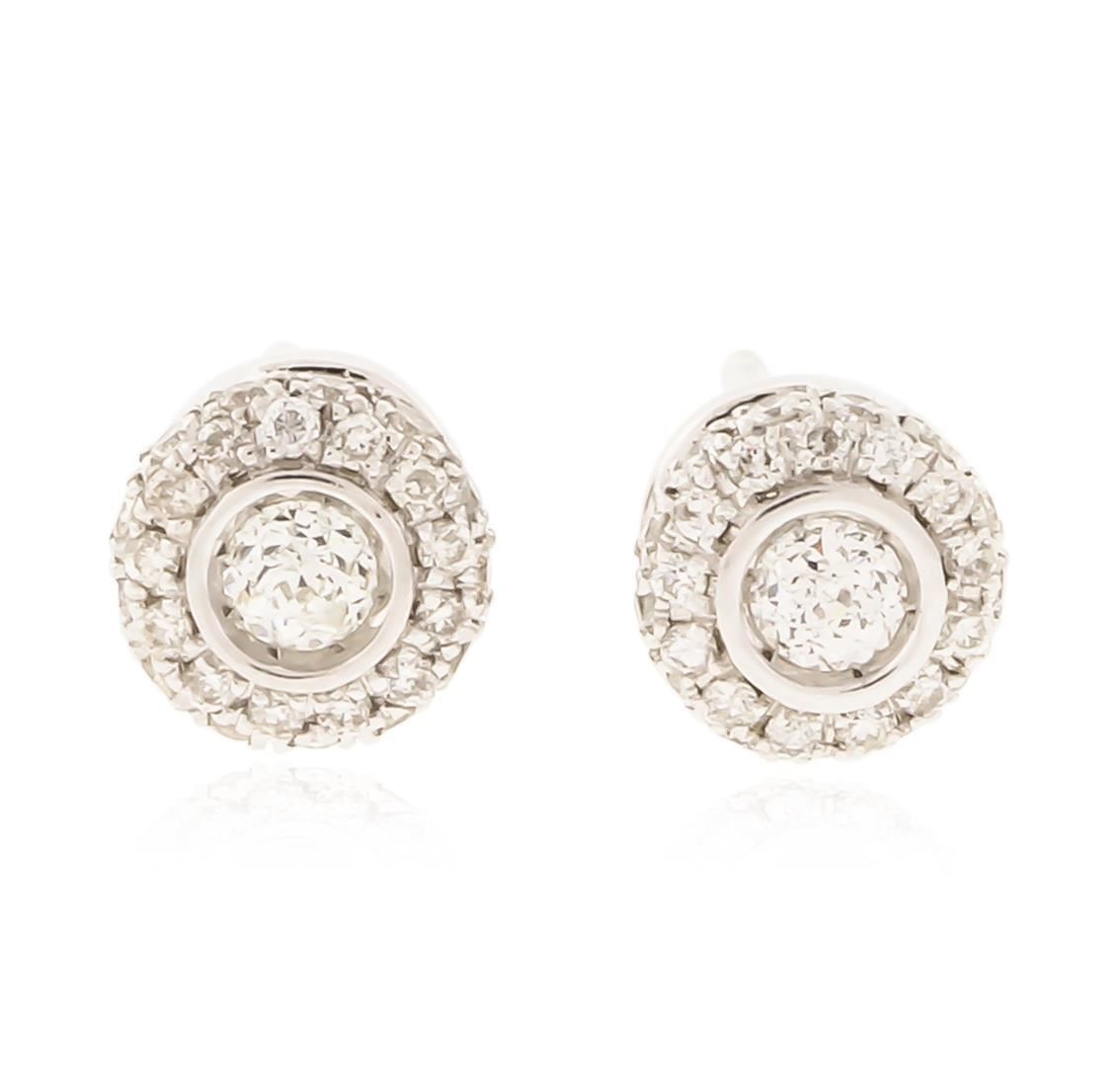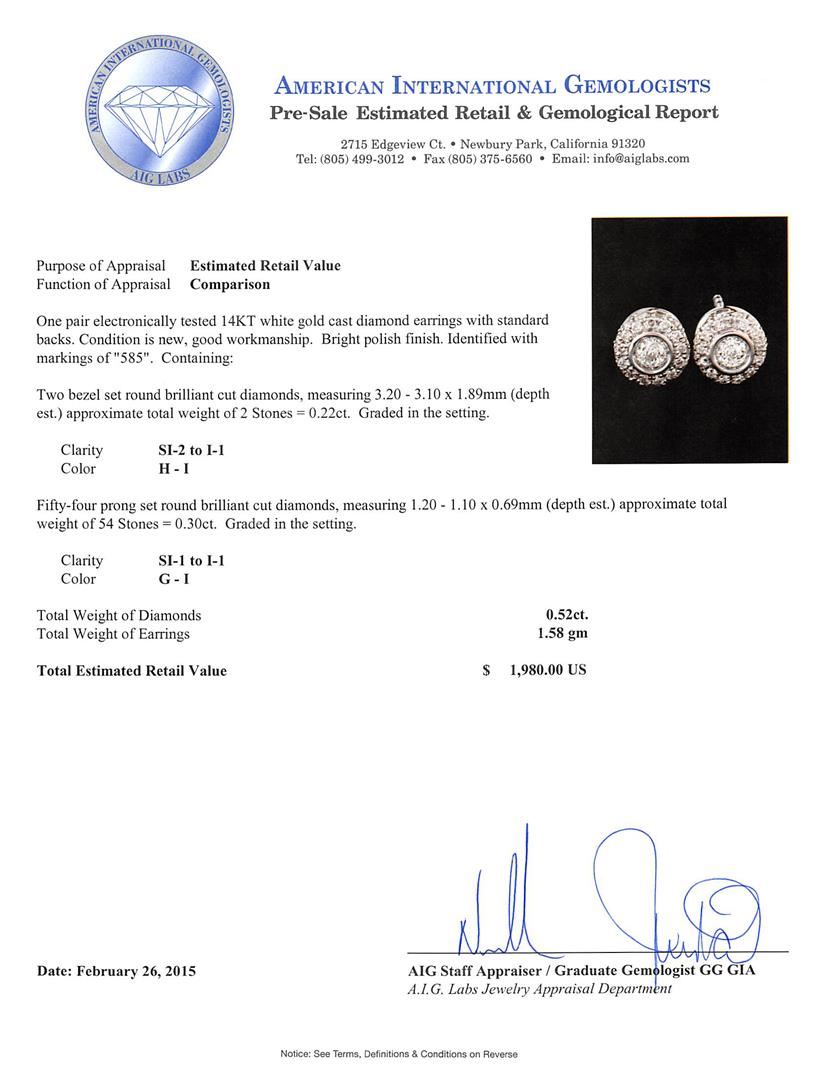 One pair electronically tested 14KT white gold cast diamond earrings with standard backs. Bright polish finish. Identified with markings of "585". Condition is new, good workmanship. Containing: Two bezel set round brilliant cut diamonds, measuring 3.20 - 3.10 x 1.89mm (depth est.) approximate total weight of 2 Stones = 0.22ct. Graded in the setting. Clarity: SI-2 to I-1. Color: H - I Fifty-Four prong set round brilliant cut diamonds, measuring 1.20 - 1.10 x 0.69mm (depth est.) approximate total weight of 54 Stones = 0.30ct. Graded in the setting. Clarity: SI-1 to I-1. Color: G - I. Total Weight of Diamonds 0.52ct. Total Weight of Earrings 1.58 grams. AIG Appraised at $1,980.00.