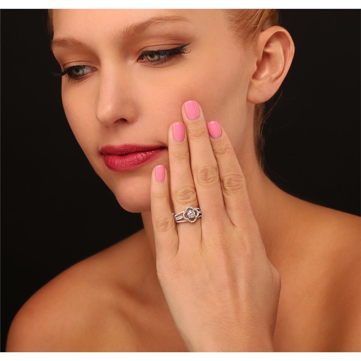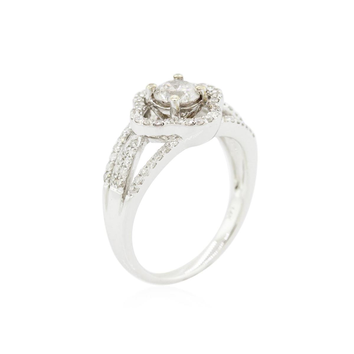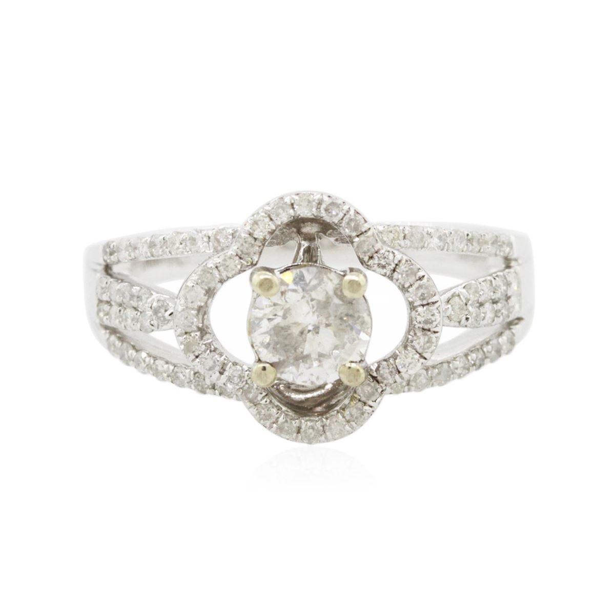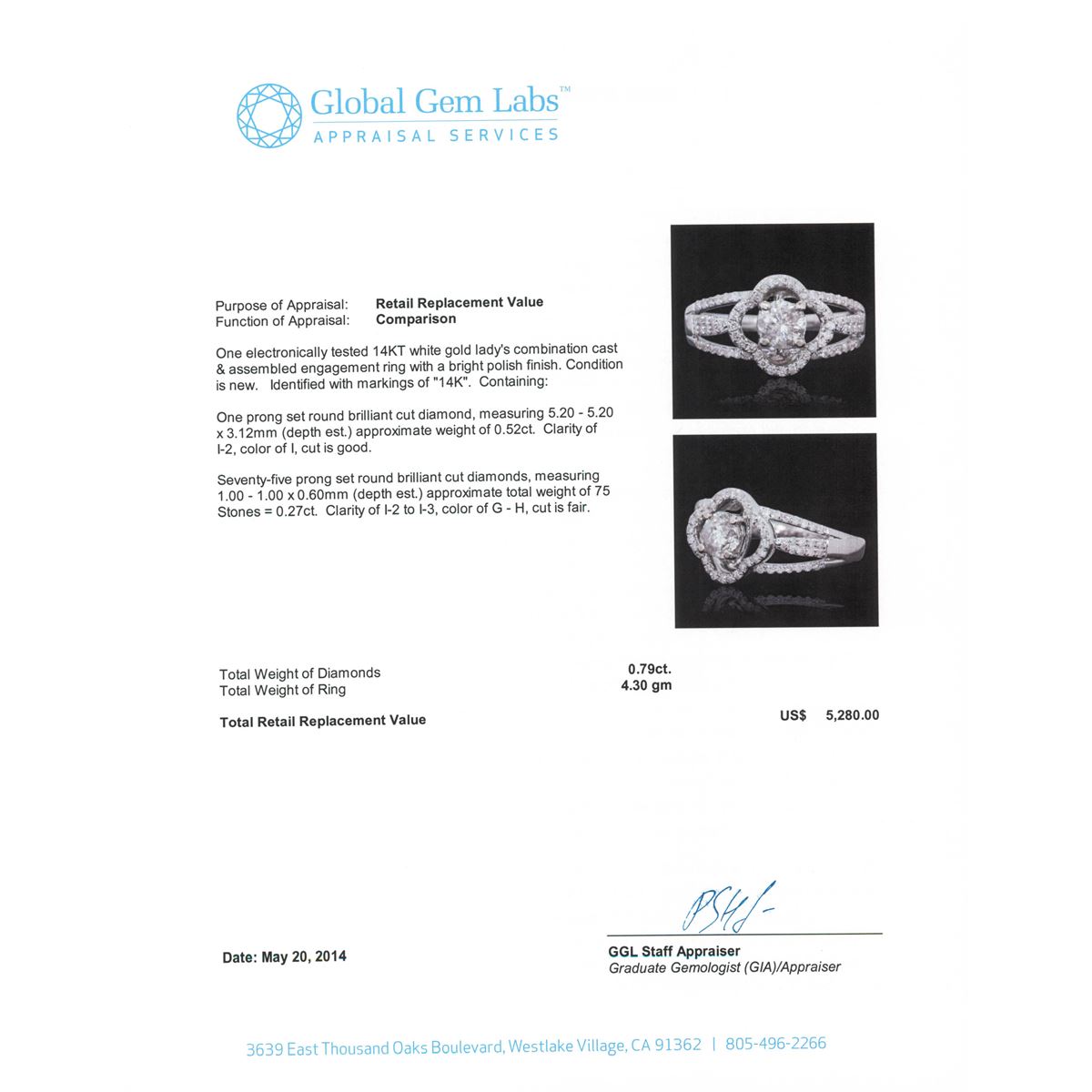 One electronically tested 14KT white gold Ladies combination cast & assembled engagement ring with a bright polish finish. Condition is new. Identified with markings of "14K". Containing: One prong set round brilliant cut diamond, measuring 5.20 - 5.20 x 3.12mm (depth est.) approximate weight of 0.52ct. Clarity: I-2. Color: I, Cut is Good. Seventy-Five prong set round brilliant cut diamonds, measuring 1.00 - 1.00 x 0.60mm (depth est.) approximate. Total Weight of 75 Stones = 0.27ct. Clarity: I-2 to I-3. Color: G - H, Cut is Fair. Total Weight of Diamonds 0.79ct. Total Weight of Ring 4.30 grams. GGL Appraised at $5,280.00.