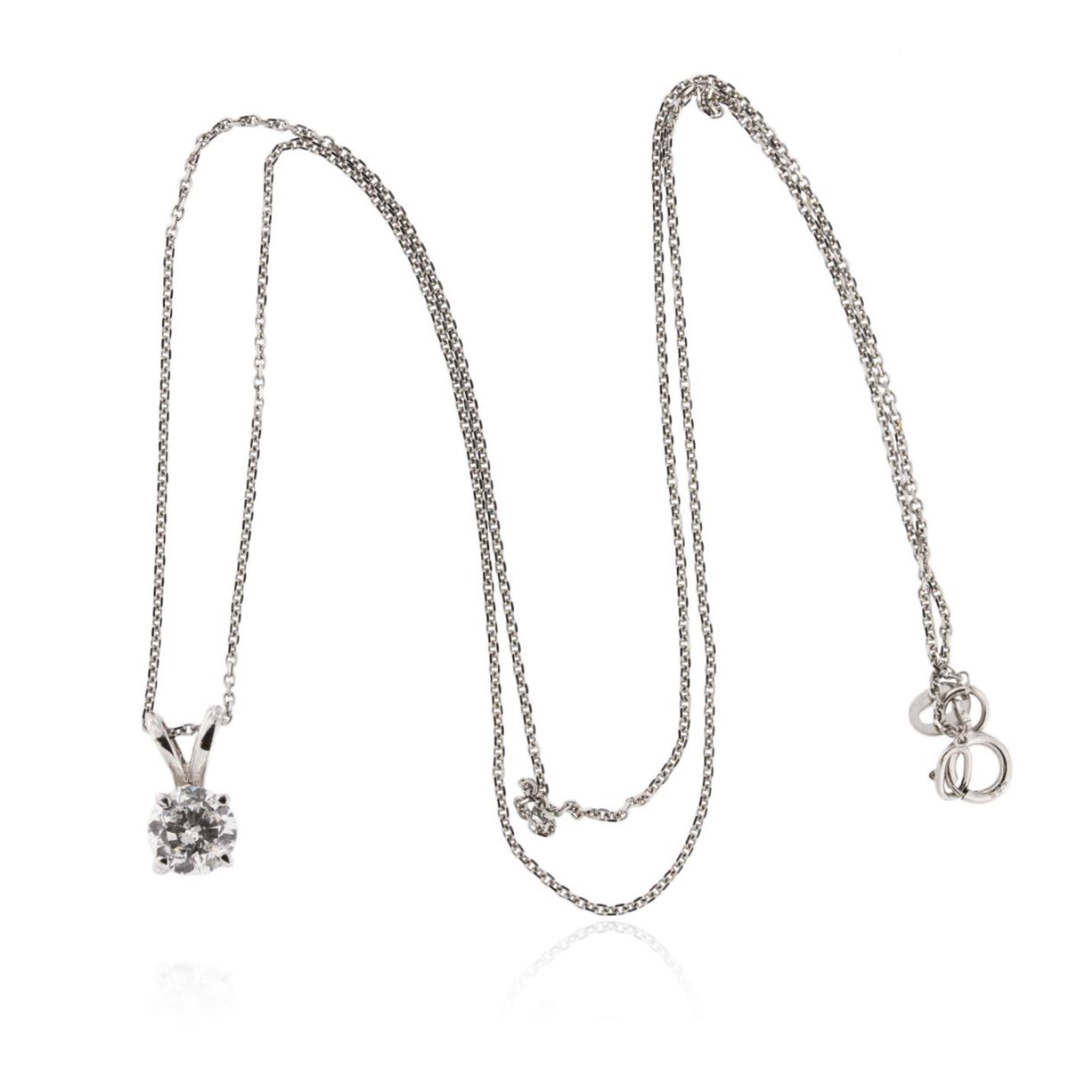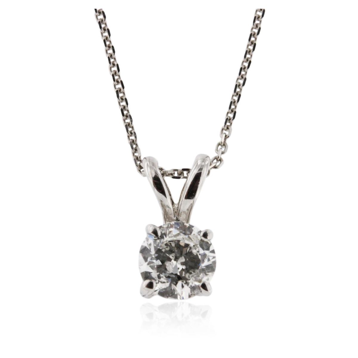 One electronically tested 14KT white gold Ladies die struck & assembled pendant & chain 16.0" long, light open cable link with a spring ring clasp with a bright polish finish. Identified with markings of "14K". Condition is excellent. Containing: One prong set round brilliant cut diamond, measuring 5.20 - 5.20 x 3.12mm (depth est.) approximate weight of 0.53ct. Clarity of I-2, Color of I, Cut is Good. Total Weight of Diamonds 0.53ct. Total Weight of Pendant & Chain 1.60gm. GGL Appraised at $3,450.00.