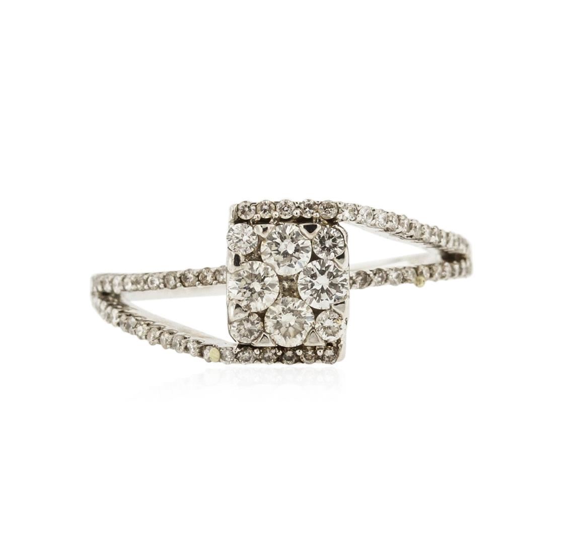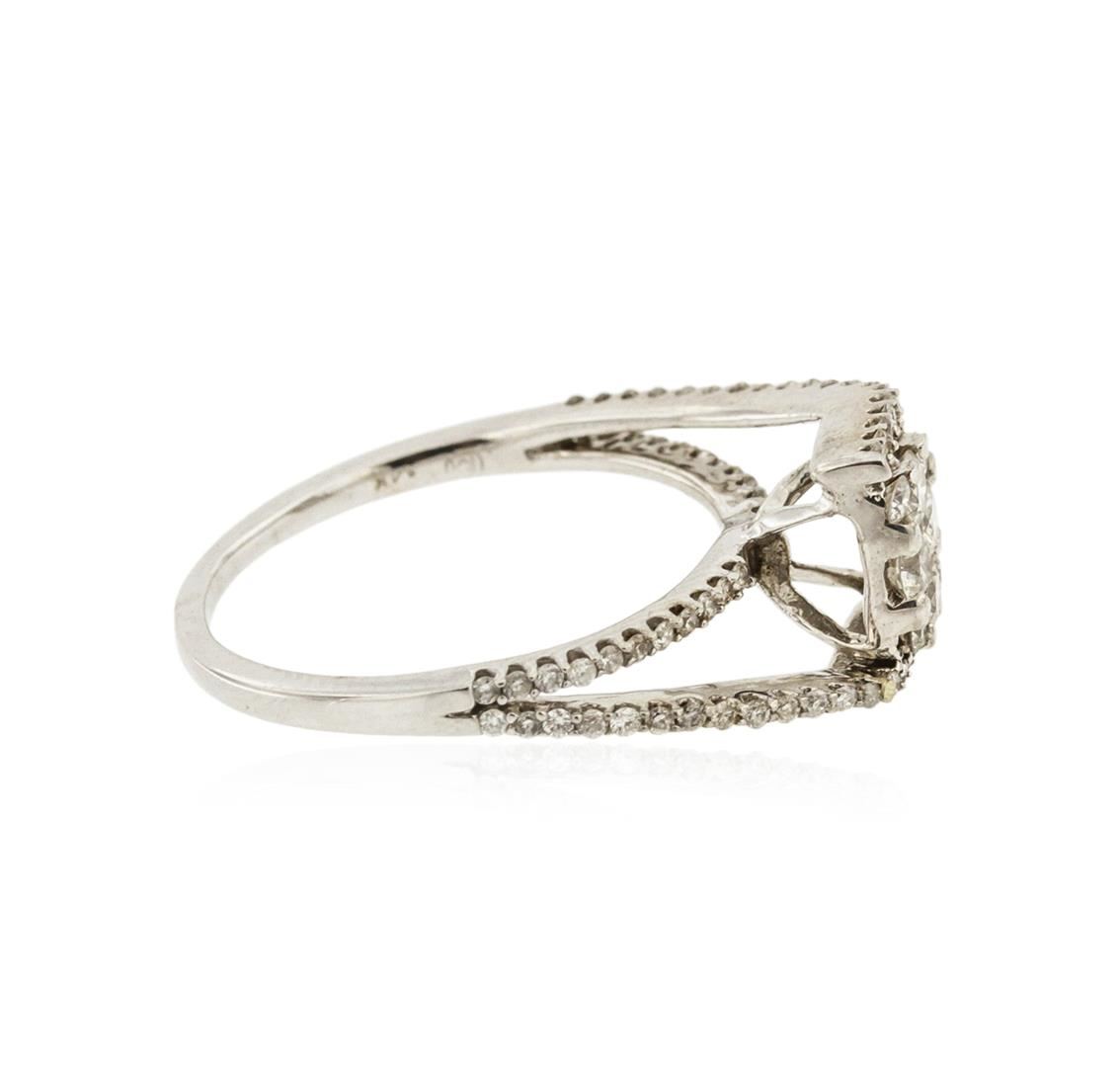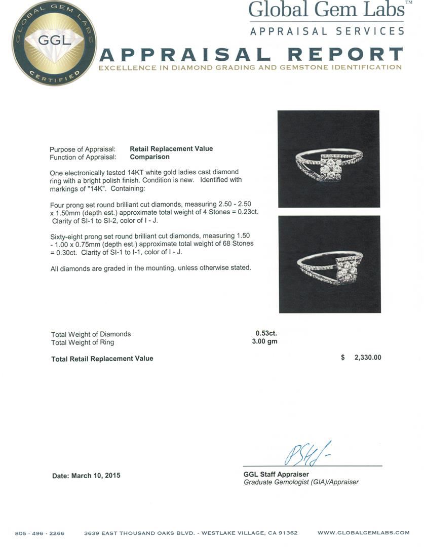 One electronically tested 14KT white gold ladies cast diamond ring with a bright polish finish. Identified with markings of "14K". Condition is new. Containing: Four prong set round brilliant cut diamonds, measuring 2.50 - 2.50 x 1.50mm (depth est.) approximate total weight of 4 Stones = 0.23ct. Clarity: SI-1 to SI-2. Color: I - J. Sixty-Eight prong set round brilliant cut diamonds, measuring 1.50 - 1.00 x 0.75mm (depth est.) approximate total weight of 68 Stones = 0.30ct. Clarity: SI-1 to I-1. Color: I - J. All diamonds are graded in the mounting, unless otherwise stated. Total Weight of Diamonds 0.53ct. Total Weight of Ring 3.00 grams. GGL Appraised at $2,330.00.