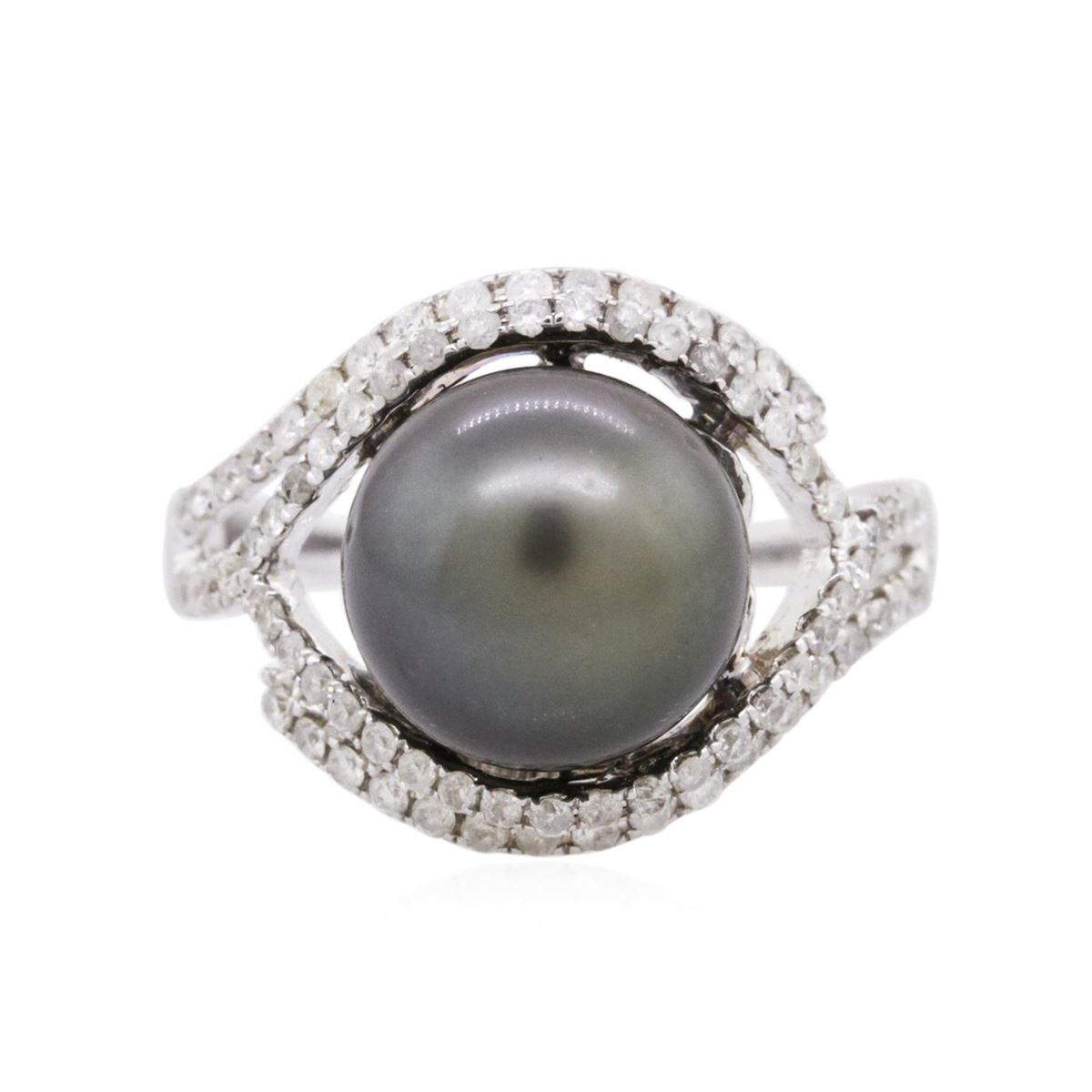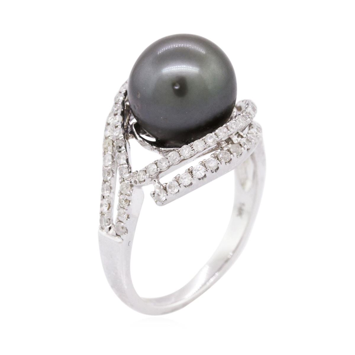 One electronically tested 14KT white gold ladies combination cast & assembled pearl and diamond ring with a split shank with a bright polish finish. Identified with markings of "14K". Condition is new. Containing: Eighty-Four prong set round brilliant cut diamonds, measuring 1.30 - 1.10 x 0.72mm (depth est.) approximate total weight of 84 Stones = 0.53ct. Clarity: I-1 to I-2. Color: I - J, Cut is Good. One Tahitian pearl, 10.3mm in size to 10.3mm in size. The pearl is black in color with a good luster, round, moderately blemished Colored gemstones are presumed to have been subjected to commonly used enhancement processes. All diamonds and colored gemstones are graded in the mounting, unless otherwise stated. Total Weight of Diamonds 0.53ct. Total Weight of Ring 5.70 grams. GGL Appraised at $3,605.00.