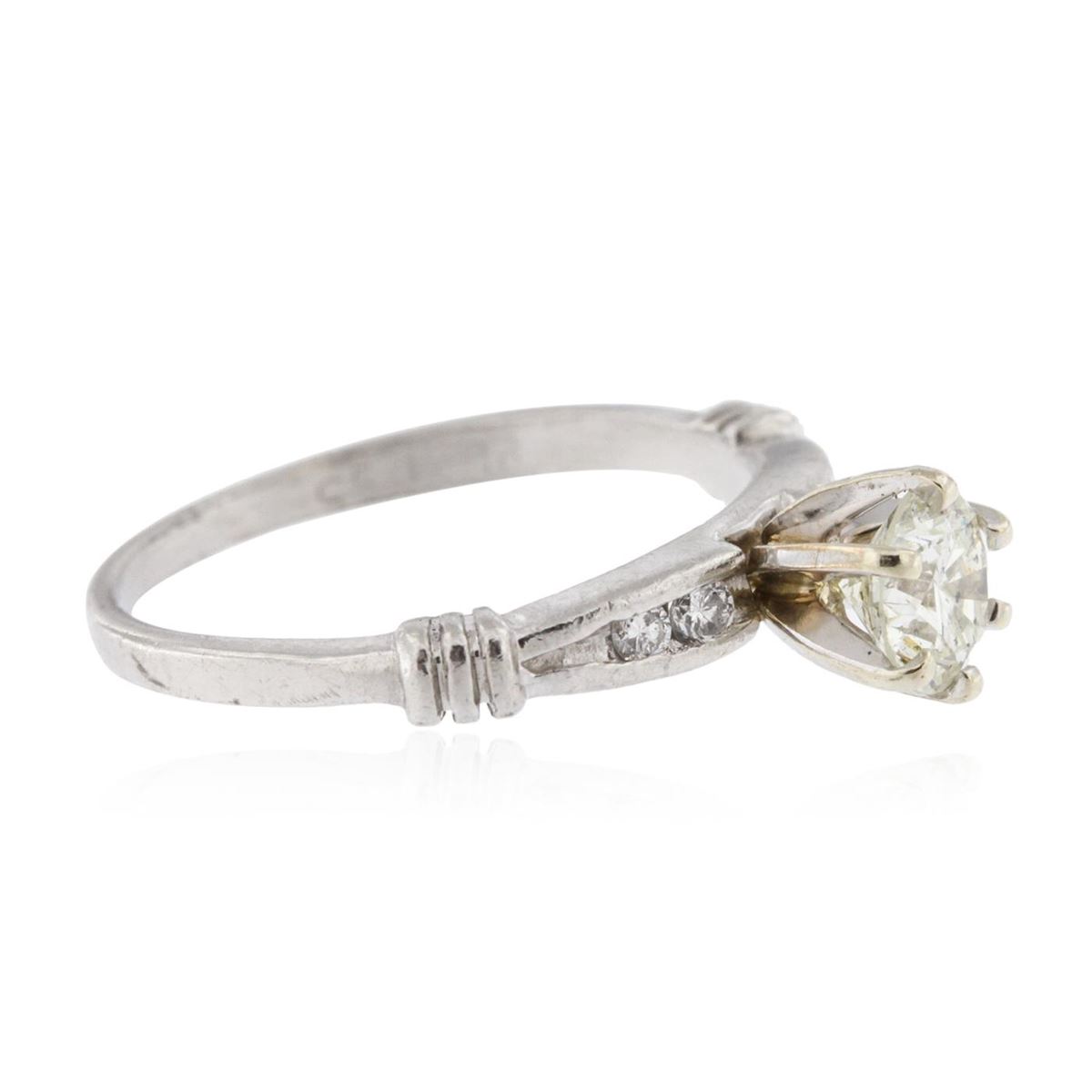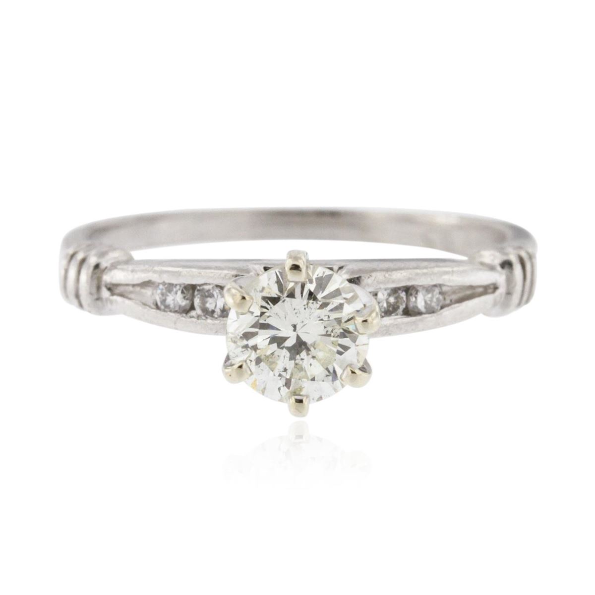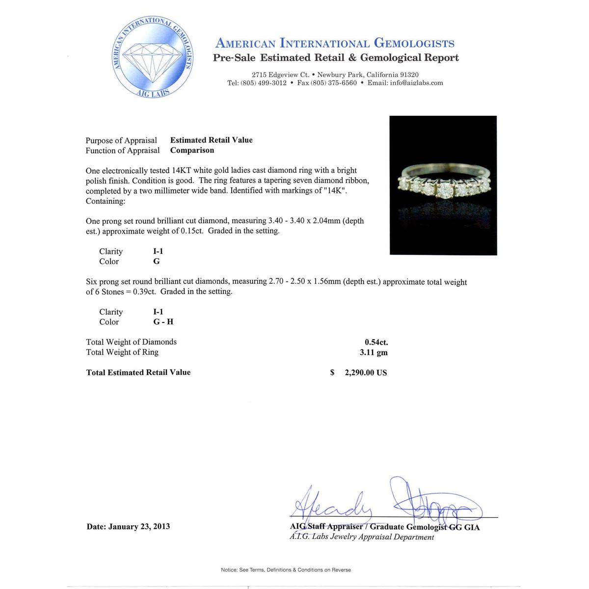 14KT White Gold 0.54ct Diamond Ring A4758 .  One electronically tested 14KT white gold ladies cast diamond ring with a bright polish finish. Condition is good. The ring features a tapering seven diamond ribbon, completed by a two millimeter wide band. Identified with markings of "14K". Containing: One prong set round brilliant cut diamond, measuring 3.40 - 3.40 x 2.04mm (depth est.) approximate weight of 0.15ct. Graded in the setting. Clarity I-1. Color G. Six prong set round brilliant cut diamonds, measuring 2.70 - 2.50 x 1.56mm (depth est.) approximate weight of 6 stones = 0.39ct. Graded in the setting. Clarity I-1. Color G-H. Total weight of Diamonds 0.54ct. Total weight of Ring 3.11gm. Total AIG Appraised at $2,290.00.