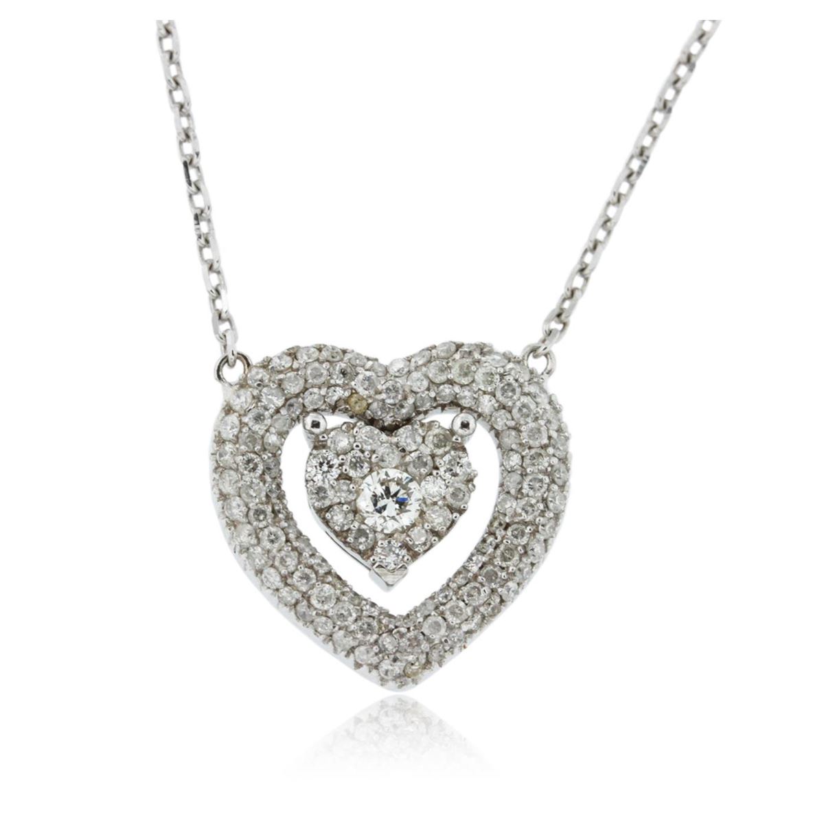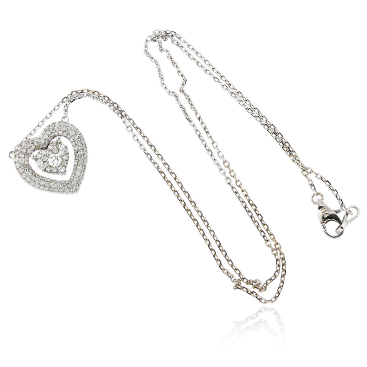 One electronically tested 14KT white gold ladies cast diamond necklace with a lobster claw clasp with a bright polish finish. Identified with markings of "14K". Condition is new. Containing: One prong set round brilliant cut diamond, measuring 2.80 - 2.80 x 1.68mm (depth est.) approximate weight of 0.08ct. Clarity: SI-1. Color: J, Cut is Good. One Hundred Twenty-Eight prong set round brilliant cut diamonds, measuring 1.00 - 1.00 x 0.60mm (depth est.) approximate total weight of 128 Stones = 0.46ct. Clarity: I-1 to I-2. Color: I, Cut is Good. All diamonds are graded in the mounting, unless otherwise stated. Total Weight of Diamonds 0.54ct. Total Weight of Necklace 5.40 grams. GGL Appraised at $3,685.00.