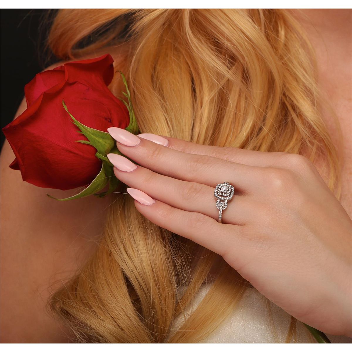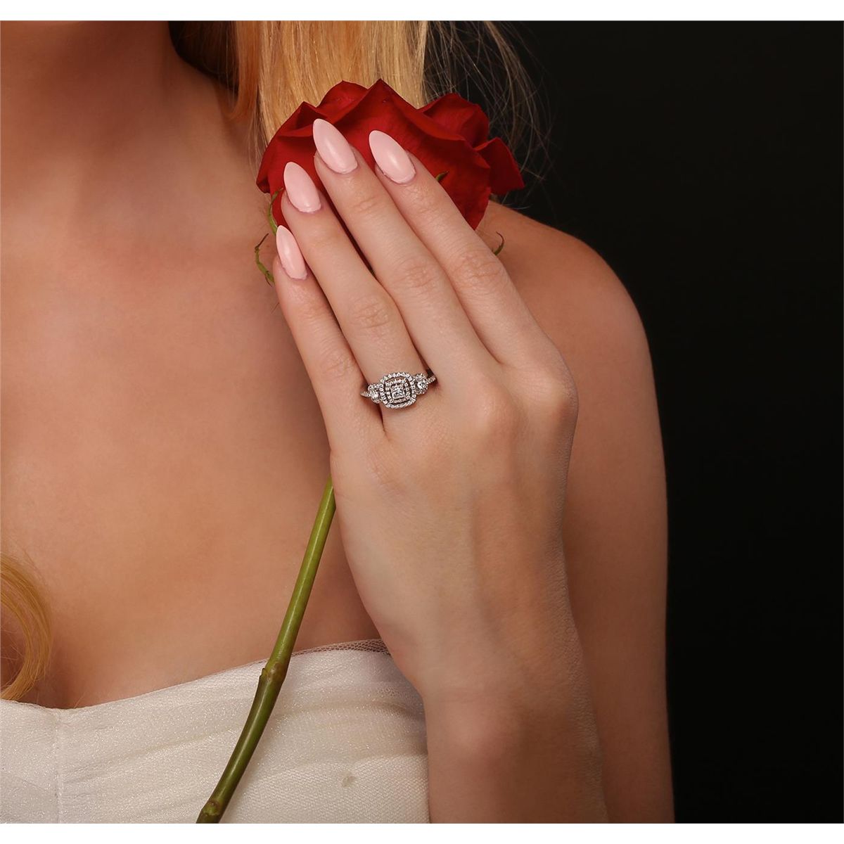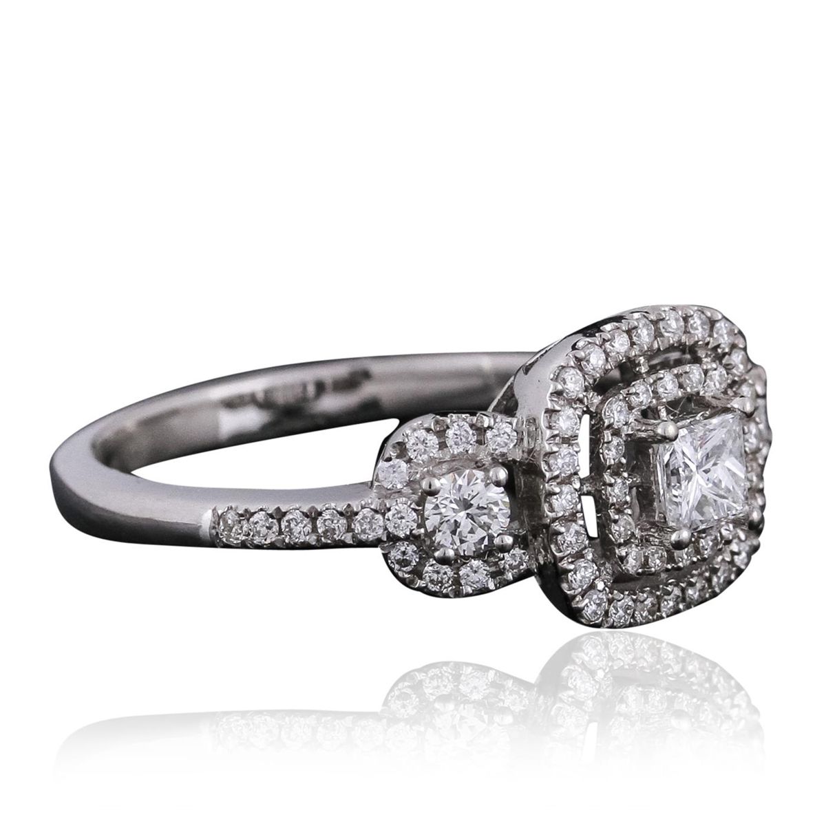 One electronically tested 14KT white gold ladies combination cast & assembled engagement ring with a bright polish finish. Identified with markings of "14K". Condition is new. Containing: One prong set princess cut diamond, measuring 3.10 x 3.10 x 2.33mm (depth est.) approximate weight of 0.18ct. Clarity: VS-2. Color: H, Cut is Good. Two prong set round brilliant cut diamonds, measuring 2.50 - 2.50 x 1.50mm (depth est.) approximate total weight of 2 Stones = 0.11ct. Clarity: SI-1. Color: J, Cut is Good. Sixty-Seven prong set round brilliant cut diamonds, measuring 1.00 - 1.00 x 0.60mm (depth est.) approximate total weight of 67 Stones = 0.24ct. Clarity: I-1 to I-2. Color: I - J, Cut is Good. All diamonds are graded in the mounting, unless otherwise stated. Total Weight of Diamonds 0.54ct. Total Weight of Ring 3.40 grams. GGL Appraised at $3,670.00.