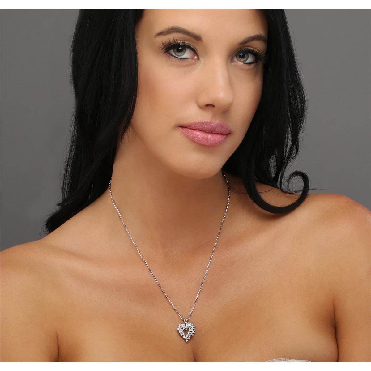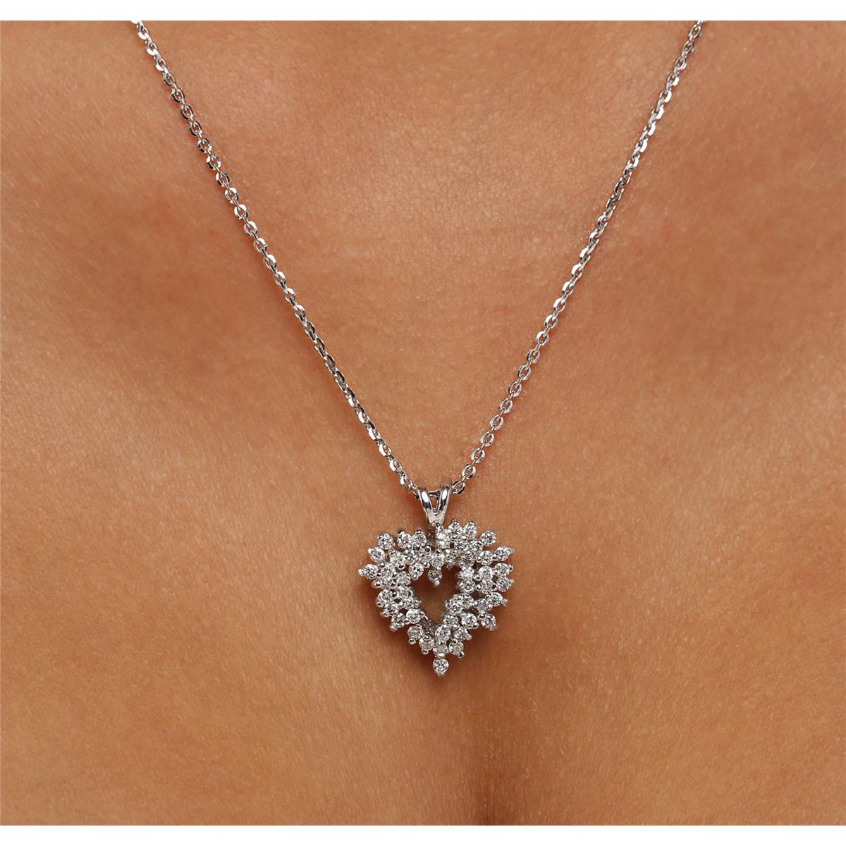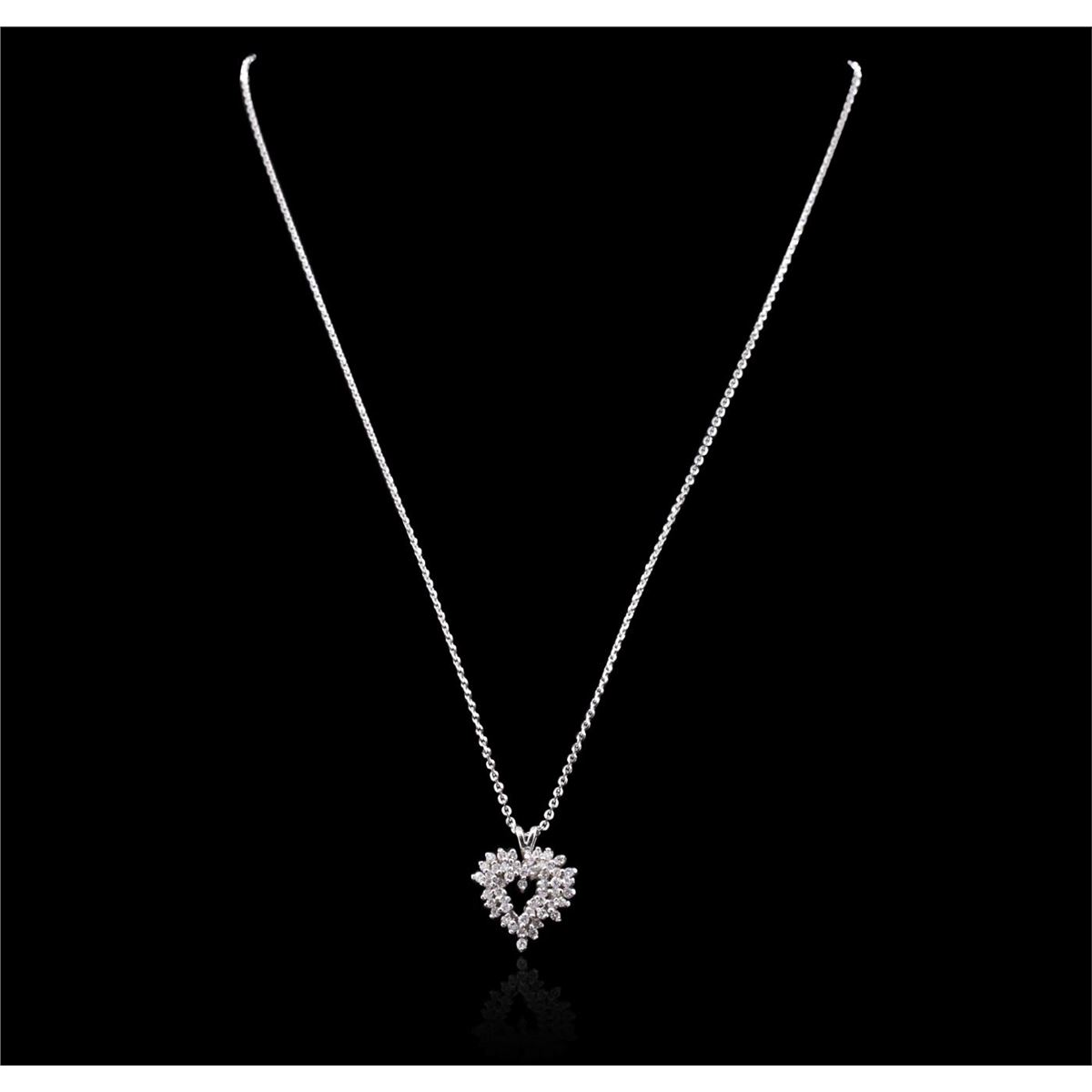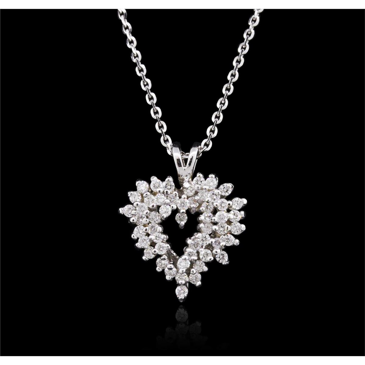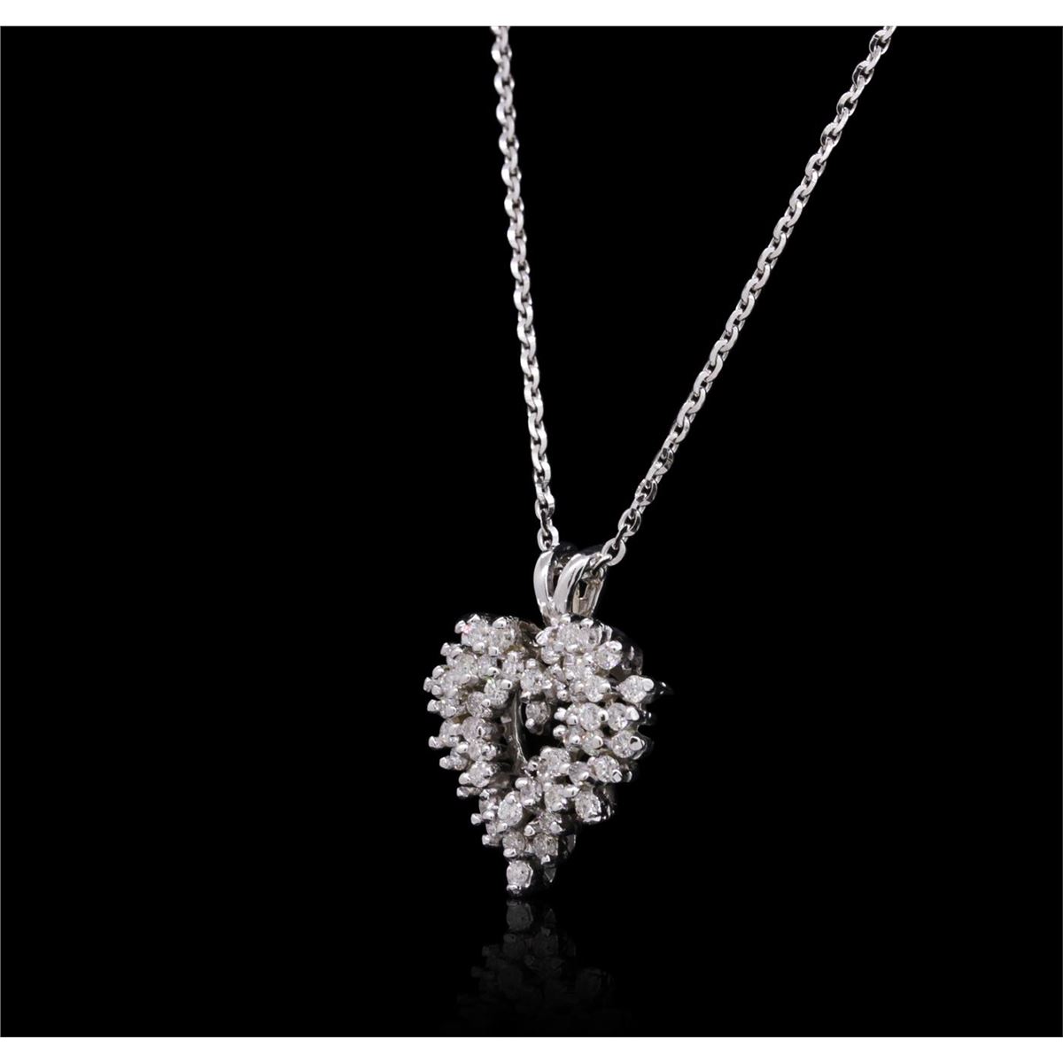 One electronically tested 14KT white gold ladies combination cast & assembled diamond pendant & chain 18.0" long, cable link with a lobster claw clasp with a bright polish finish. Identified with markings of "14K". Condition is new. Containing: Forty-Five prong set round brilliant cut diamonds, measuring 1.50 - 1.50 x 0.90mm (depth est.) approximate total weight of 45 Stones = 0.55ct. Clarity: I-1 to I-2. Color: I - J, Cut is Good. All diamonds are graded in the mounting, unless otherwise stated. Total Weight of Diamonds 0.55ct. Total Weight of Pendant & Chain 6.10 grams. GGL Appraised at $3,295.00.