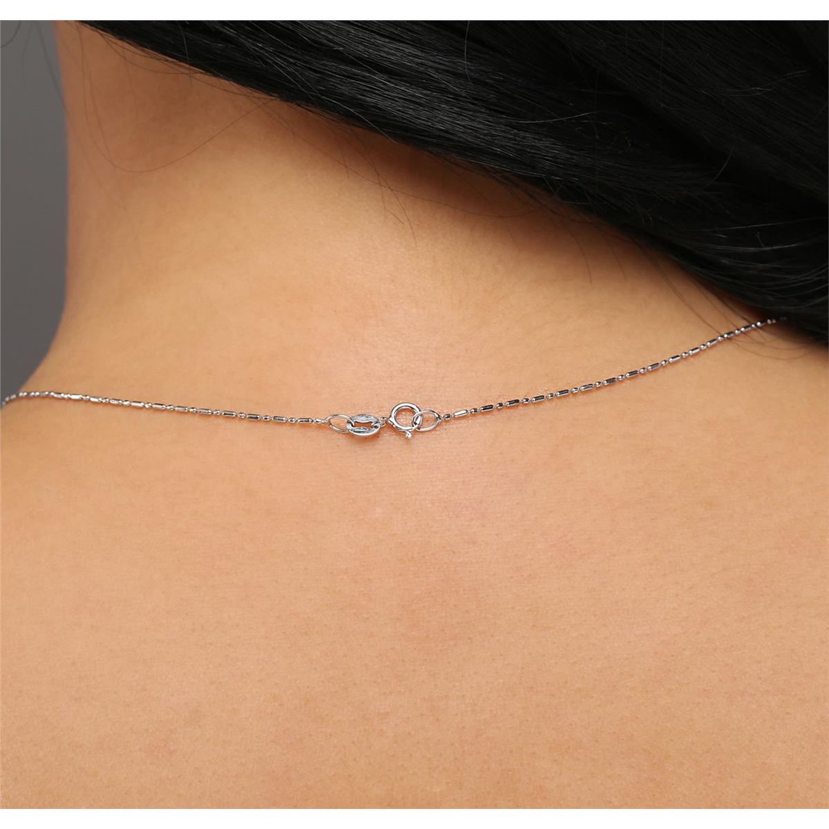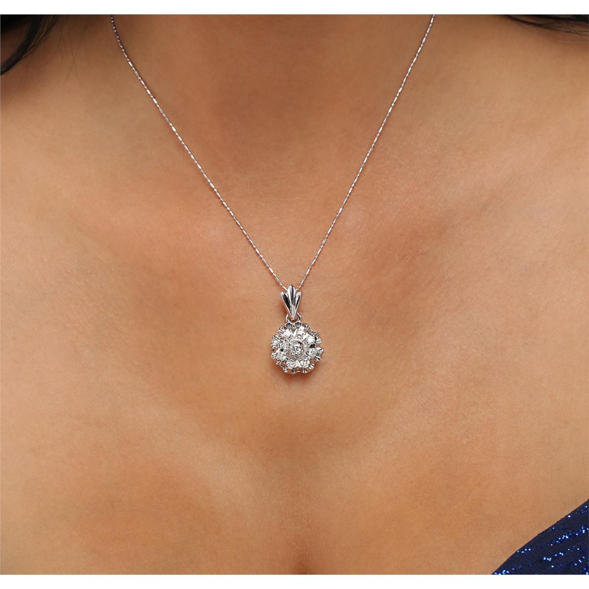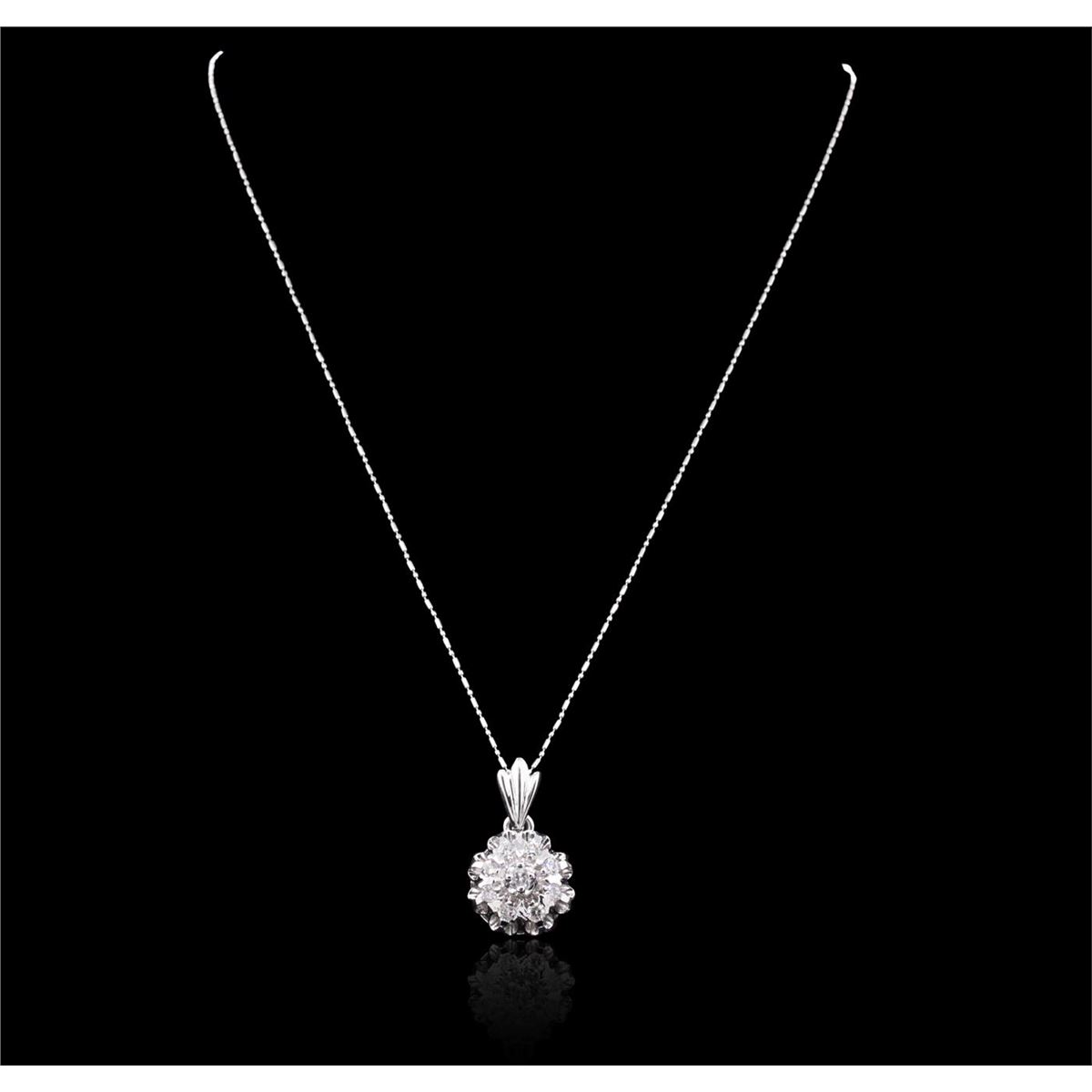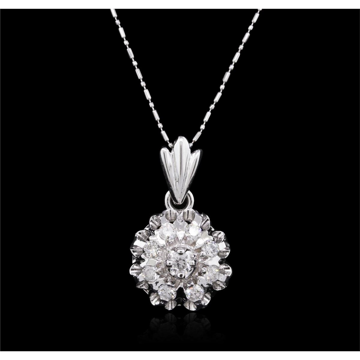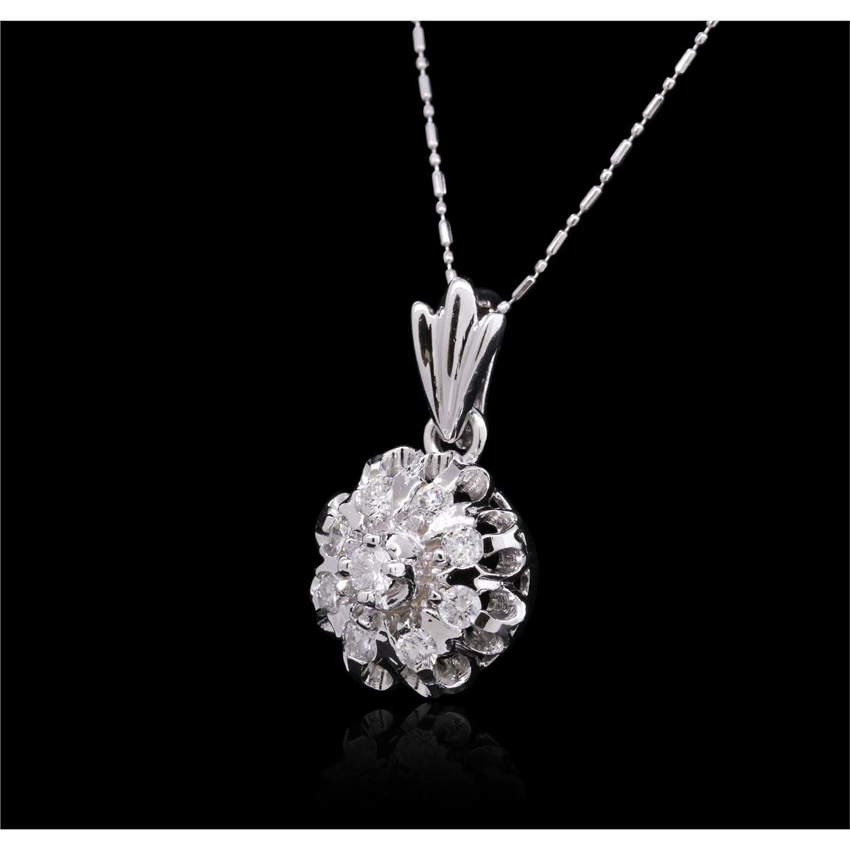 One electronically tested 14KT white gold ladies cast diamond pendant & chain 16.0" long, fancy link with a lobster claw clasp with a bright polish finish. Identified with markings of "14K". Condition is new. Containing: Nine prong set round brilliant cut diamonds, measuring 3.00 - 2.50 x 1.65mm (depth est.) approximate total weight of 9 Stones = 0.55ct. Clarity: SI-2 to I-1. Color: I - J, Cut is Good. All diamonds are graded in the mounting, unless otherwise stated. Total Weight of Diamonds 0.55ct. Total Weight of Pendant & Chain 6.60 grams. GGL Appraised at $3,595.00.
