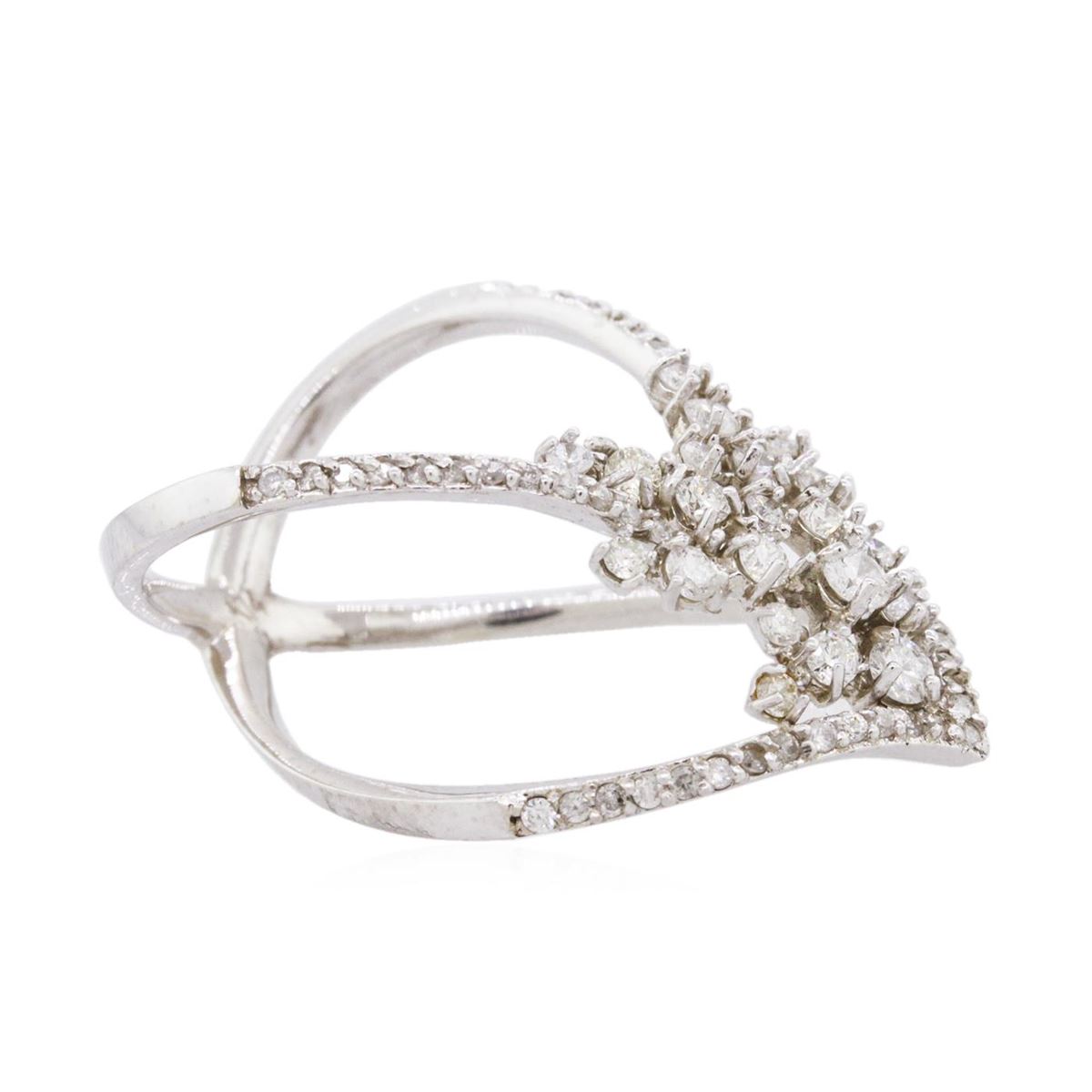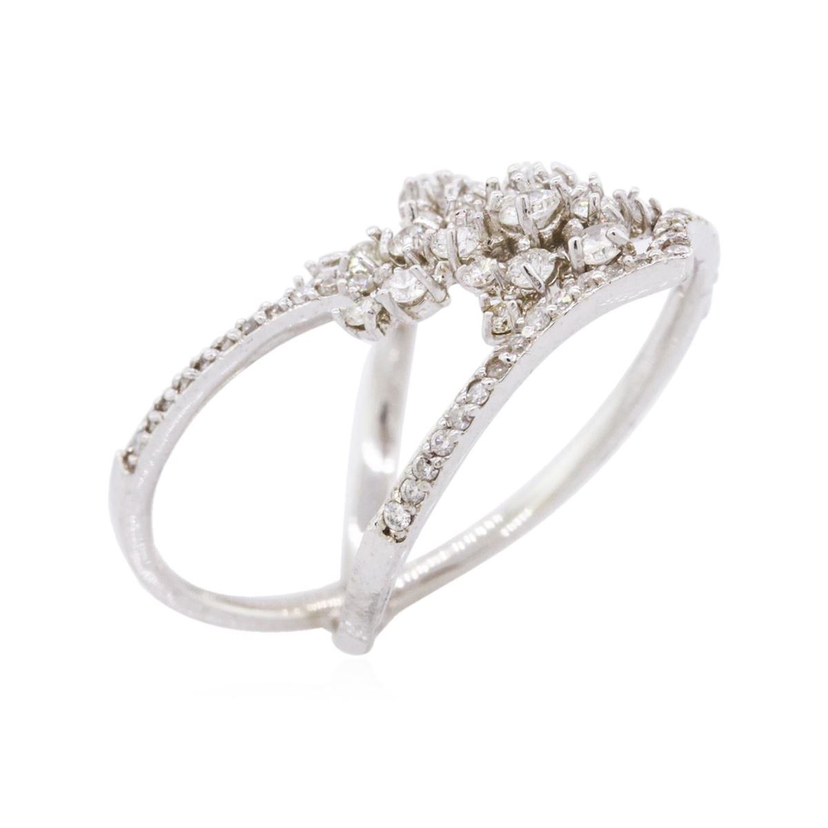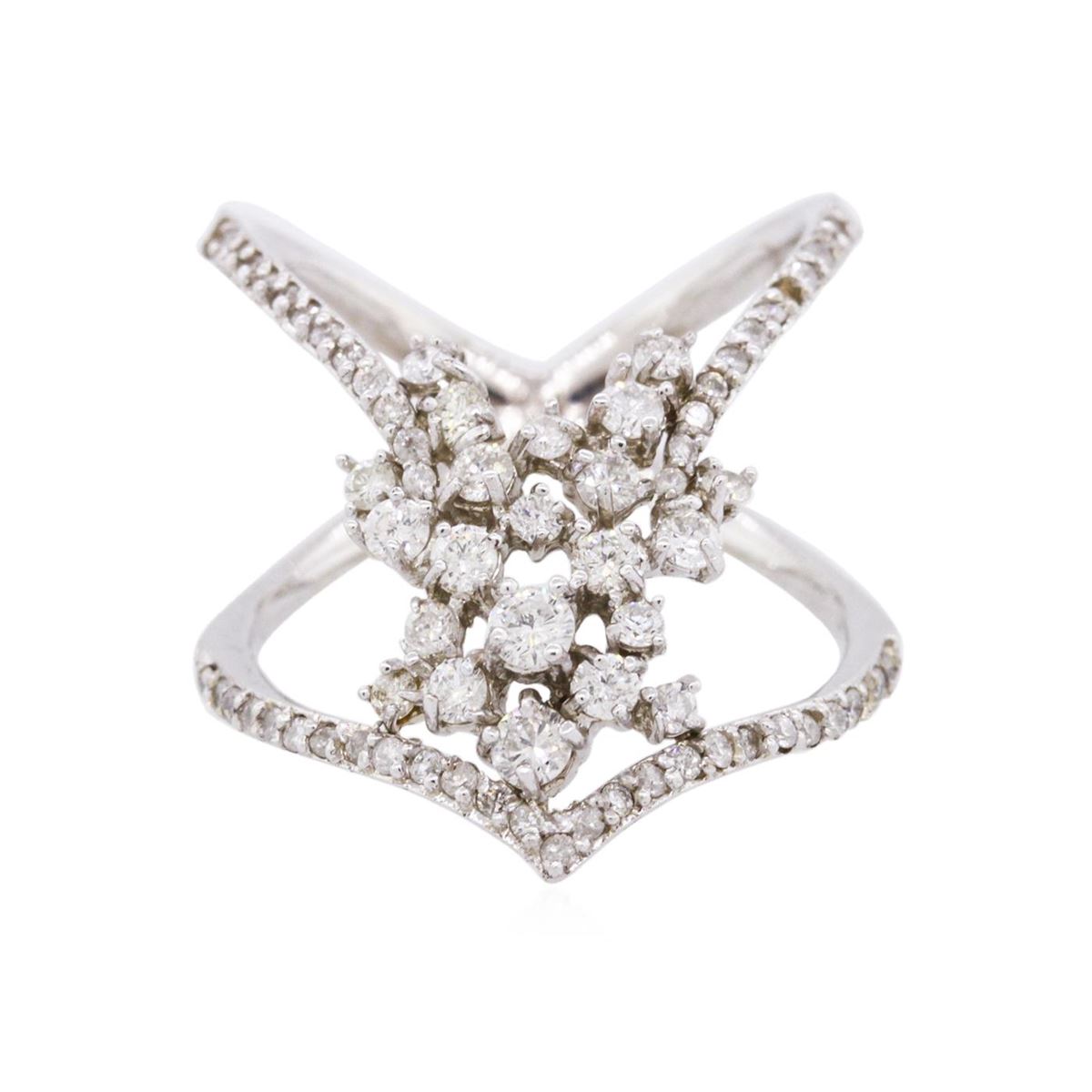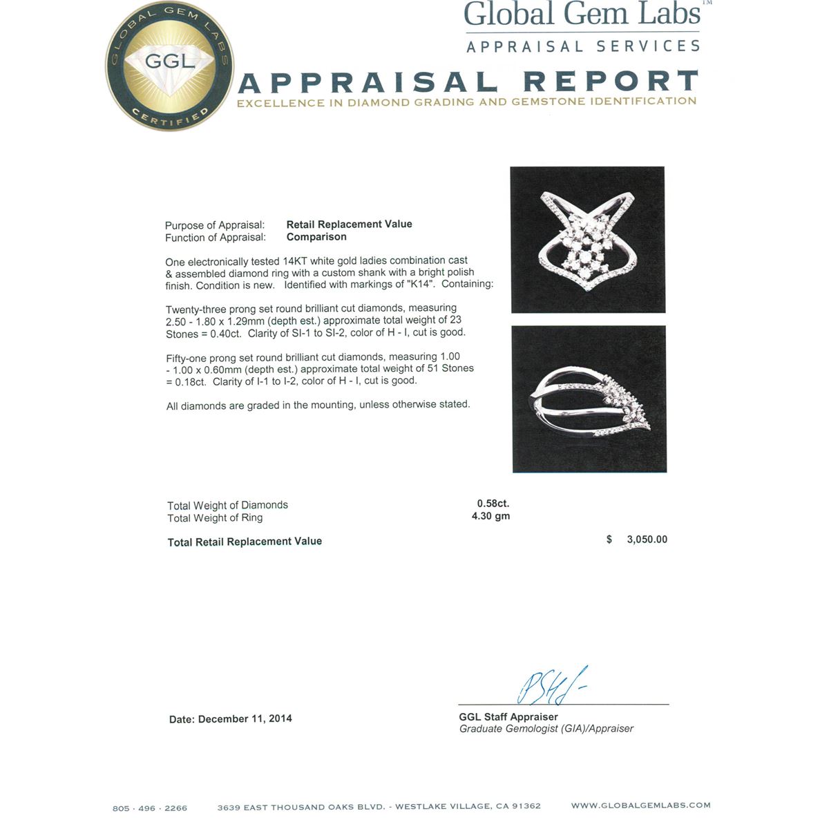 One electronically tested 14KT white gold ladies combination cast & assembled diamond ring with a custom shank with a bright polish finish. Identified with markings of "K14". Condition is new. Containing: Twenty-Three prong set round brilliant cut diamonds, measuring 2.50 - 1.80 x 1.29mm (depth est.) approximate total weight of 23 Stones = 0.40ct. Clarity: SI-1 to SI-2. Color: H - I, Cut is Good. Fifty-One prong set round brilliant cut diamonds, measuring 1.00 - 1.00 x 0.60mm (depth est.) approximate total weight of 51 Stones = 0.18ct. Clarity: I-1 to I-2. Color: H - I, Cut is Good. All diamonds are graded in the mounting, unless otherwise stated. Total Weight of Diamonds 0.58ct. Total Weight of Ring 4.30 grams. GGL Appraised at $3,050.00.