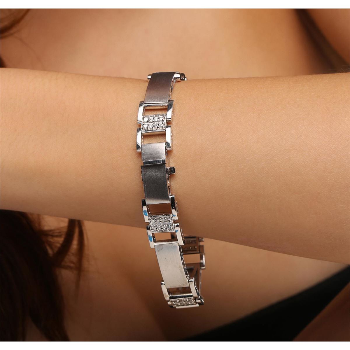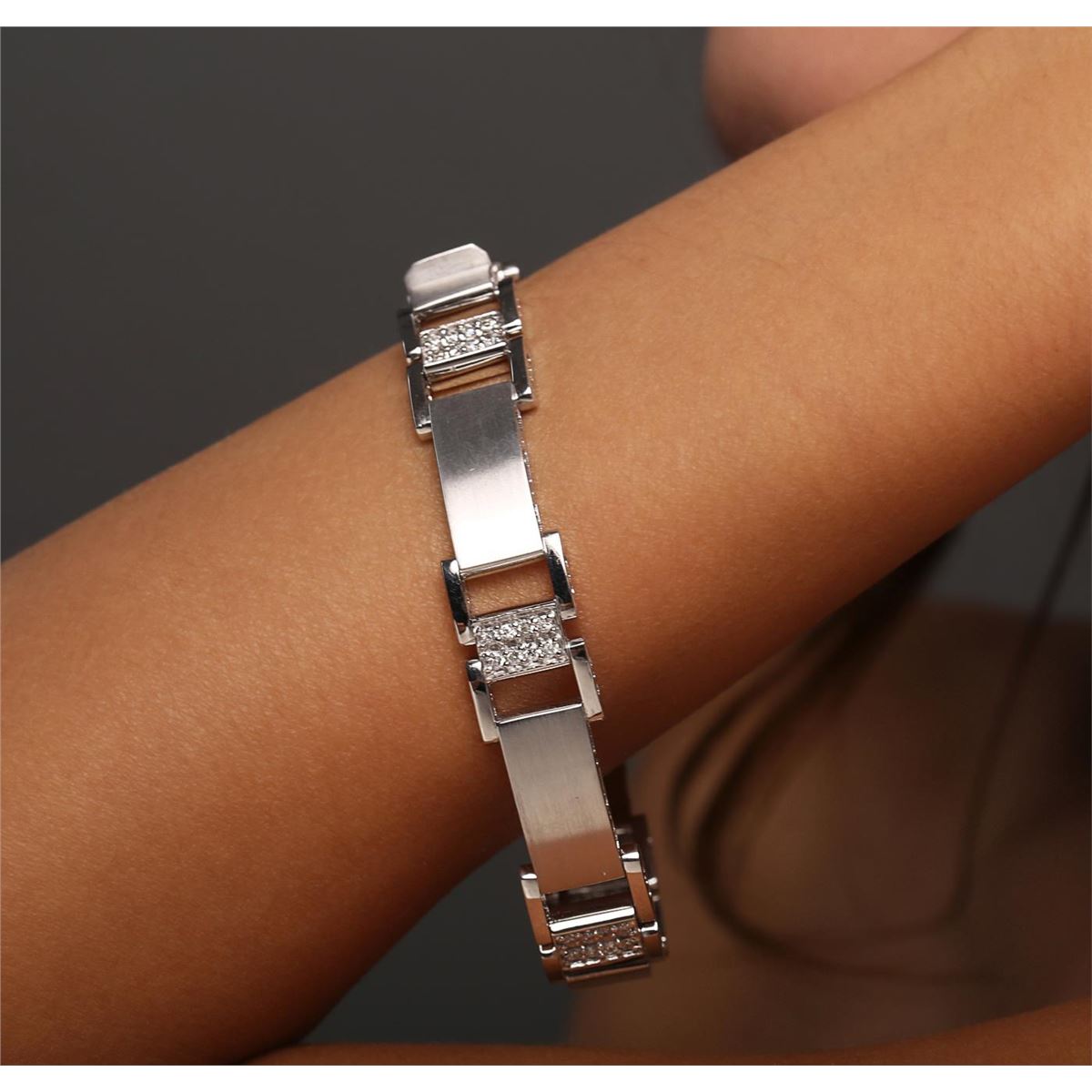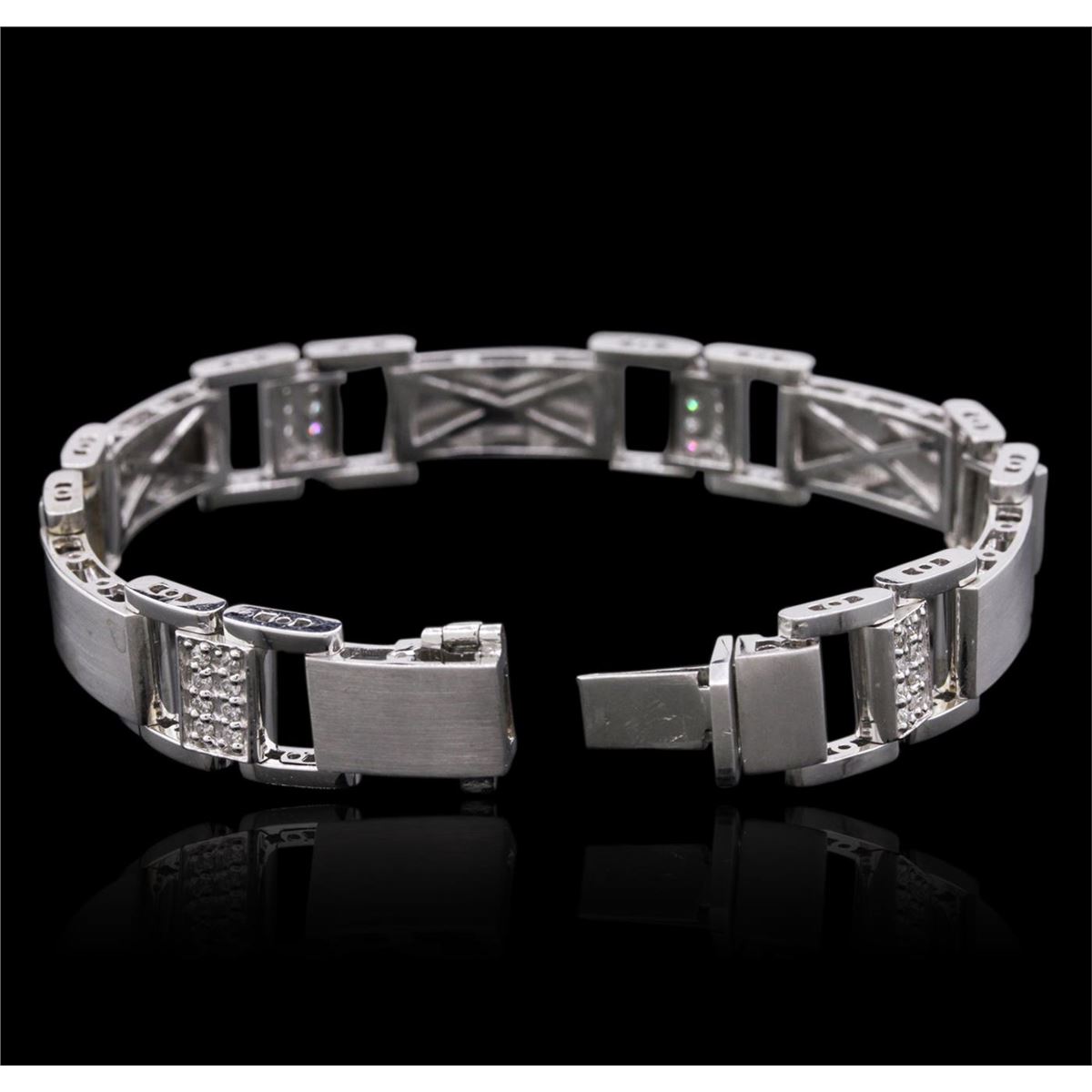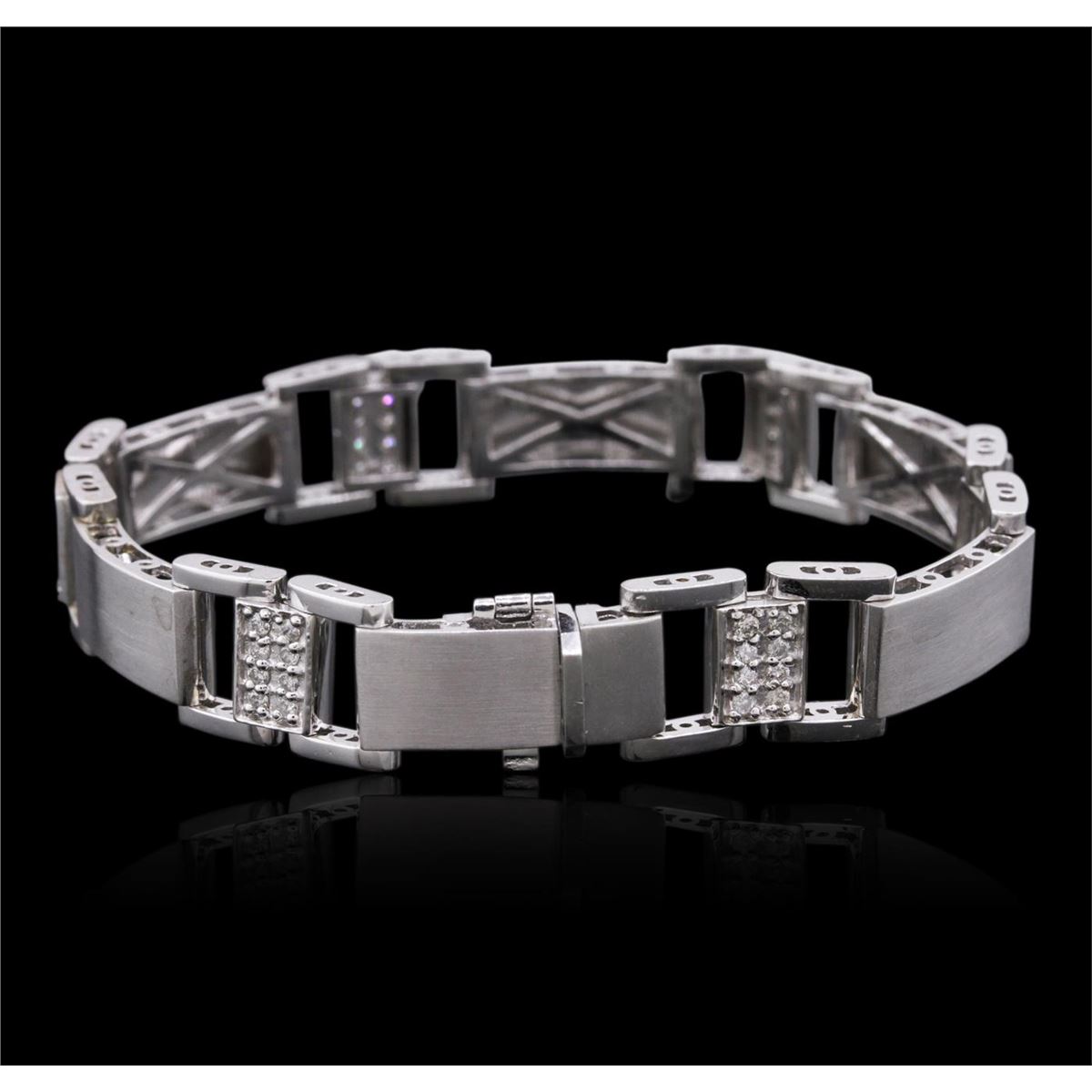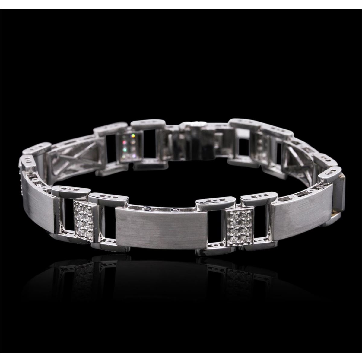 One electronically tested 14KT white gold mens combination cast & assembled diamond bracelet with a foldover clasp with a brushed finish. Measurements: 8.25" in length. Identified with markings of "14K". Condition is new. Containing: Forty-Eight prong set round brilliant cut diamonds, measuring 1.50 - 1.50 x 0.90mm (depth est.) approximate total weight of 48 Stones = 0.59ct. Clarity: SI-1 to I-1. Color: I - J, Cut is Good. All diamonds are graded in the mounting, unless otherwise stated. Total Weight of Diamonds 0.59ct. Total Weight of Bracelet 41.10 grams. GGL Appraised at $12,040.00.