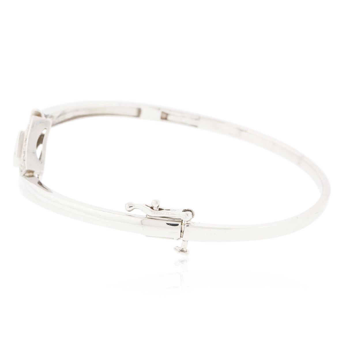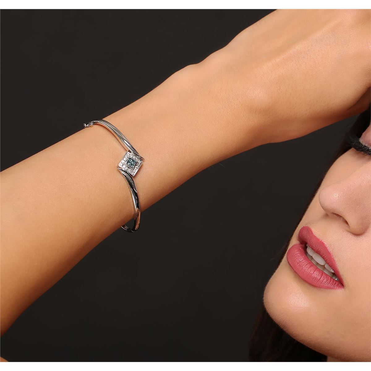 One electronically tested 14KT white gold ladies cast & assembled diamond bangle bracelet. Condition is good. Six and one-half inch length hinged bangle bracelet features a diamond set bezel, terminating in a concealed clasp with safety. Bright polish finish with milgrain detailing. Identified with markings of "14K". Containing: Four invisible set princess cut diamonds, measuring 2.00 x 2.00 x 1.50mm (depth est.) approximate total weight of 4 Stones = 0.23ct. Indications of laboratory irradiated enhanced color. Graded in the setting. Clarity SI-1 to SI-2. Color Fancy Very Slightly Greenish Blue. Sixteen bead set round brilliant cut diamonds, measuring 1.70 - 1.60 x 0.99mm (depth est.) approximate total weight of 16 Stones = 0.36ct. Graded in the setting. Clarity I-1 to I-2. Color H - J. Total Weight of Diamonds 0.59ct. Total Weight of Bangle Bracelet 10.90gm. AIG Appraised at $3,435.00.